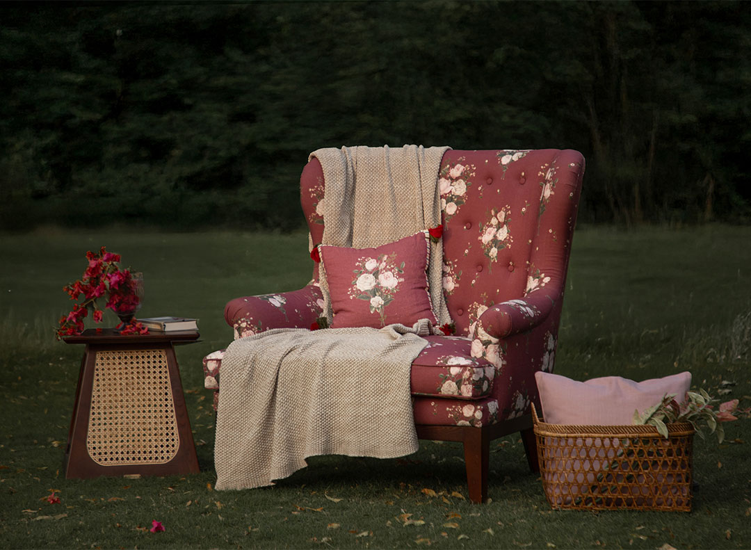 Placed amidst a lush green landscape, the Wing Chair variation Loveseat transforms into a sculptural focal point. Its structured back and graceful arms stand in striking contrast to the softness of leaves and the wild movement of nature. A deep red loveseat against layers of green feels bold and cinematic — like a single rose blooming in a garden. The richness of red intensifies when framed by foliage; it appears deeper, more velvety, almost glowing in daylight. Alternatively, an ivory or white loveseat feels ethereal, as though it belongs to the light itself, floating gently within the greenery.