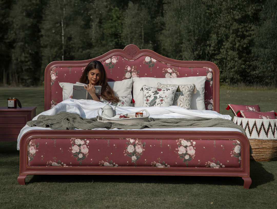 Lush surroundings amplify red in the most flattering way. Against leaves and grass, red does not overwhelm — it harmonises. It feels vibrant but grounded. White, meanwhile, becomes luminous, almost radiant under natural light. Together, red and white gain new depth when paired with green. The palette feels fresh rather than traditional, romantic yet alive. A white bed layered with a red throw against a backdrop of trees feels storybook-like. A vase filled with soft blooms placed beside the loveseat feels intentional without excess.