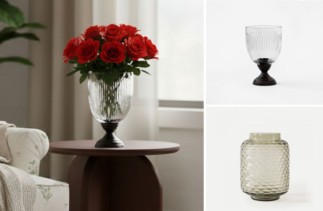 A sculptural rattan vase adds softness and form, grounding the arrangement with quiet elegance. Glass vases, on the other hand, bring transparency and light. They catch reflections, magnify stems, and allow the natural beauty of the flowers to take centre stage.