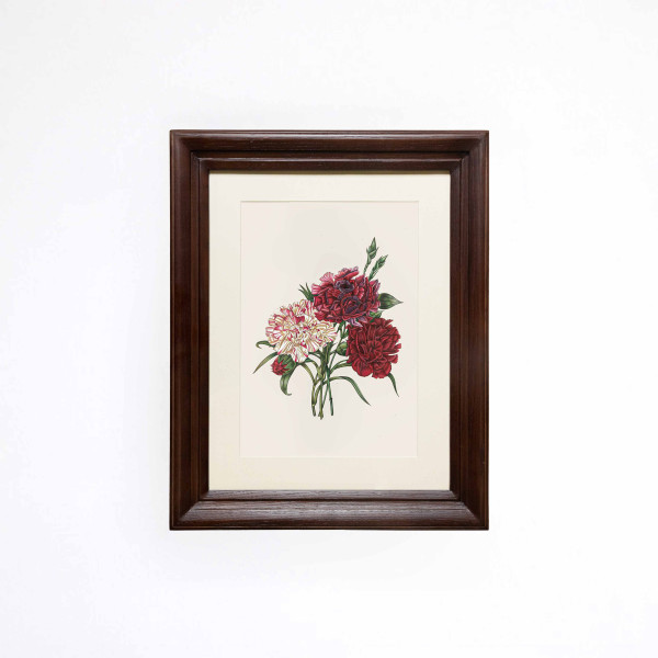 A vibrant floral portrait, A Symphony of Carnation Printed Artwork captures the ruffled, multi-layered elegance of several carnation blooms in rich, varied tones. Originally hand-painted, the artwork features a trio of striped Carnation flowers in different colors—one in a striking cream and pink stripe, another in a deep magenta-purple, and a third in a classic solid crimson. The composition is filled with slender green stems and tight, pointed buds that reach upward, highlighting the natural life cycle of the plant. This artwork is printed on a sturdy, antique-style sheet, keeping the natural texture and feel of the original painting. Every fine detail, from the delicate fringed edges of the petals to the subtle color gradients within each bloom, is captured with clean precision. Finished in a classic wooden frame, the piece has the look and feel of a vintage botanical find. It adds a sophisticated pop of color and a timeless, romantic touch to a traditional dining room, a vanity area, or a curated gallery wall.