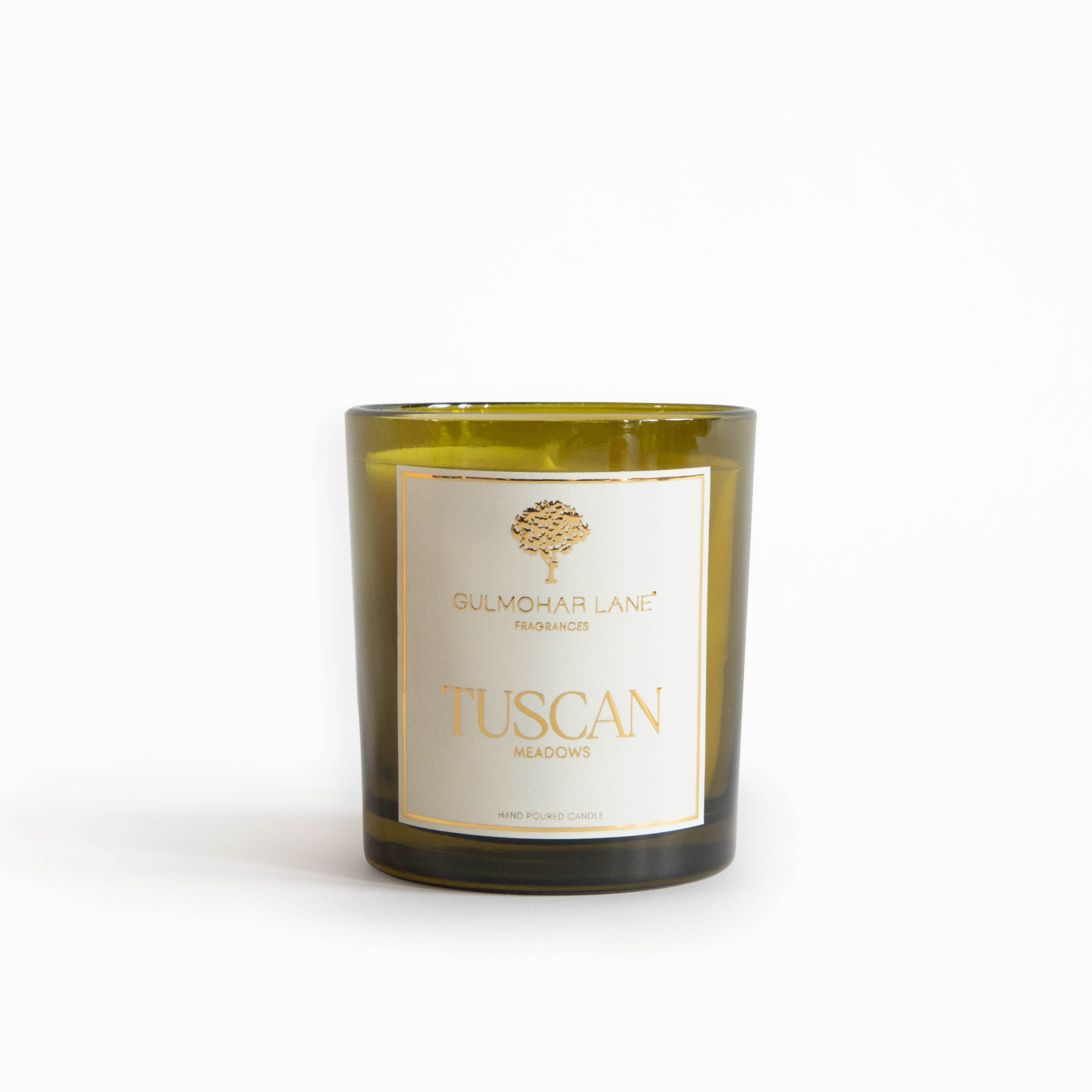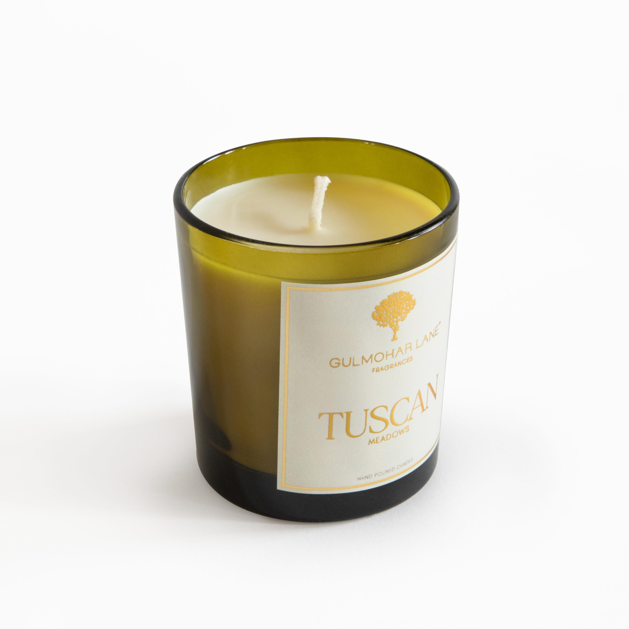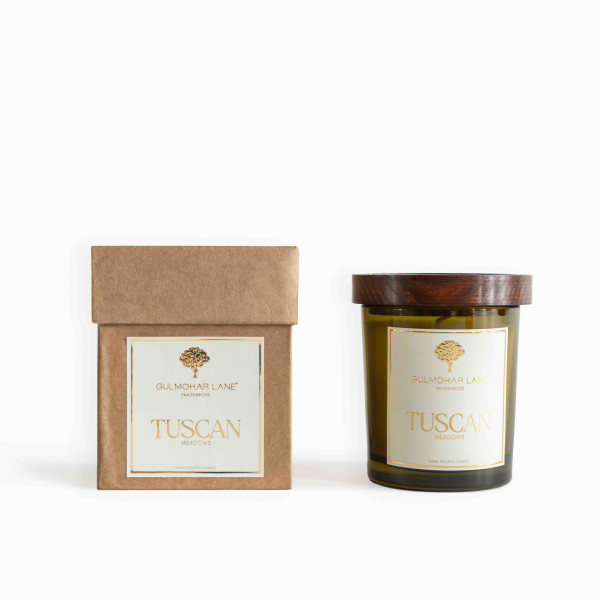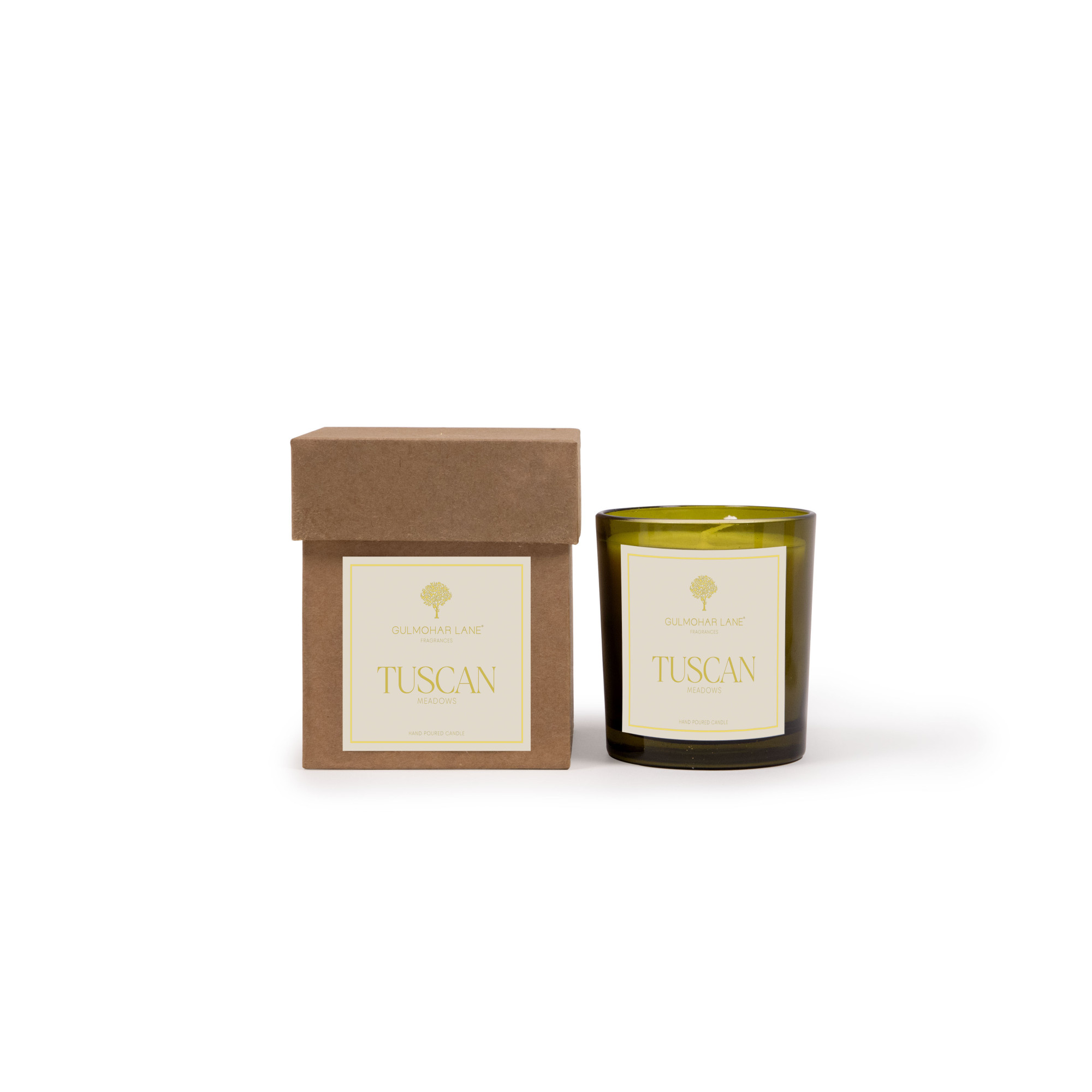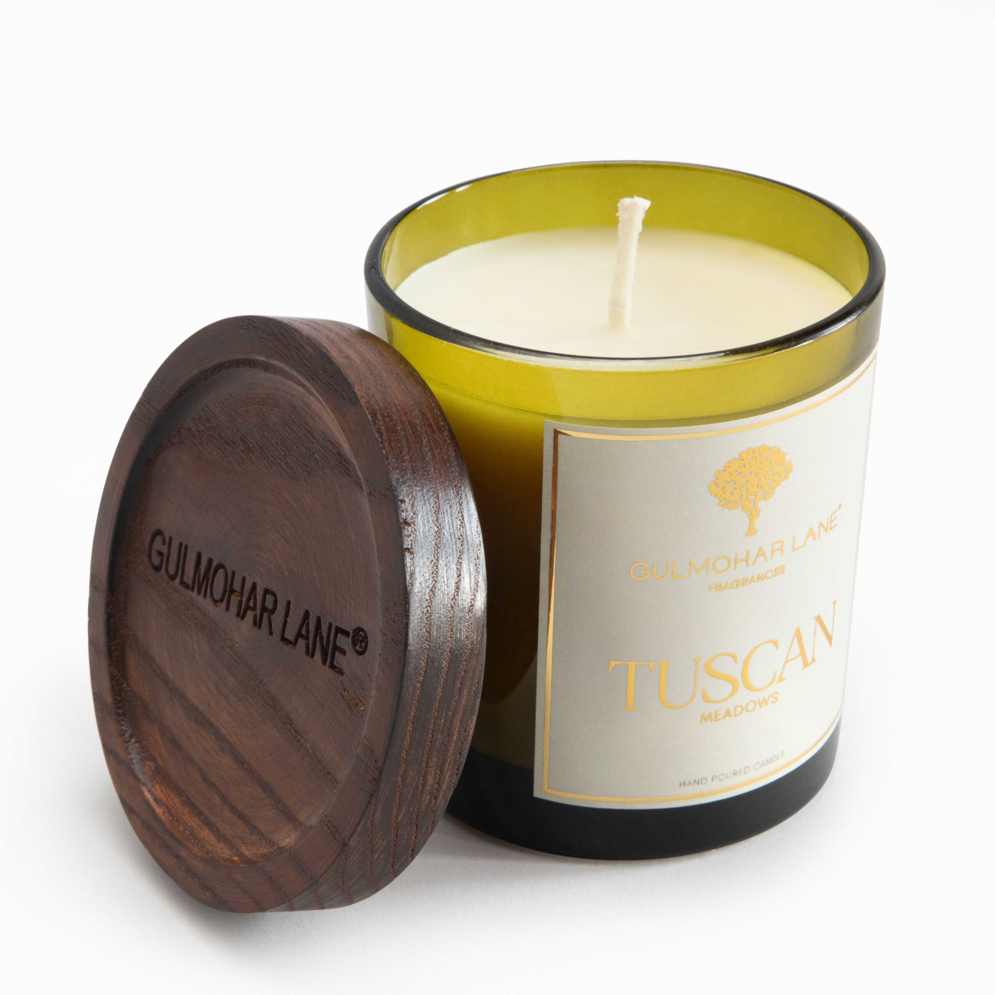The rich olive green glass of this jar, reminiscent of the ancient groves on sun-drenched hillsides, holds the hand-poured wax and is finished with a grounded solid wooden lid. The fragrance evokes the moment the Tuscan hills awaken under a gentle sun, where orchards burst with the zest of ripe citrus and meadows sway with the delicate perfume of peonies. Bright, tangy notes dance like laughter in the open air, softened by the velvety sweetness of blossoms unfurling in full bloom. Together, citrus and peonies paint a fragrance that is both lively and tender, the sparkle of fresh fruit carried on the breeze, mingling with the softness of petals kissed by summer. Tuscan Meadows is a living canvas of fields, light, and pure joy, perfect for uplifting the atmosphere of a kitchen or sunlit living room.
