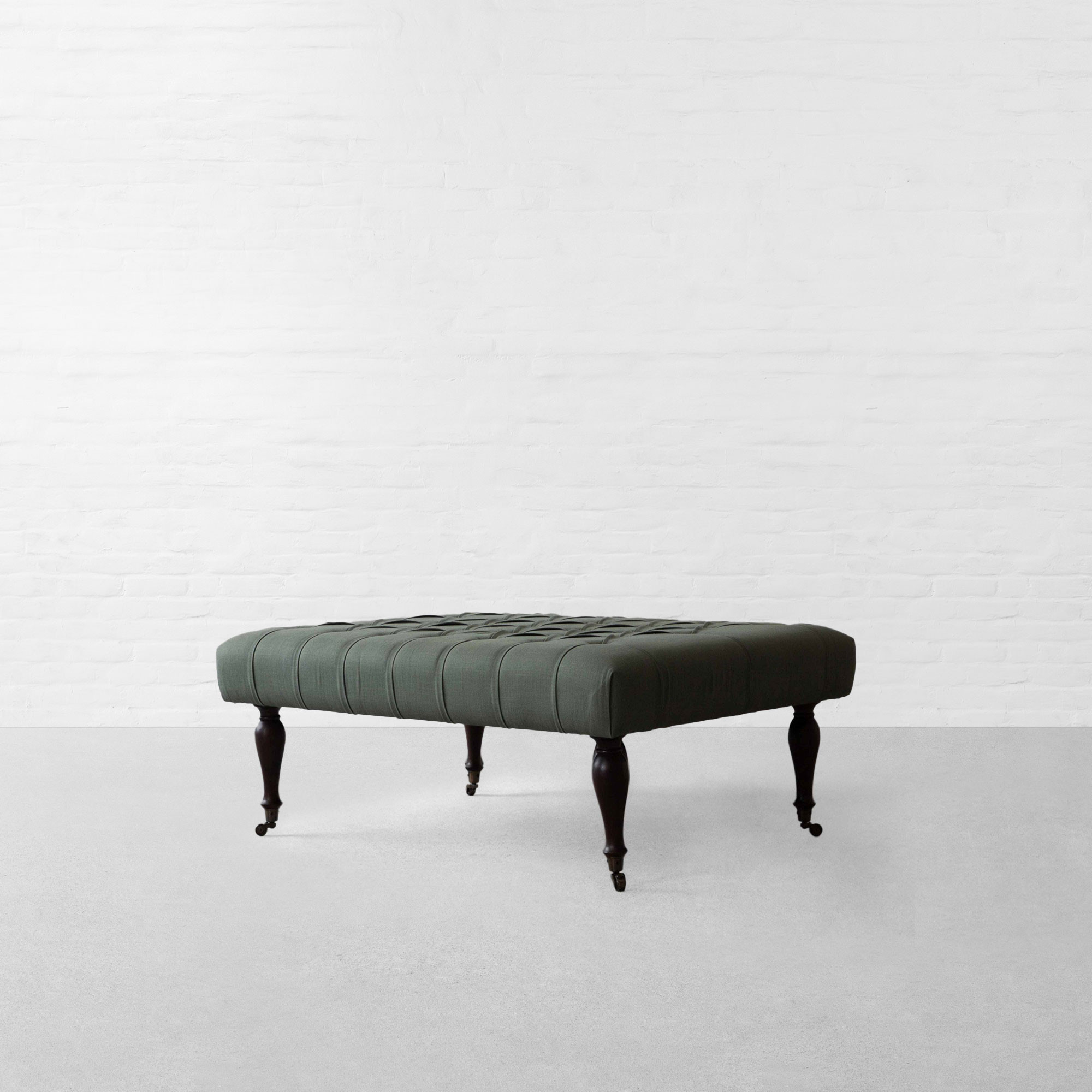Multipurpose upholstered bench built with the refinement of its Edwardian inspiration. Tightly tufted at top, it offers steady and stable space for a tray of drinks, stack of books and your feet, and can be used for comfortable, impromptu seating.