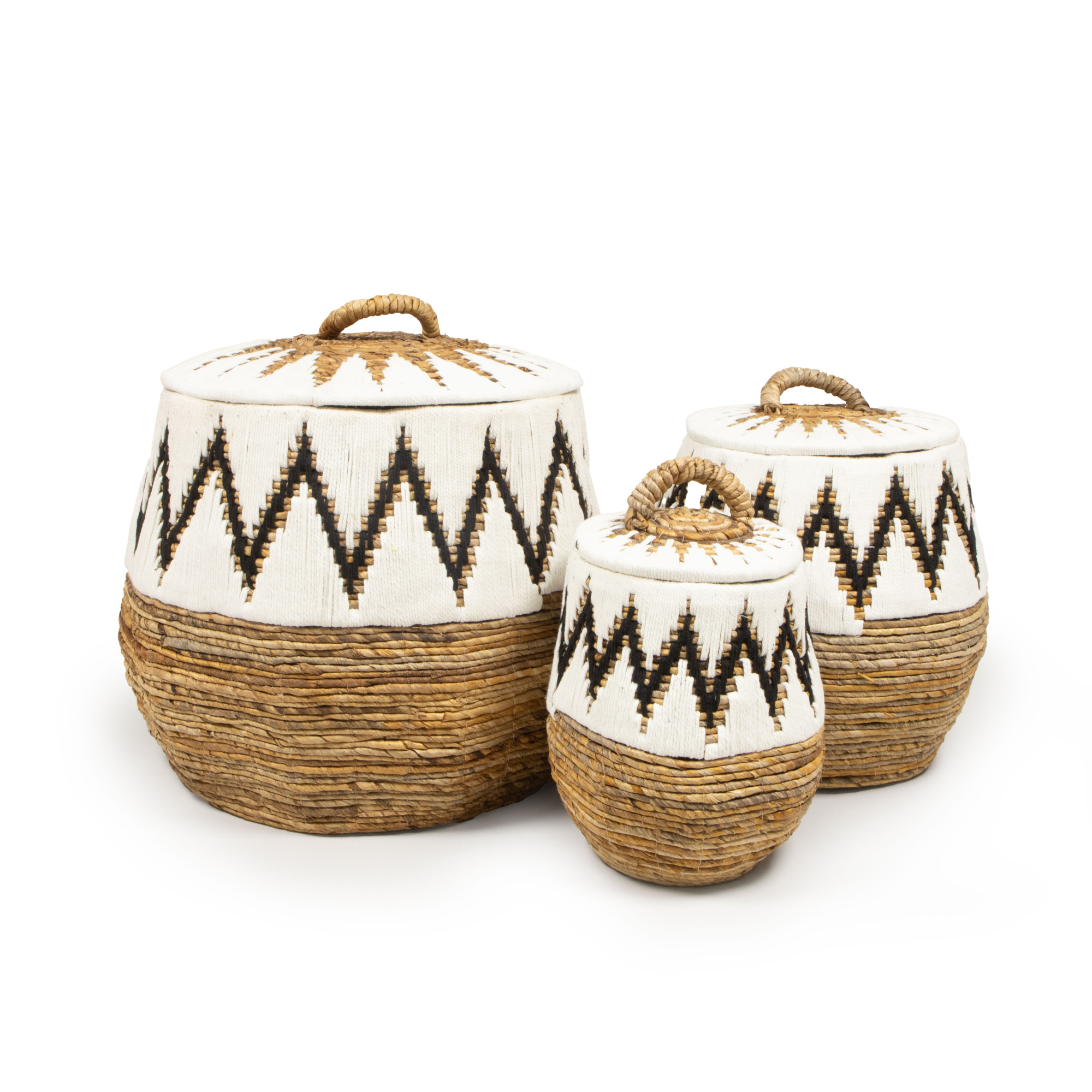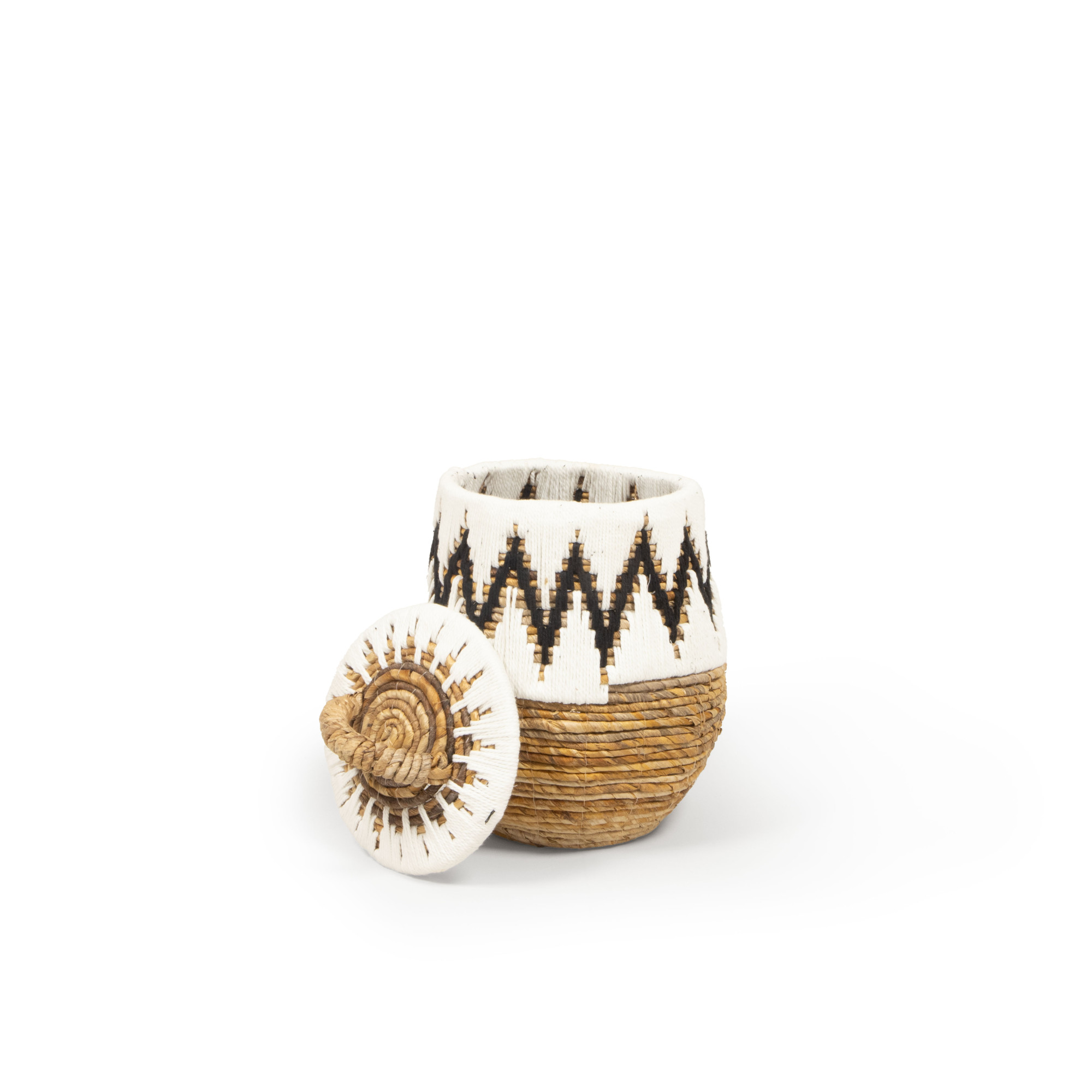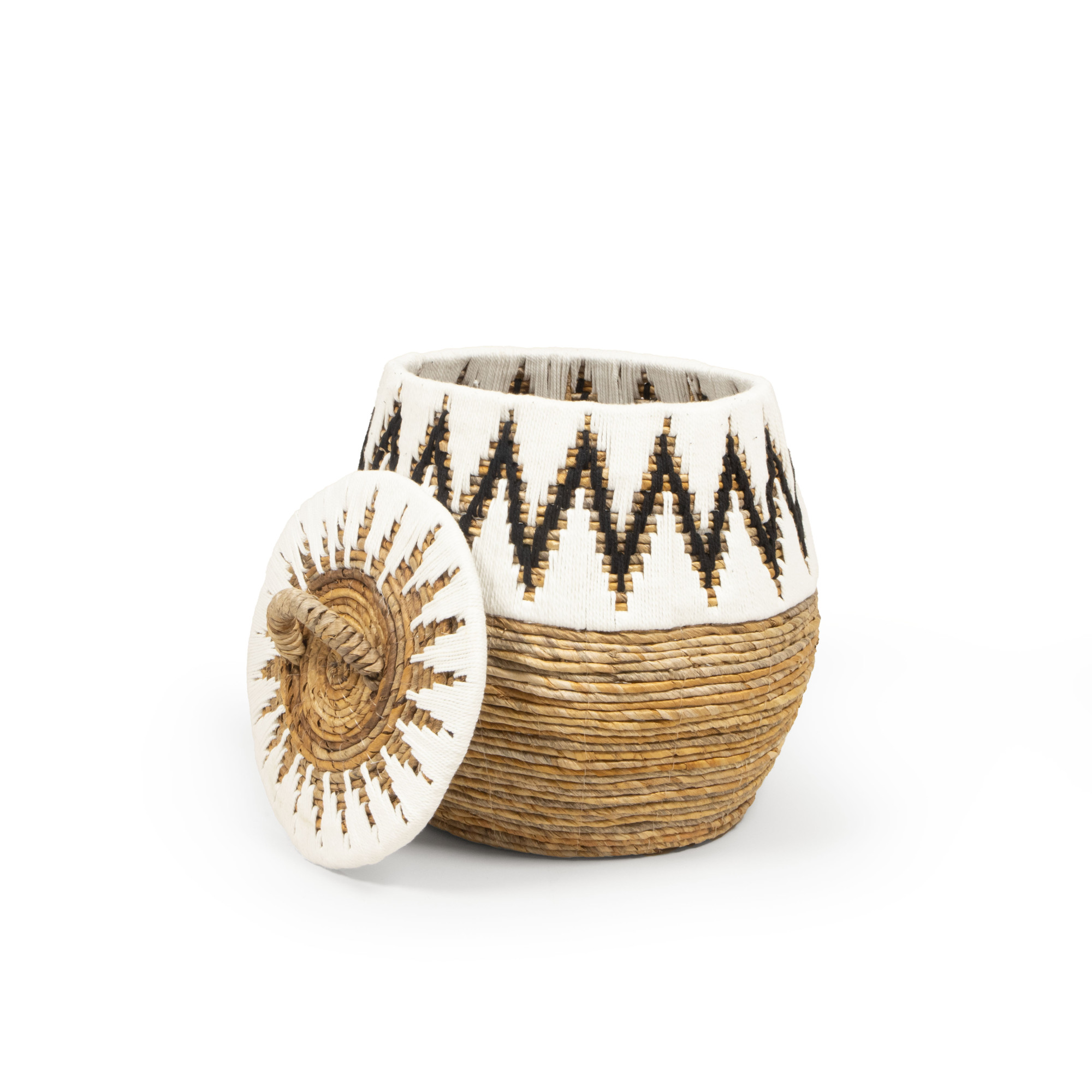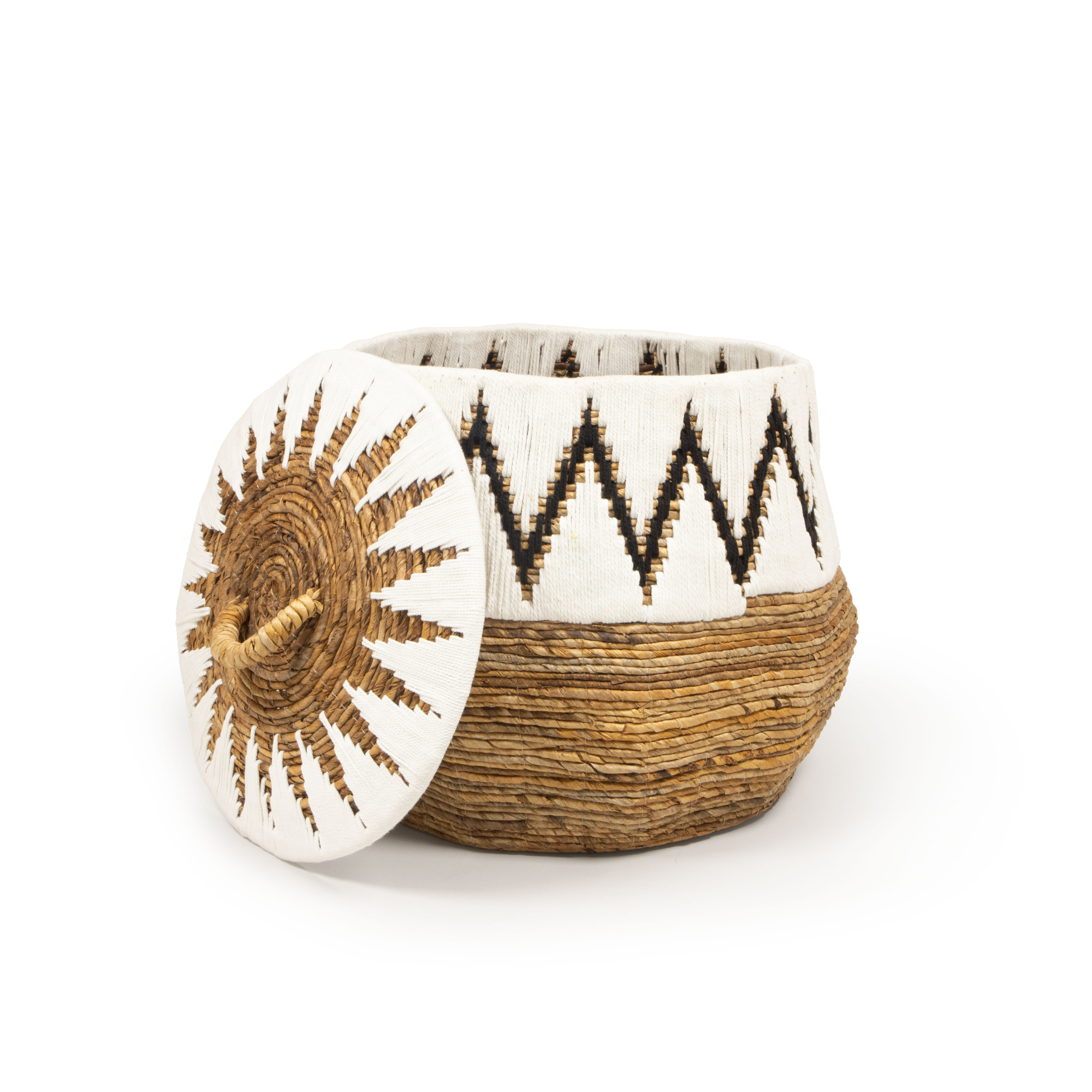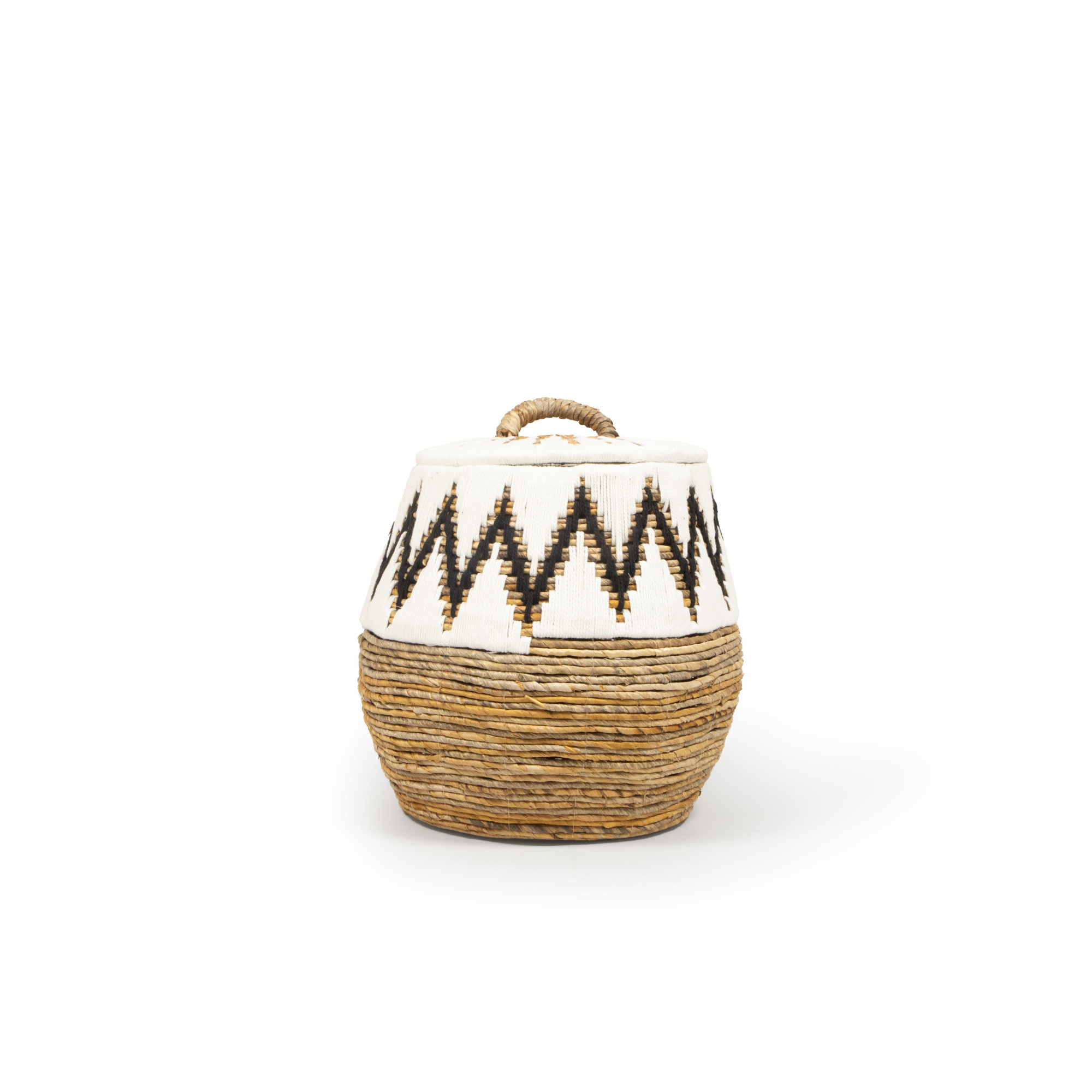 Evoking the timeless artistry of traditional weaving, our Angkor Handwoven Seagrass Basket is a true ode to craftsmanship. Each basket is meticulously handwoven by skilled artisans using age-old techniques passed down through generations. Natural seagrass intertwined with white and black macrame to create striking zigzag and sunburst patterns that celebrate contrast and texture. The earthy tones of seagrass merge beautifully with the deep, inky hues of the yarn, bringing a rustic yet refined charm to any space. The snug-fitting lid conceals your treasures within, making it perfect for storing throws, toys, or daily essentials while keeping your space effortlessly tidy. Whether styled in a cozy corner, by your reading nook, or as a statement piece in your living room, the Angkor Basket infuses your home with warmth, texture, and the soulful beauty of handcrafted design.