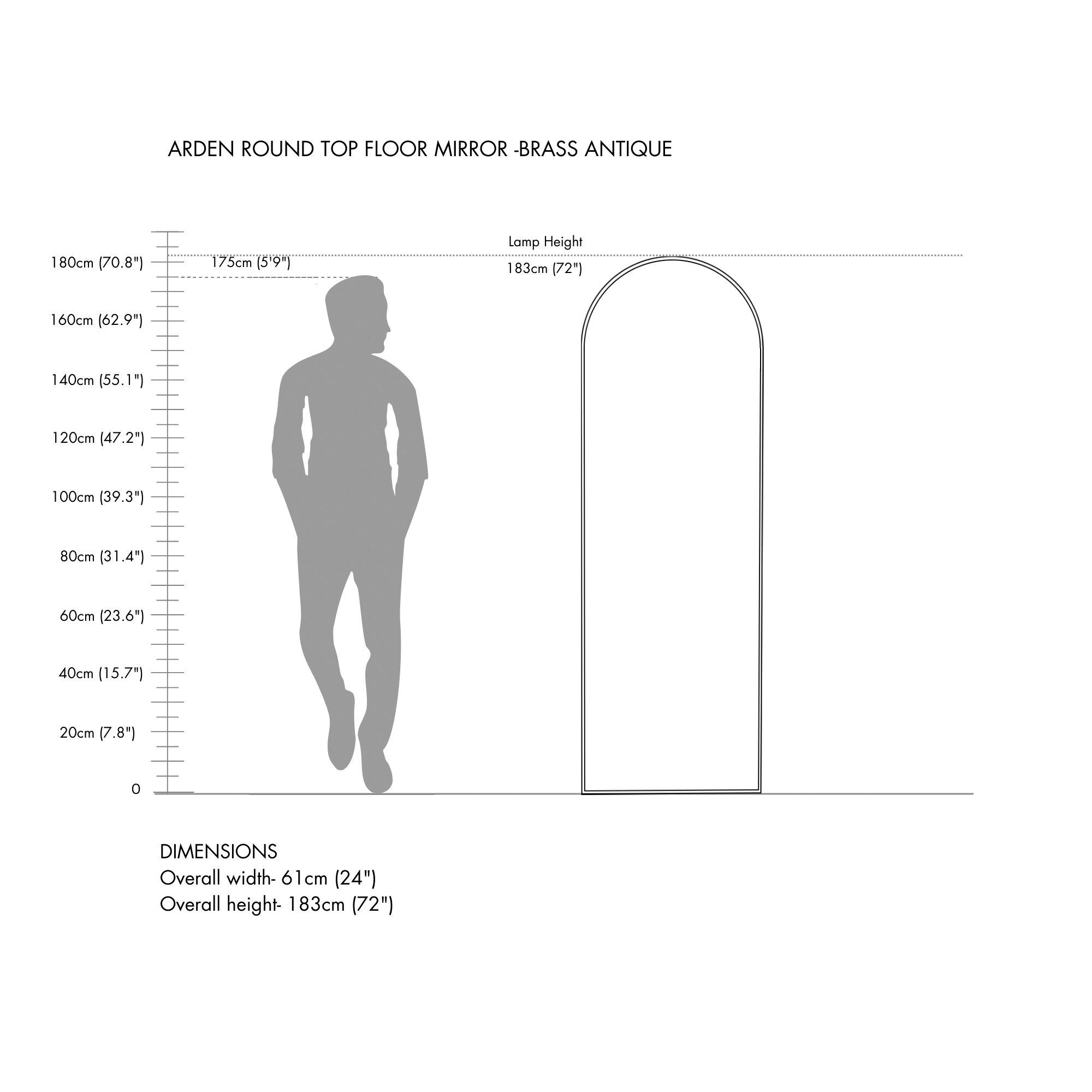 A similarity with mid-century décor with a taste for minimalist orientation and yet offering a fresh appeal, our Arden Mirror collection adorns a bent rimmed edge that adds a Gatsby-glam to spaces while magnifying its affinity with opulence. Seen here is our Arden Round Top Floor Mirror that may adorn your spaces as a floor mirror glamor your living space.