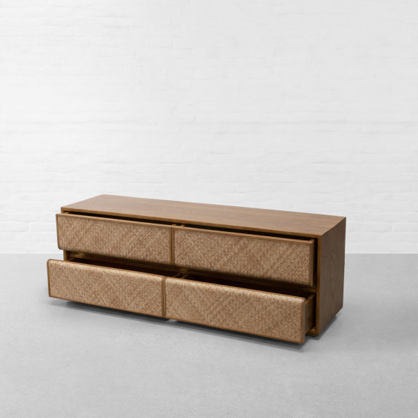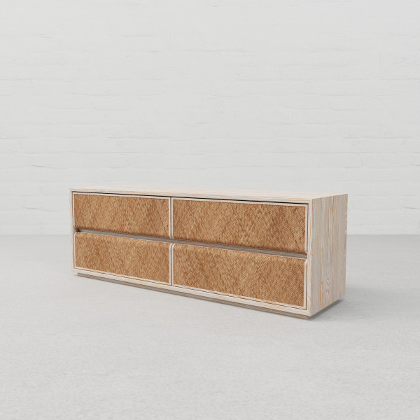 With its stunningly simple and symmetrical facade, our Assagao TV Unit embodies a delightful blend of craftsmanship, style, and function. Infused with the essence of handmade rattan textures and Scandinavian utilitarian design, this exquisite TV unit seamlessly marries rustic charm with modern functionality. Its clean silhouette beautifully complements the delicate raw rattan embellishments on the drawers, while their rounded edges allow for seamless handling. The minimal ensemble and discreet rear opening for all the wire management thus offers ample storage for all your media accessories, making it the perfect fit for shared family spaces. Accentuate our Assagao TV unit with your favourite coffee table books and personal items to make it your own.