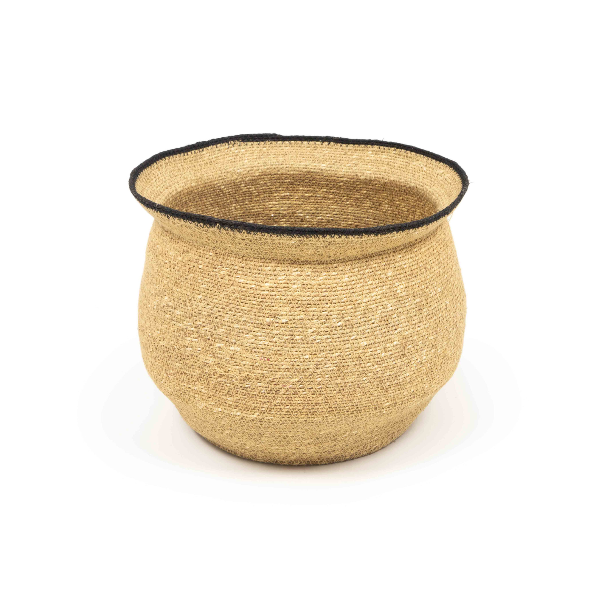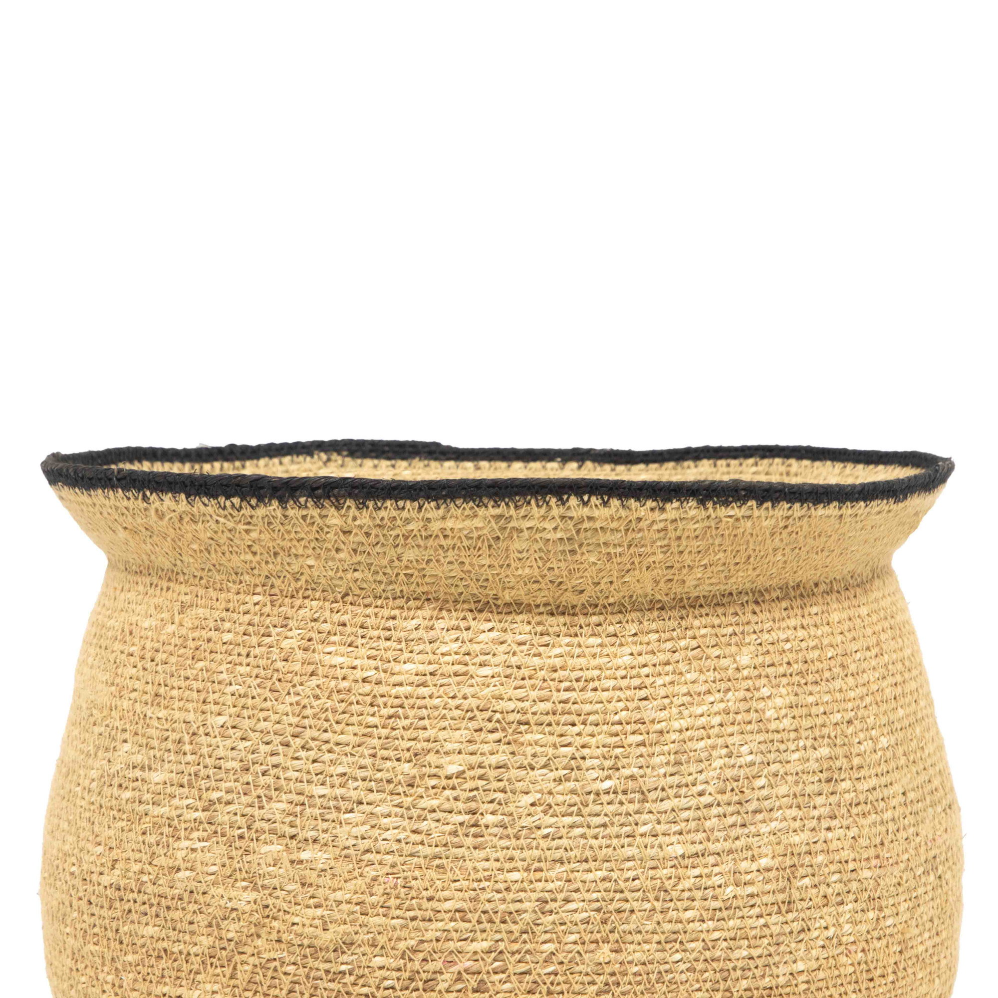 Our Big Bowl Seagrass Planter - Sand & Charcoal is a piece of organic sculpture, designed to frame and elevate your favorite botanicals. This item effortlessly merges the raw, natural texture of the Java Collection with a refined, contemporary silhouette. Hand-woven from durable Seagrass, this vase features a soft, curving silhouette that narrows slightly at the top, giving it a unique, organic feel. The tight, tactile weave and warm neutral beige tone provide an immediate sense of calm and earth-bound elegance to your space. A subtle Charcoal edge traces the top edge, defining the opening and introducing a clean, sophisticated contrast to the natural fiber. This small, deliberate detail instantly elevates the piece from simple storage to decorative art. Use the Big Bowl Seagrass Planter as a sophisticated cachepot to conceal plant pots, or as a textural vase to hold dried florals, branches, or simply as a standalone decorative object on a console or side table.