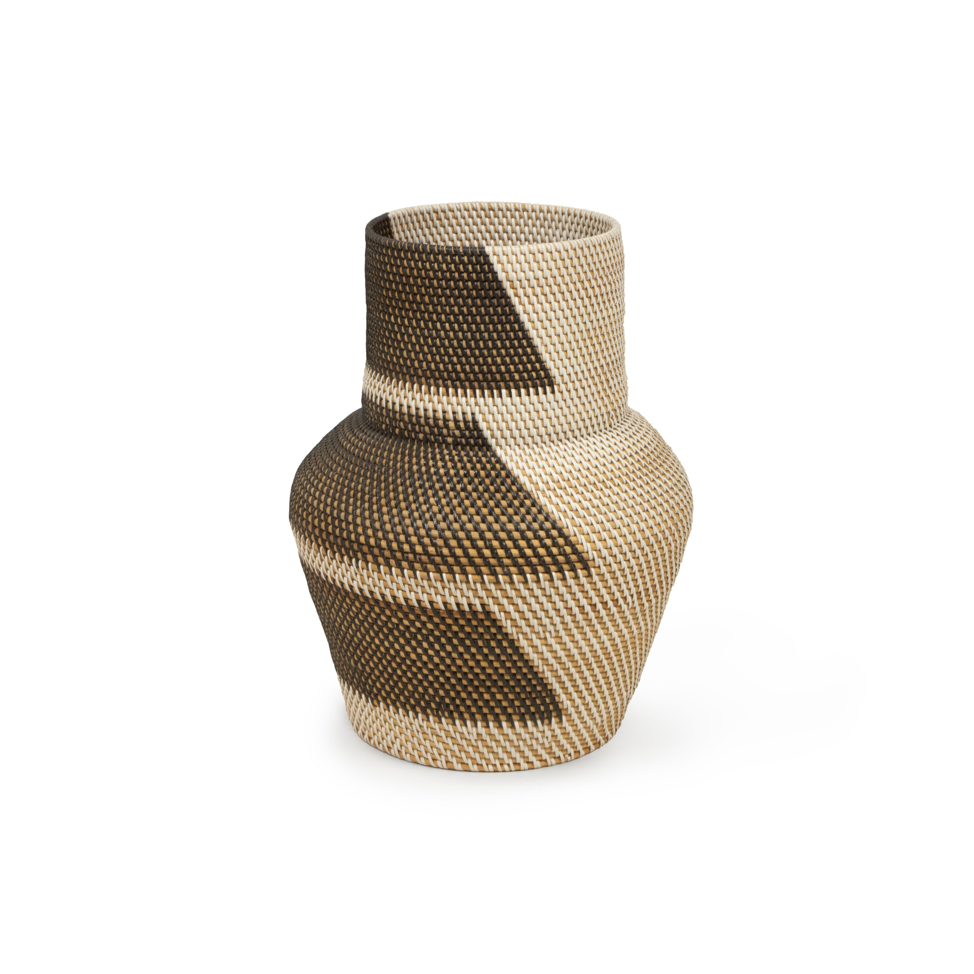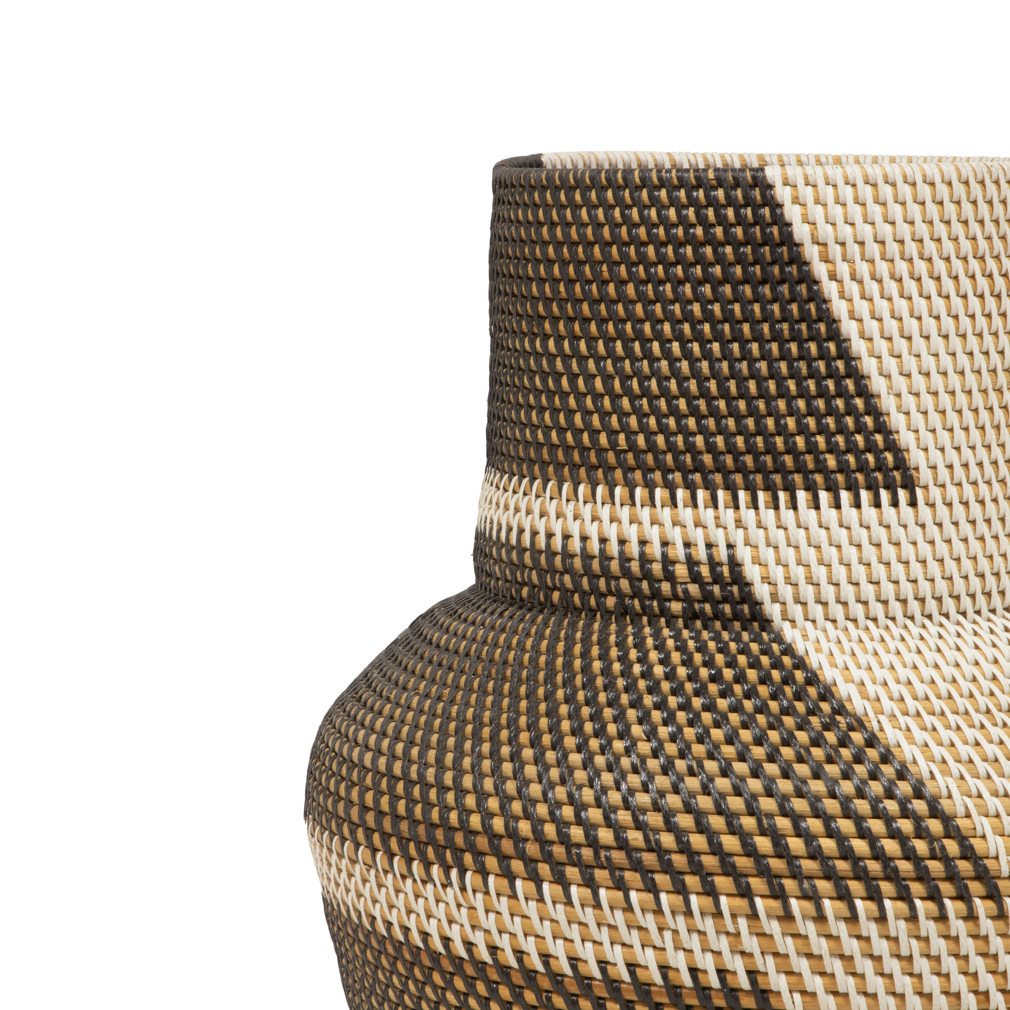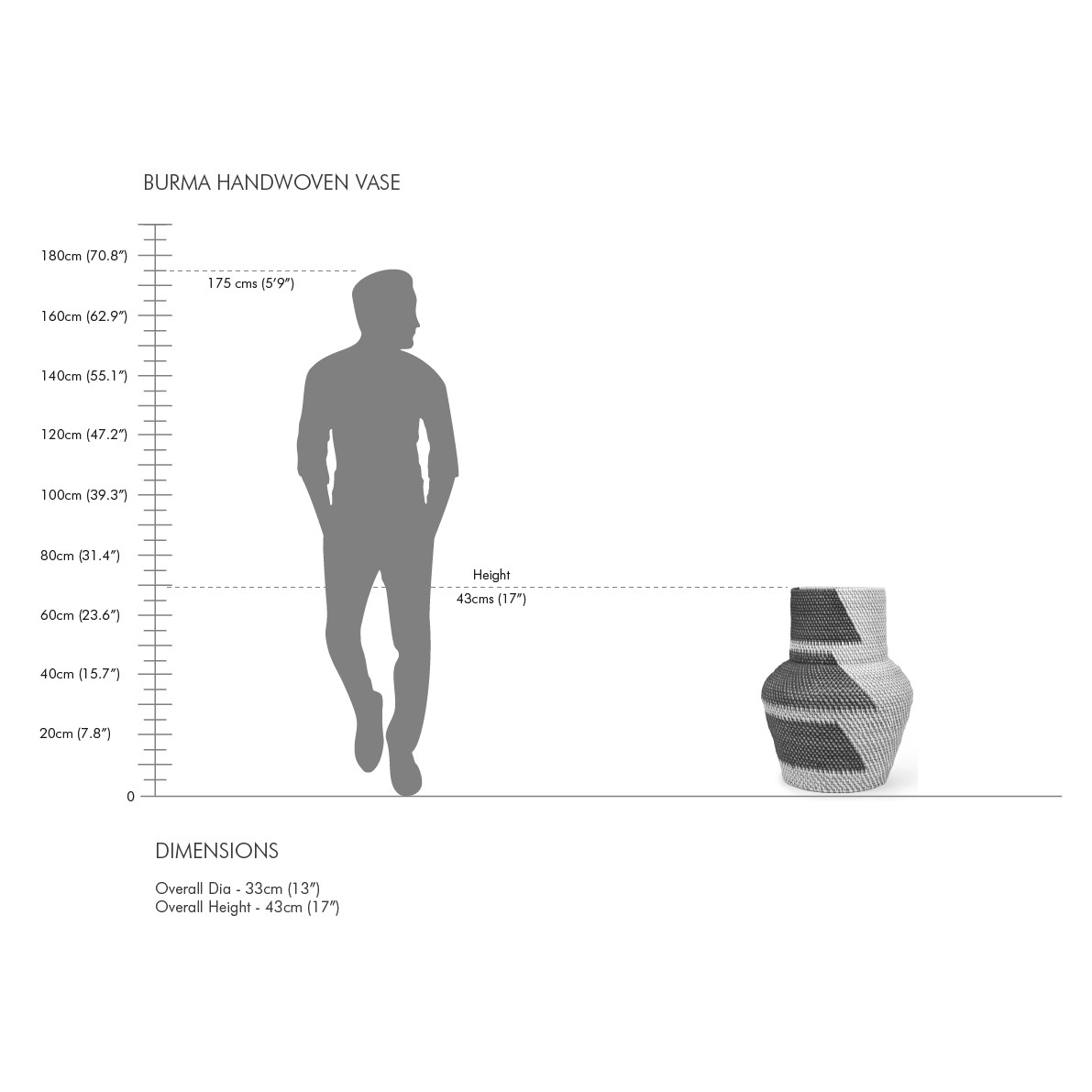 A timeless blend of tradition and modern form, our Burma Handwoven Vase celebrates the artistry of cane and rattan weaving in a statement silhouette. Its dual-tone design, earthy natural hues intertwined with deep, contrasting weaves, adds a sculptural edge to your décor. The piece carries the essence of Burmese craftsmanship, balancing rustic texture with refined geometry. Handwoven with care, this vase stands beautifully on its own or styled with dried botanicals, pampas grass, or slender cane stems. Whether placed as a centrepiece on a dining table, a console accent, or a shelf statement, it effortlessly infuses warmth and artisanal charm into contemporary spaces.
