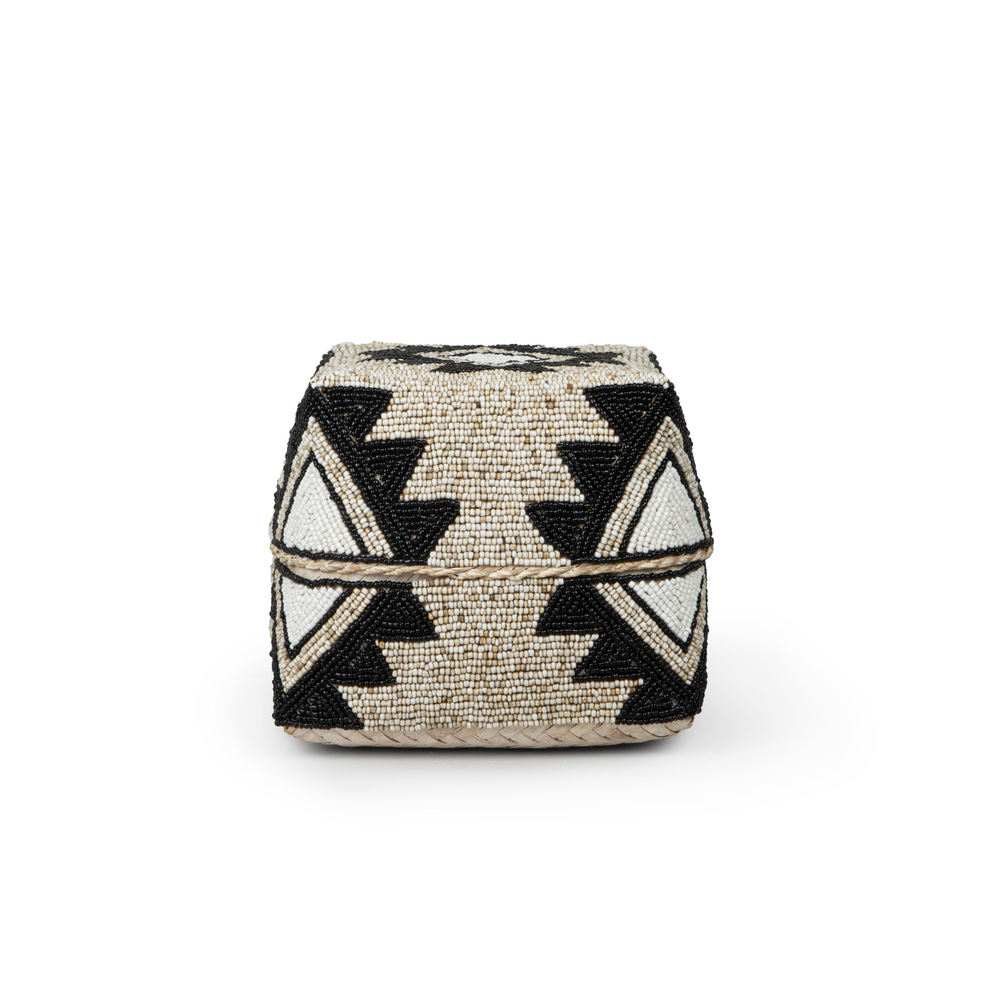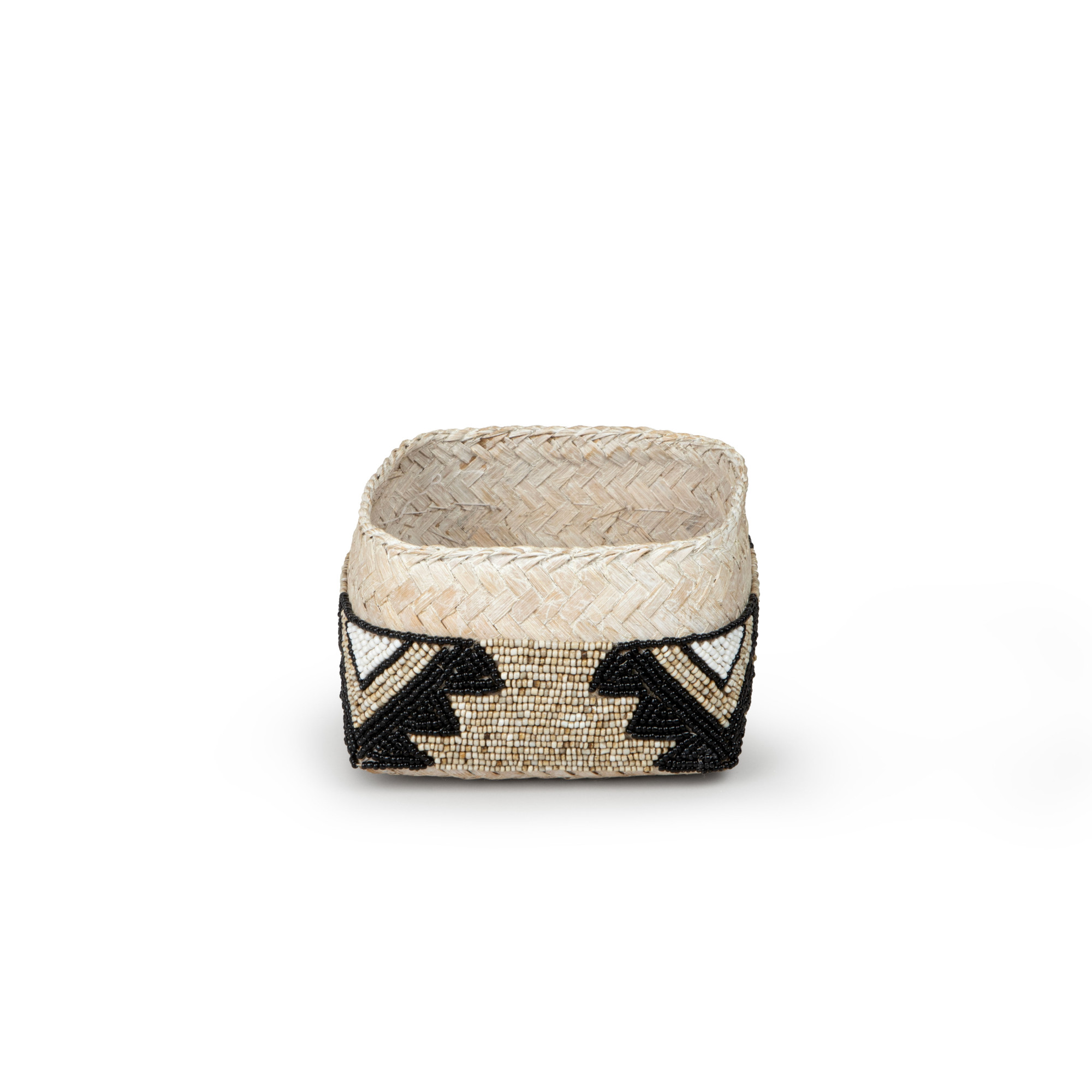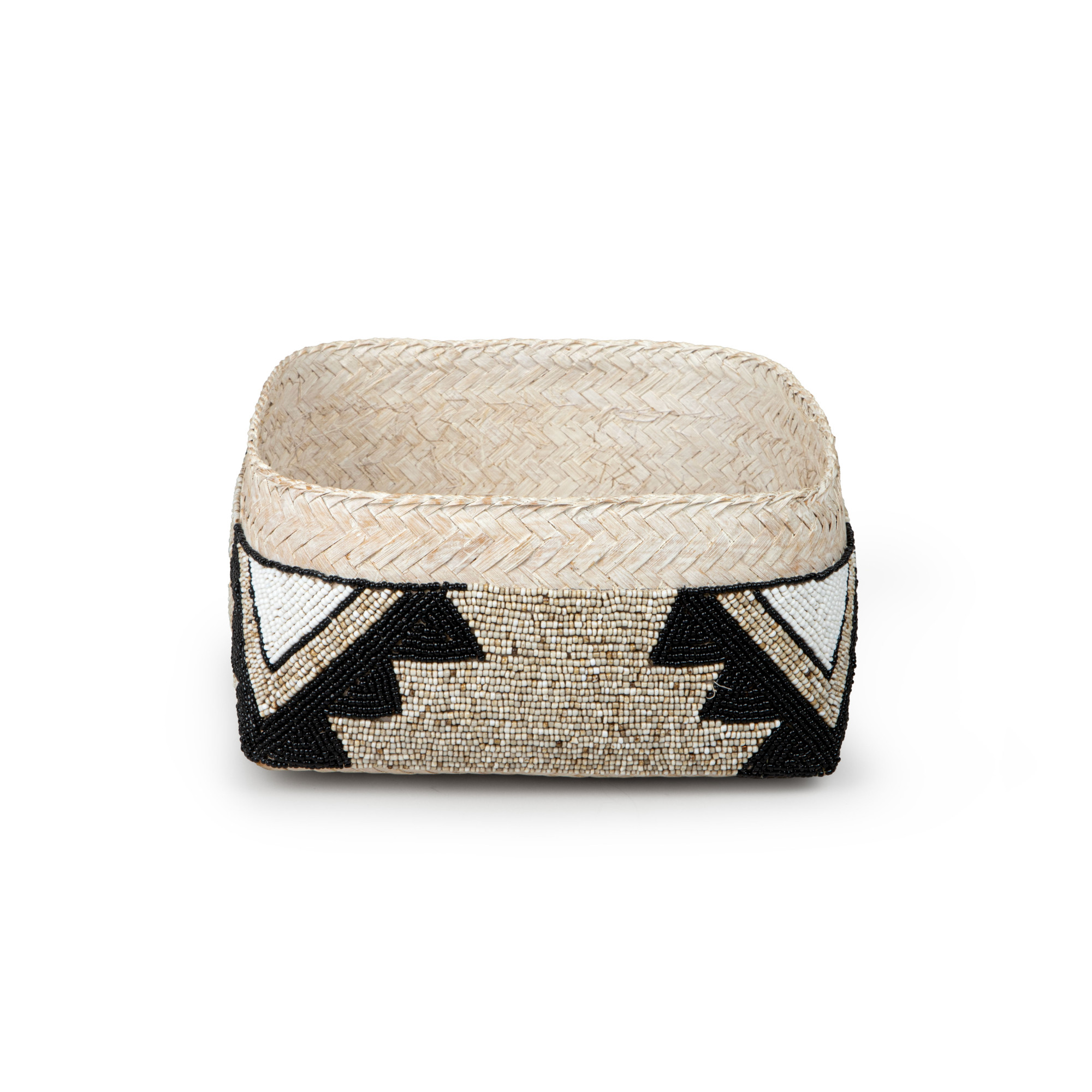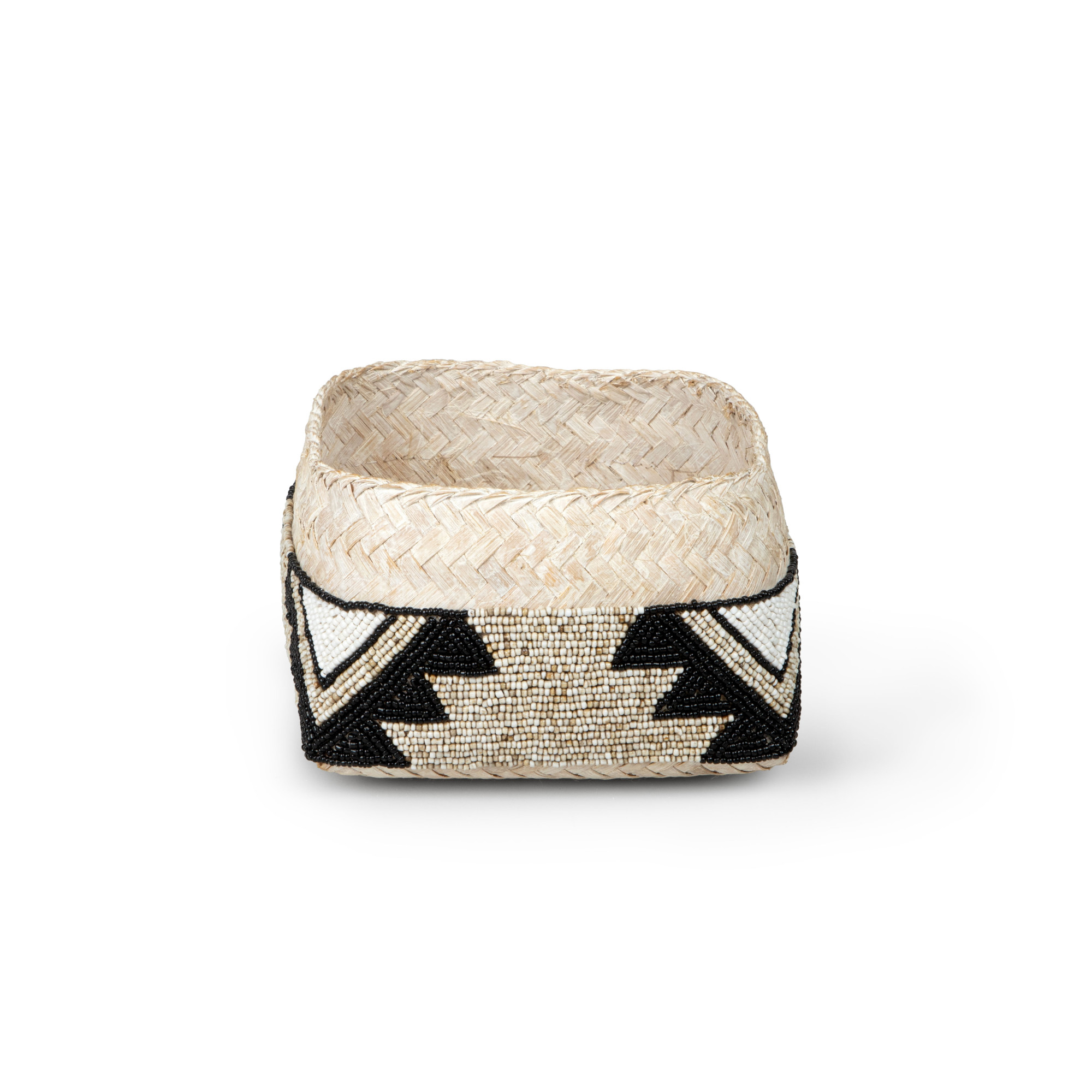 Behold the captivating Cairo Square Seagrass Basket in Beige & Charcoal beadwork, an exquisite work of art that exudes charm and sophistication. Fashioned from the finest seagrass, this basket boasts a geometric pattern and is intricately woven with beige, ivory, and black glass beads, which is a testament to the artisan's mastery of their craft. The intricate design, with its interwoven strands of seagrass, creates a striking contrast that delights the eyes and ignites the imagination. The meticulous attention to detail is apparent in every weave, as the basket's corners are expertly squared, lending an air of geometric precision that is both contemporary and timeless. Whether used as a decorative accent or a functional storage solution, this piece is sure to add a touch of elegance and refinement to any space.
