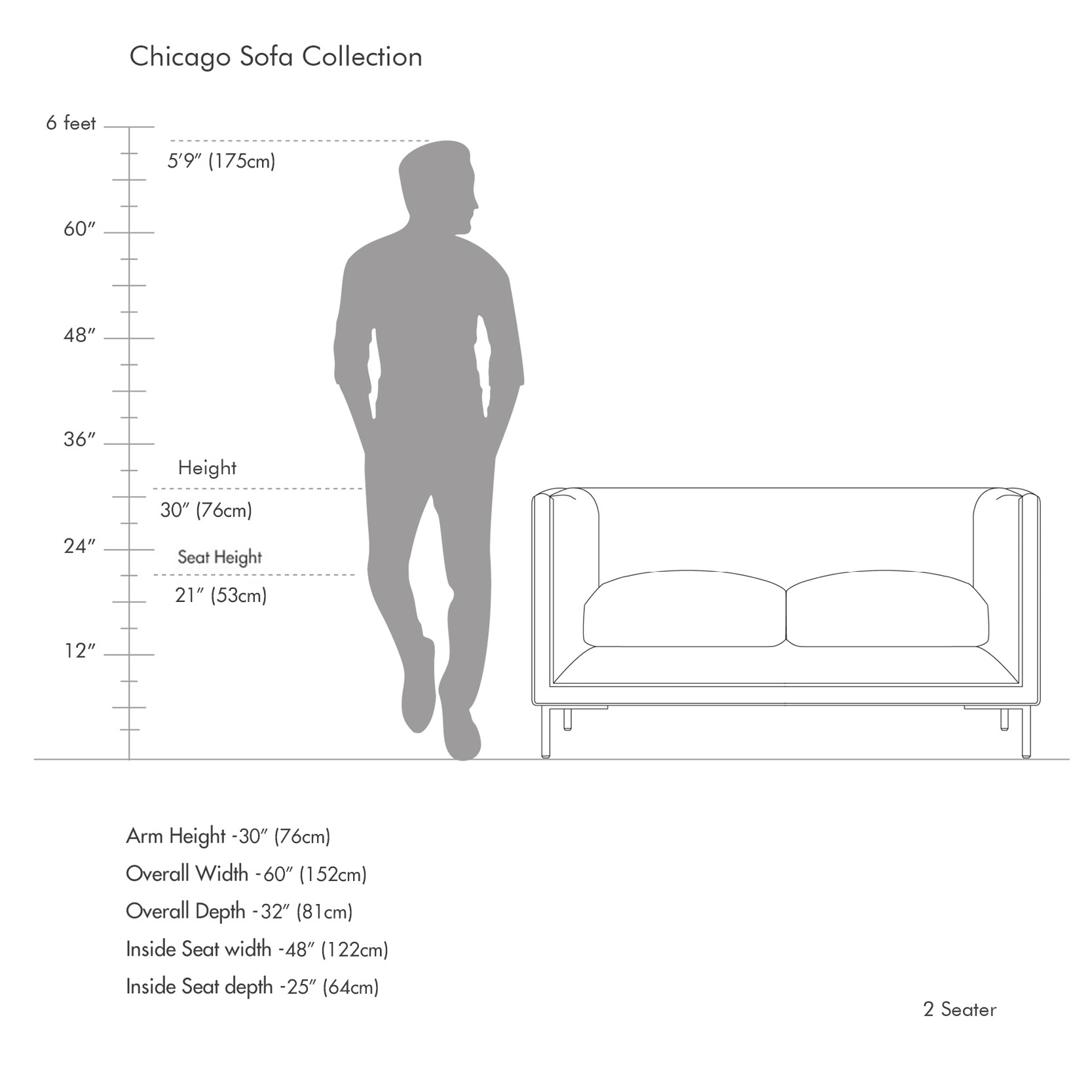 2 Seater: 152cm W x 81cm D x 76cm H (59.8" Width x 31.8" Depth x 29.9" Height)