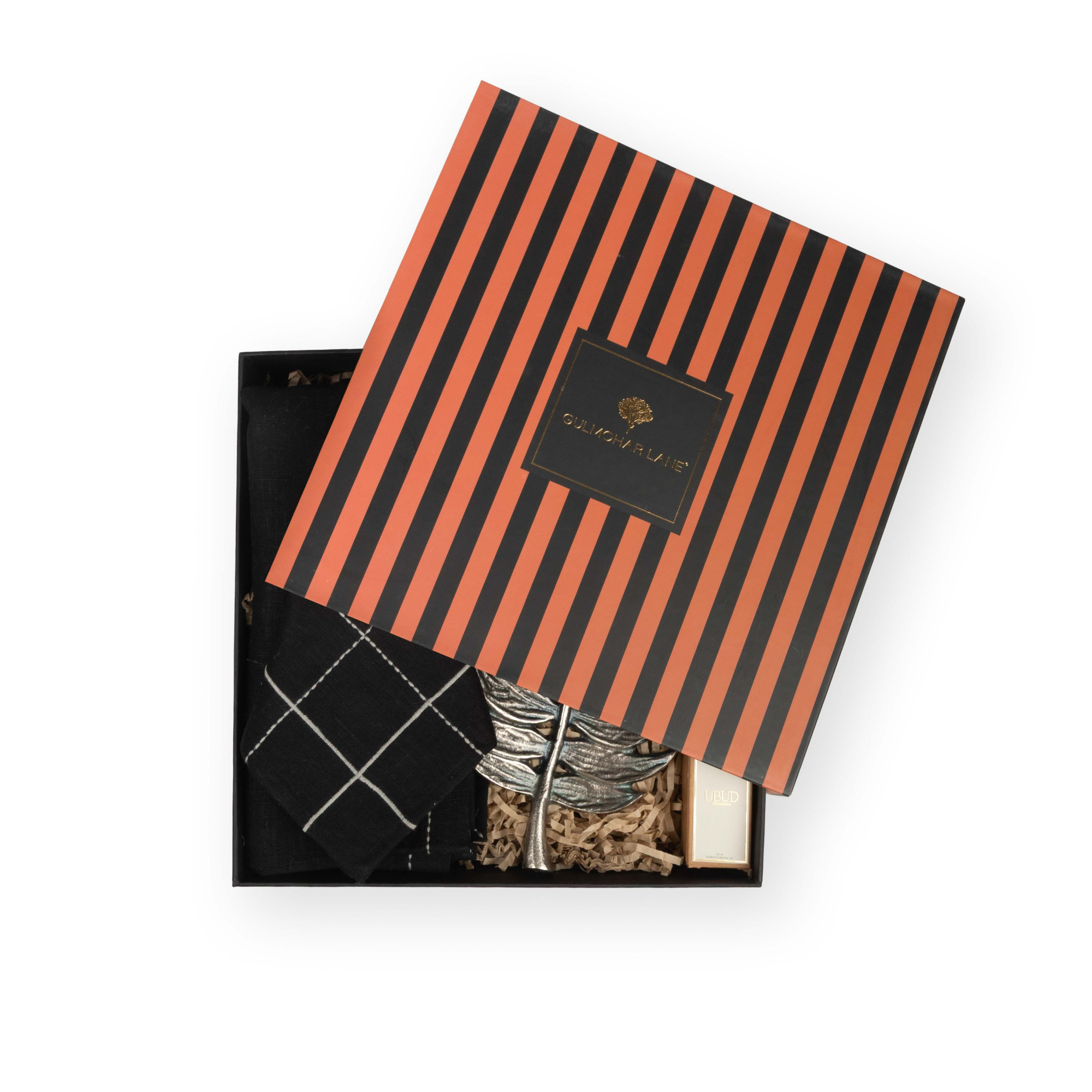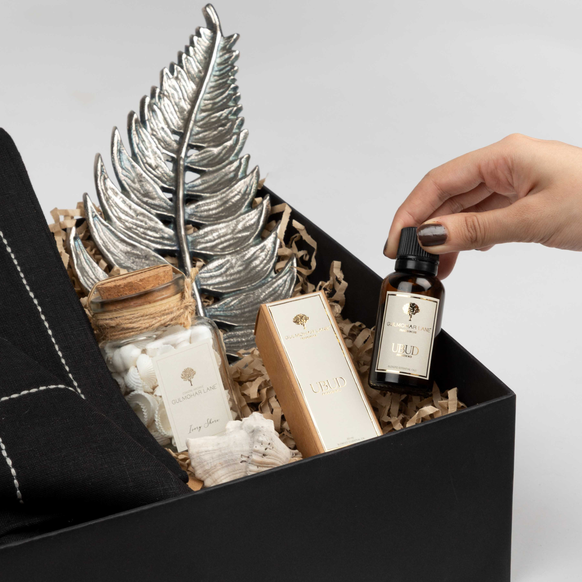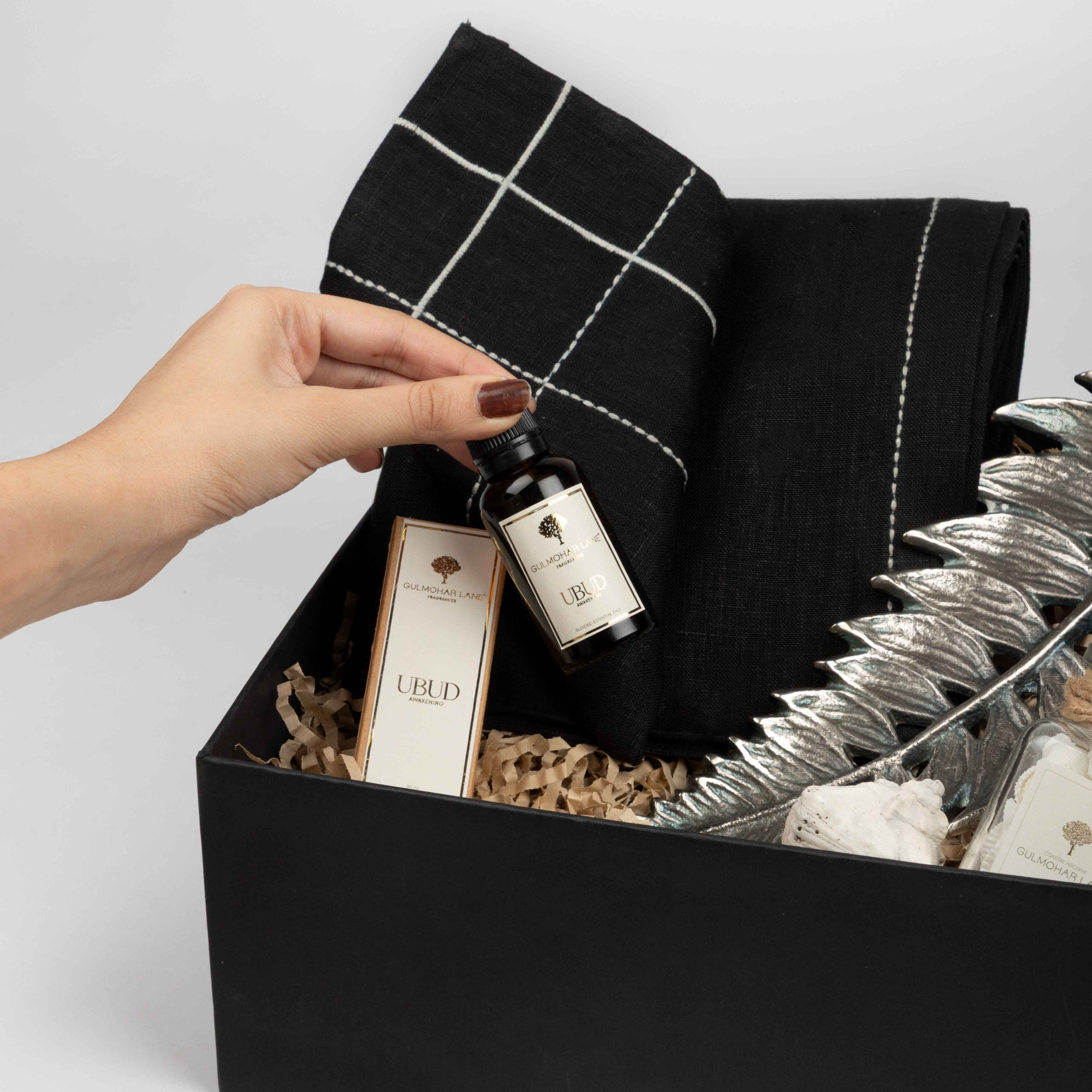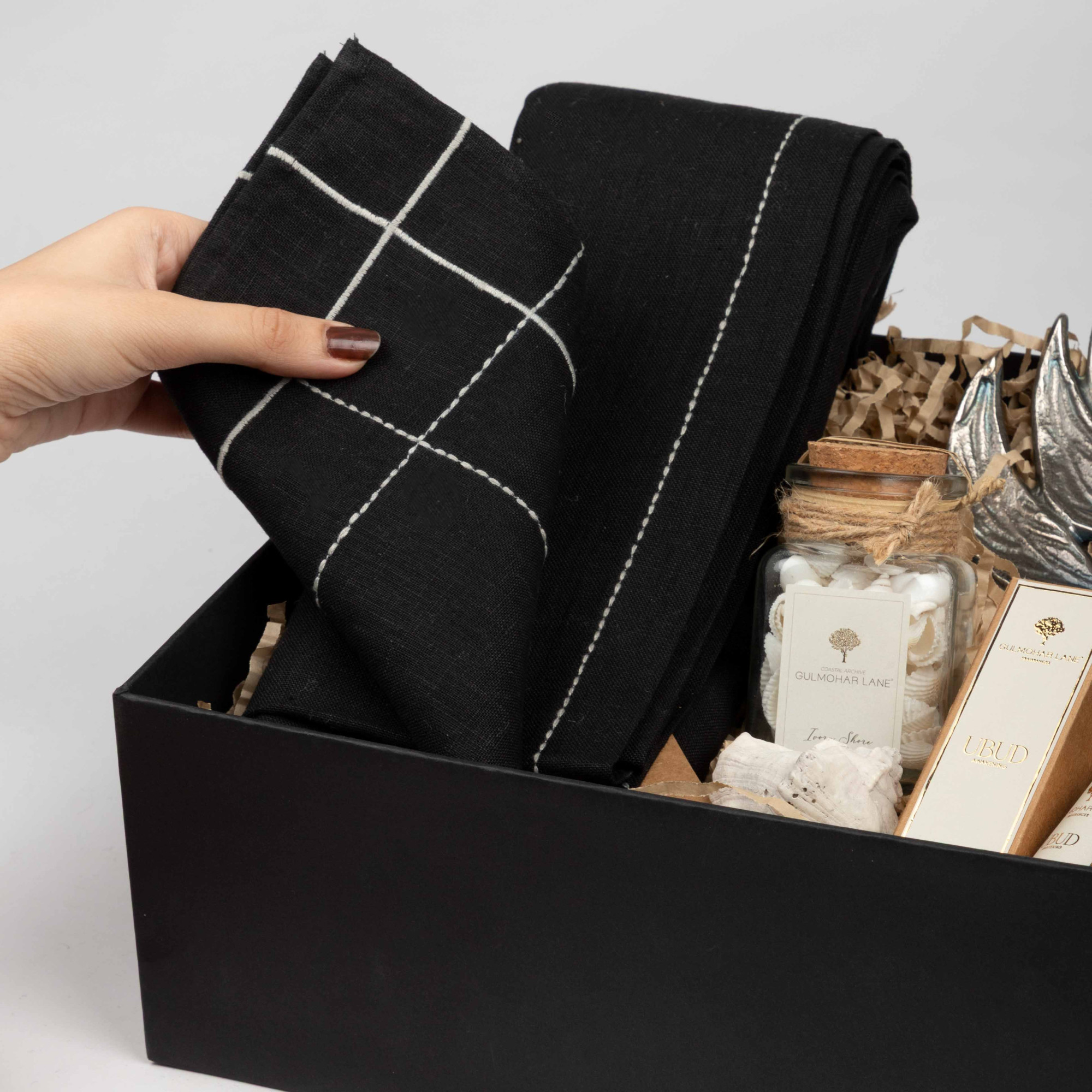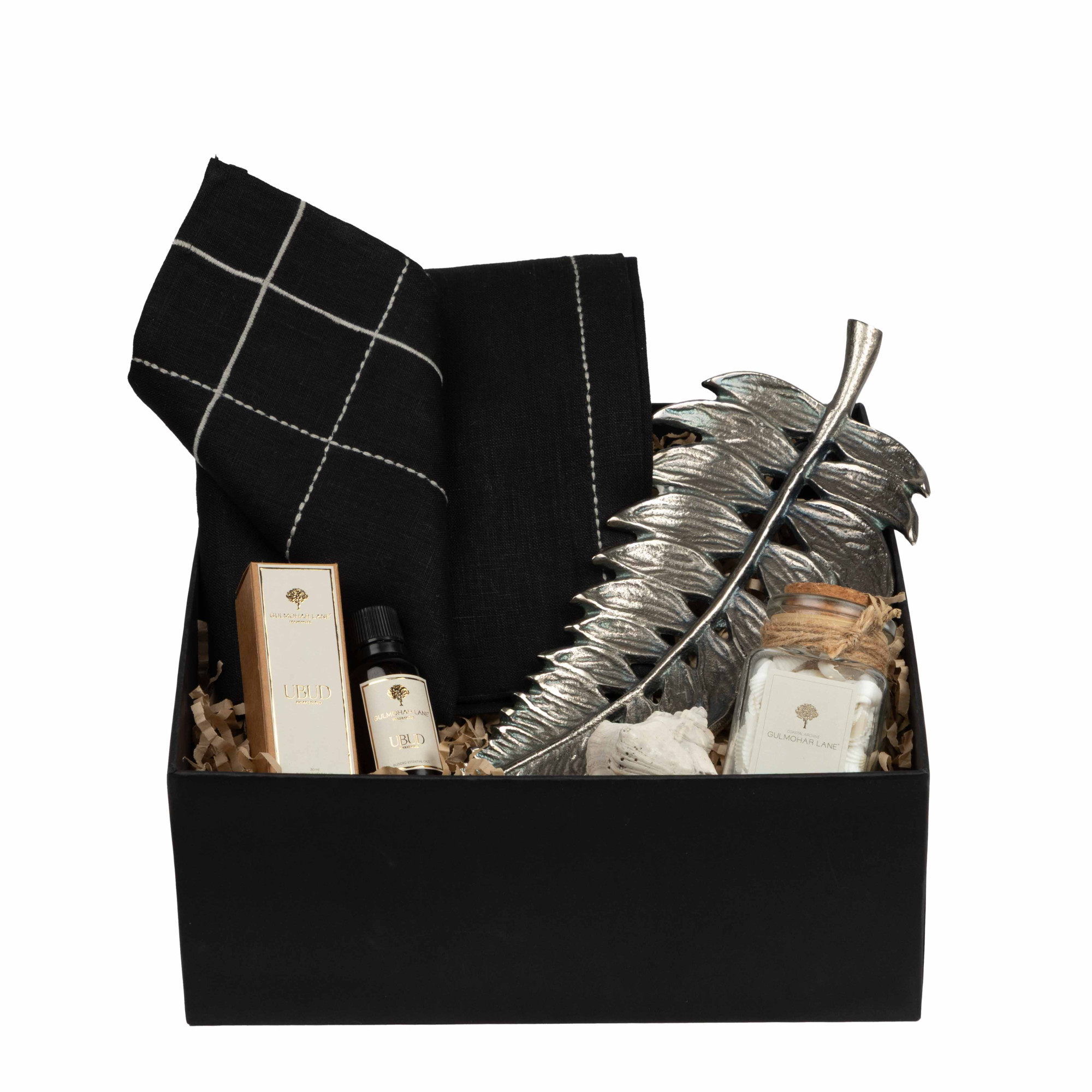 The Ebony Crest Gift Box gathers the subtle play of black, silver and white into a curated moment of beauty. The 100% linen ebony shade napkins, two in minimal squares and two in soft checks, carry a subtle tactility that feels crafted rather than decorated. Their soft drape and fine embroidered detailing add refinement to any table without ever demanding attention. Paired with the matching ebony-toned 100% linen runner bring a sleek, sophisticated feel, their embroidered lines tracing a subtle rhythm that anchors the set with understated charm. The Ferra Tray in antique nickel rises like a sculpted silver leaf bold yet refined, catching light the way moonshine glides over a still tide. Ivory seashells rest beside it like soft punctuation, easing the deeper palette with a whisper of shoreline calm, while the Ubud Awakening essential oil completes the story with its grounding warmth.