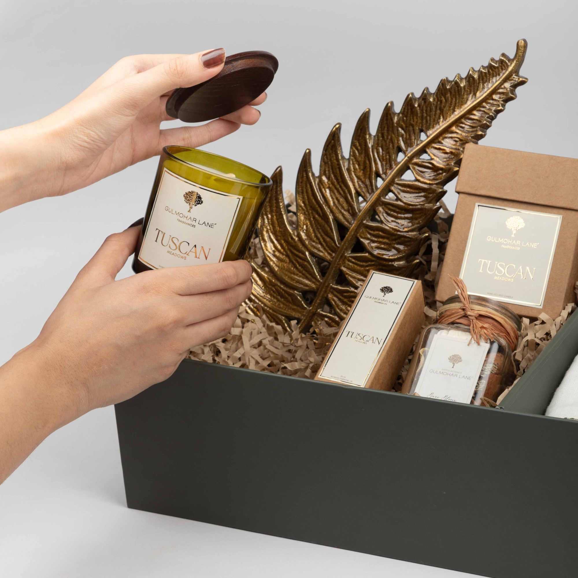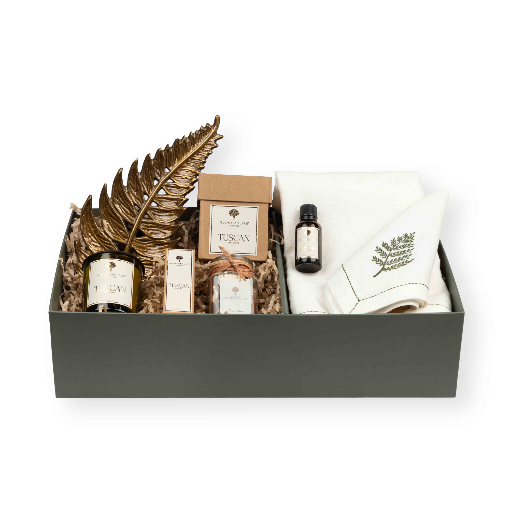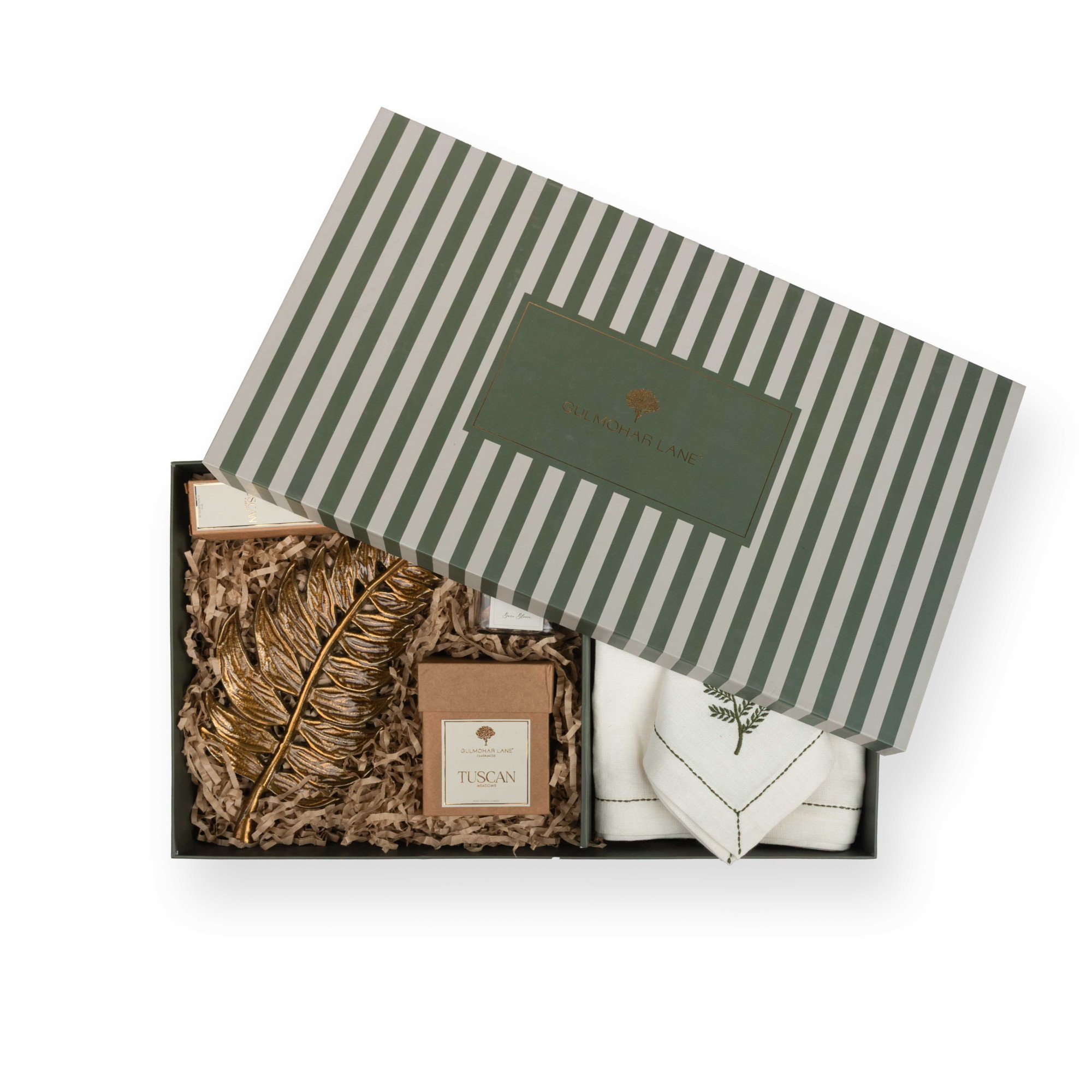 A dining moment can feel like a small celebration, and the Fern & Meadow Gift Set gathers every graceful detail needed to set that tone. Curated for those who treasure beautiful rituals, this box brings together linen, metal, and earthy botanical elements, each chosen to elevate the simple act of hosting. The Tuscan Meadows candle and essential oil infuse the space with a gentle glow, while the Bare Bloom Potpourri adds visual charm with its mix of white-and-brown botanicals—organic, airy and naturally decorative. The set of four napkins made from 100% linen—two finished with a delicate fern embroidery and two with a clean olive-hued stitch- lay softly against the matching 100% linen olive stitch table runner, creating a cohesive tablescape. The Ferra Tray in antique brass, sculpted in the silhouette of a fern, anchors the ensemble with its warm gleam and makes for a striking centre accent.
