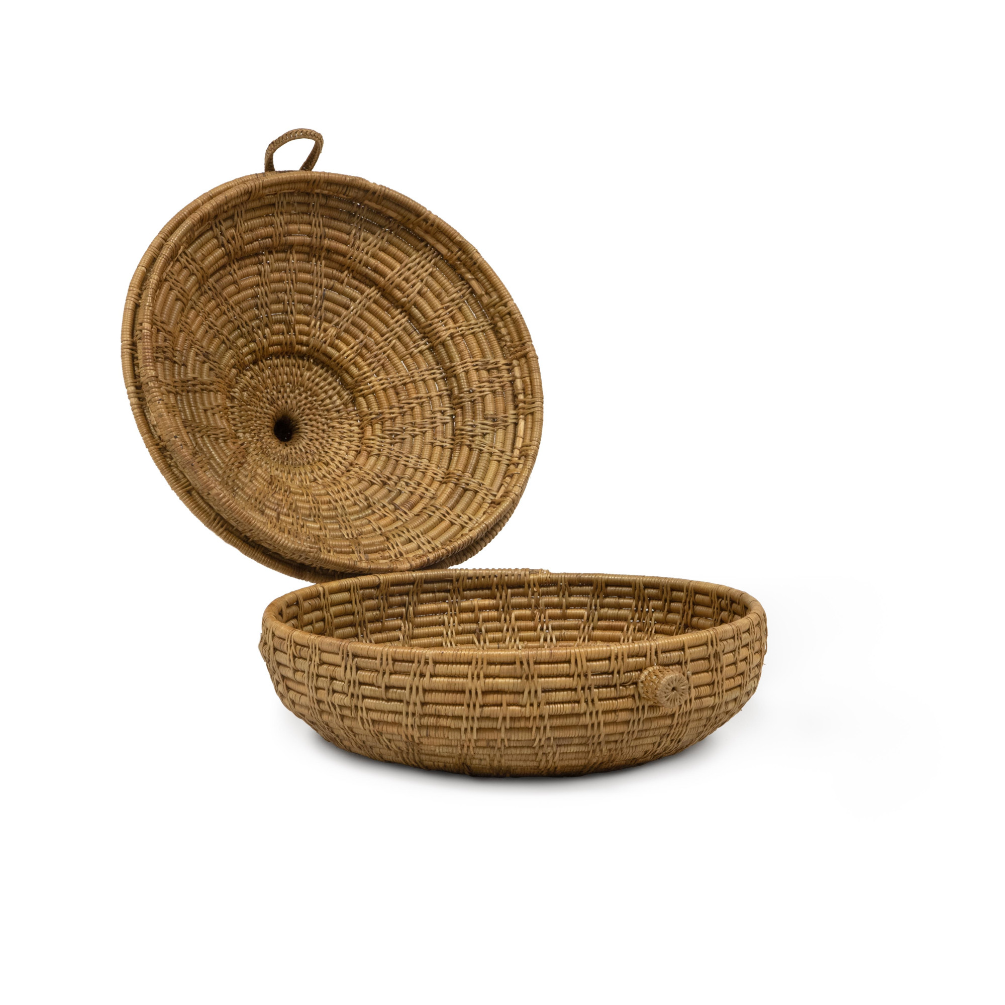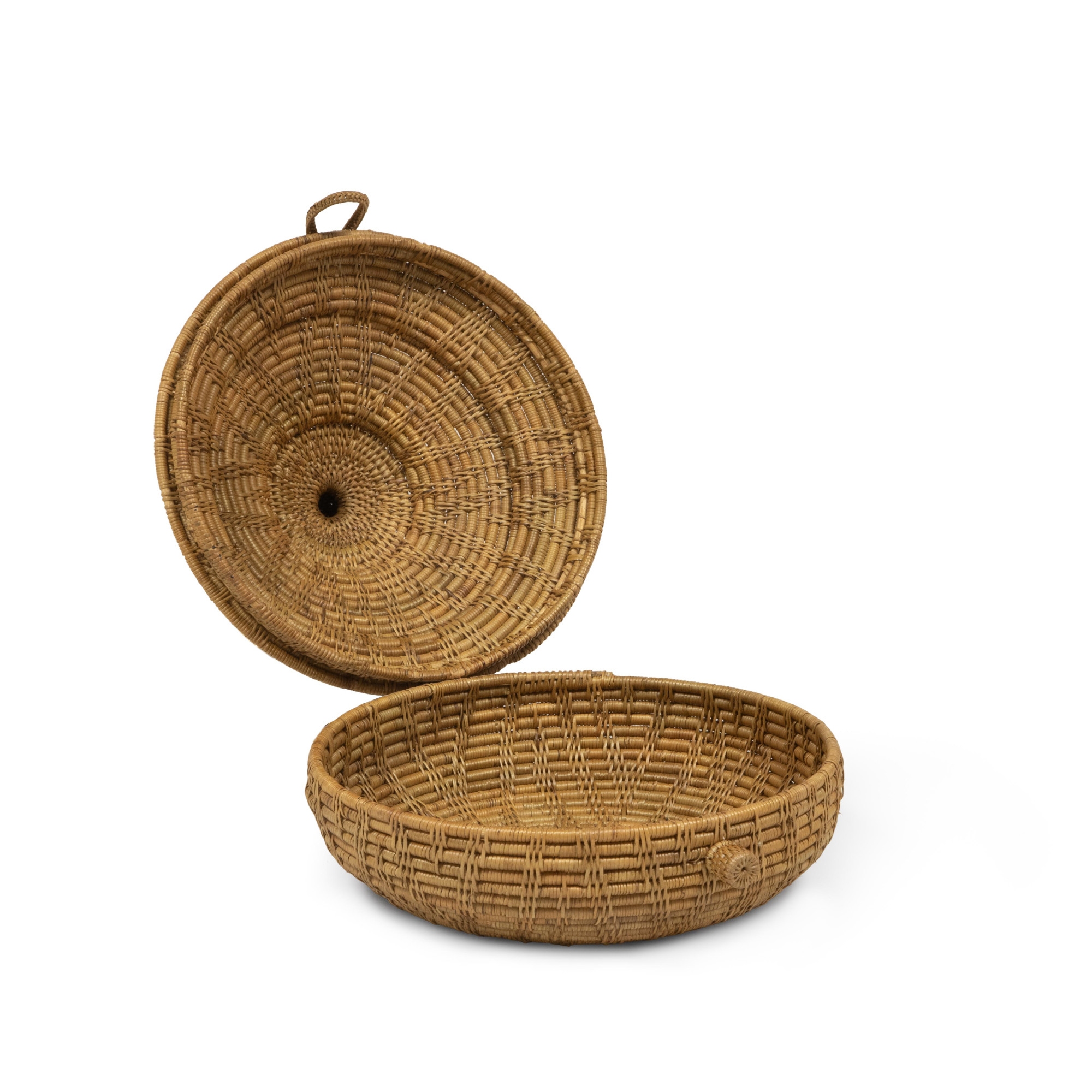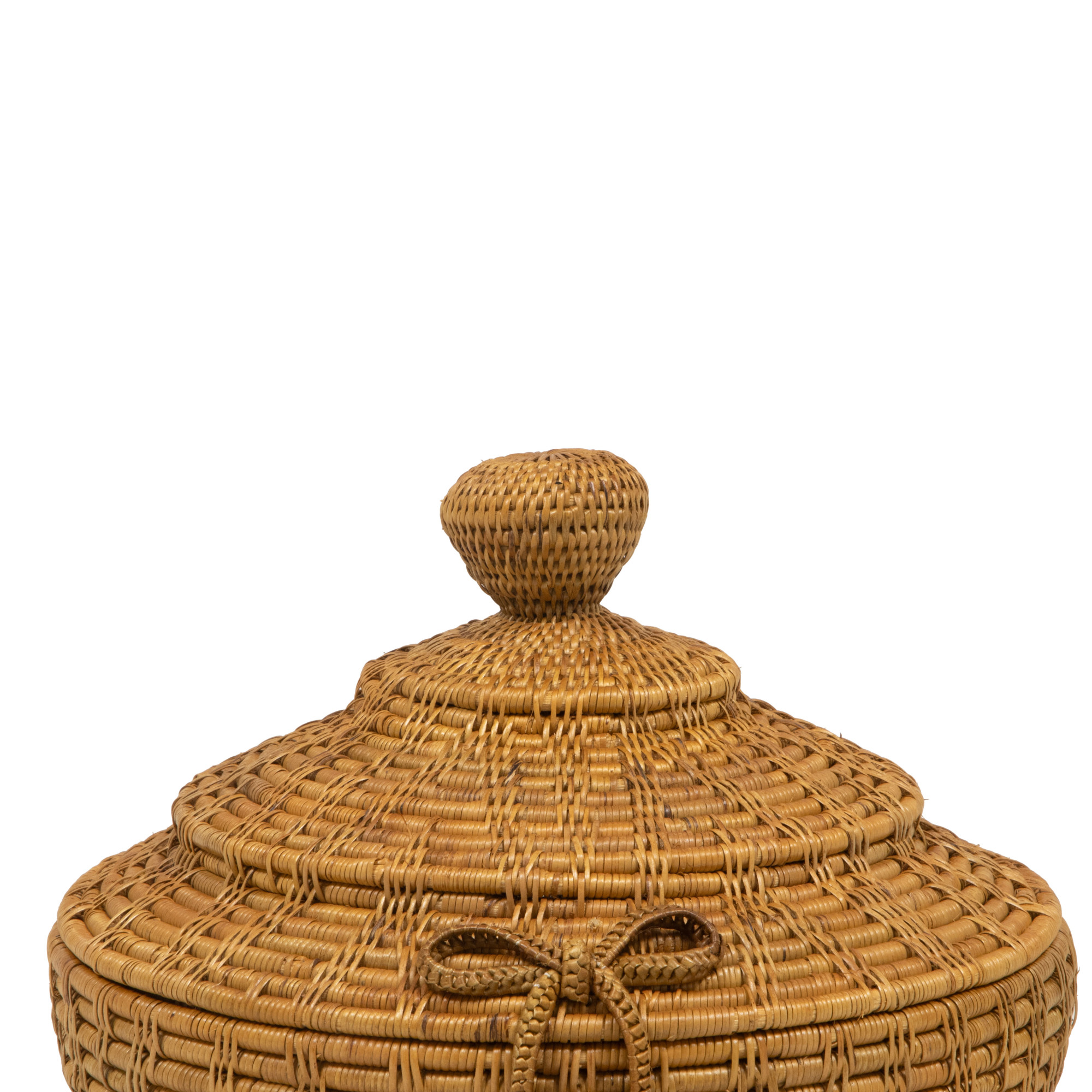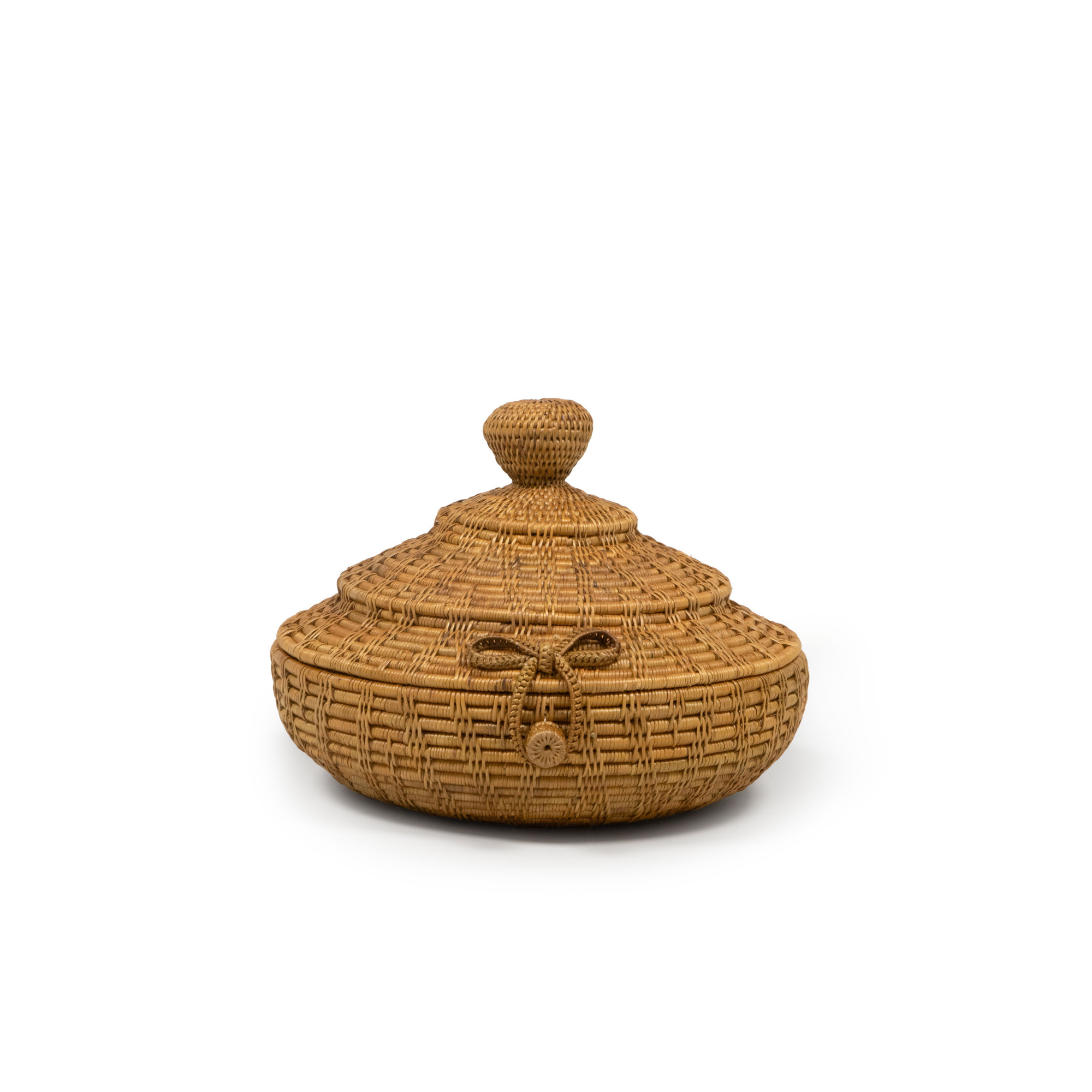 Intricately handwoven by skilled artisans, the Jakarta Weave Storage Basket with Lid celebrates the art of traditional rattan craftsmanship. The basket’s rounded silhouette is adorned with elaborate twining and plaiting patterns that bring texture and depth to its natural finish. A charming bow detail on the lid adds a touch of whimsy, while the snug-fitting top keeps your essentials neatly tucked away. Sturdy yet beautifully refined, this basket is both functional and decorative, perfect for storing small keepsakes, trinkets, perfect hostess or a housewarming present. Style it as a standalone accent on a console, nightstand, or open shelf to introduce an element of handcrafted warmth and charm to your space.