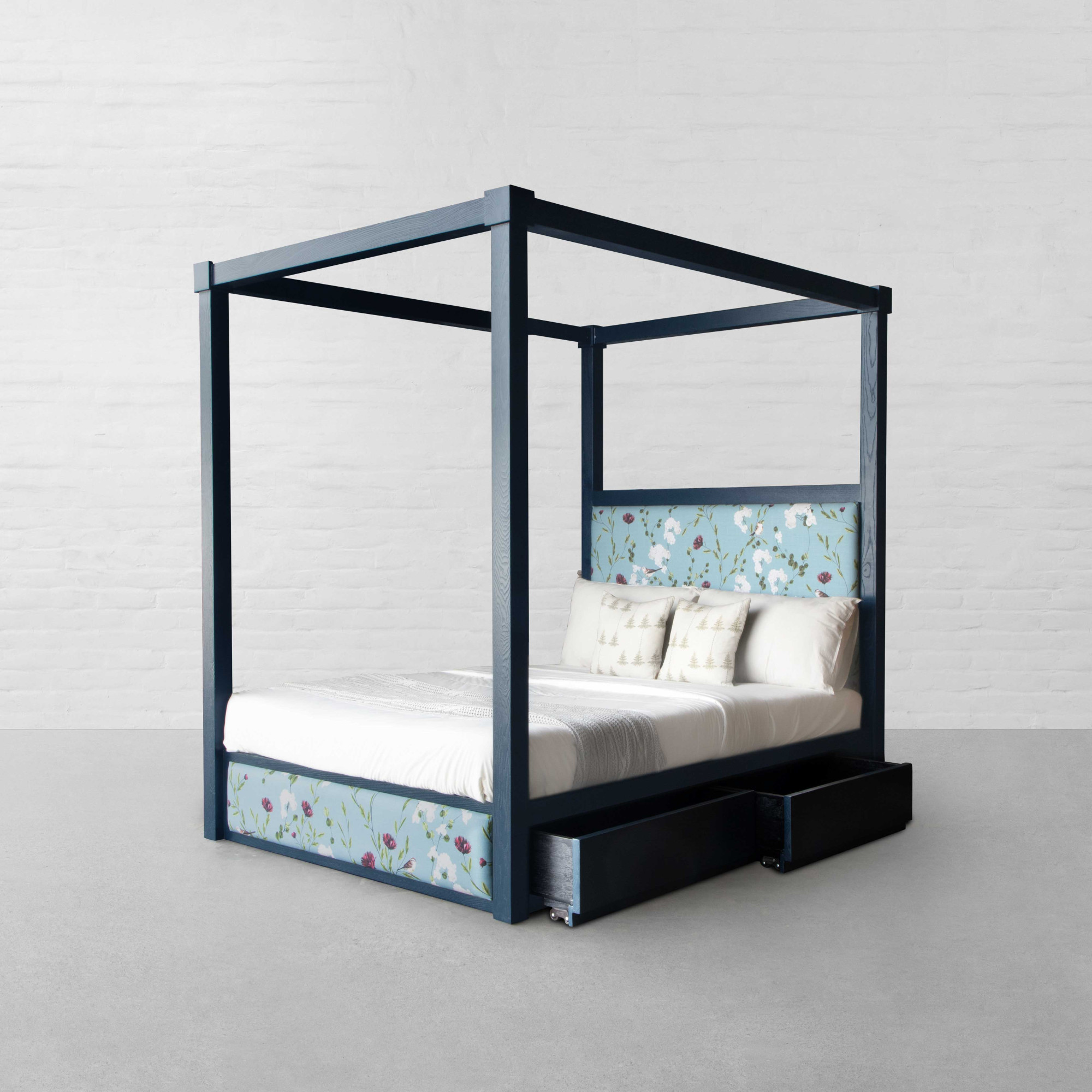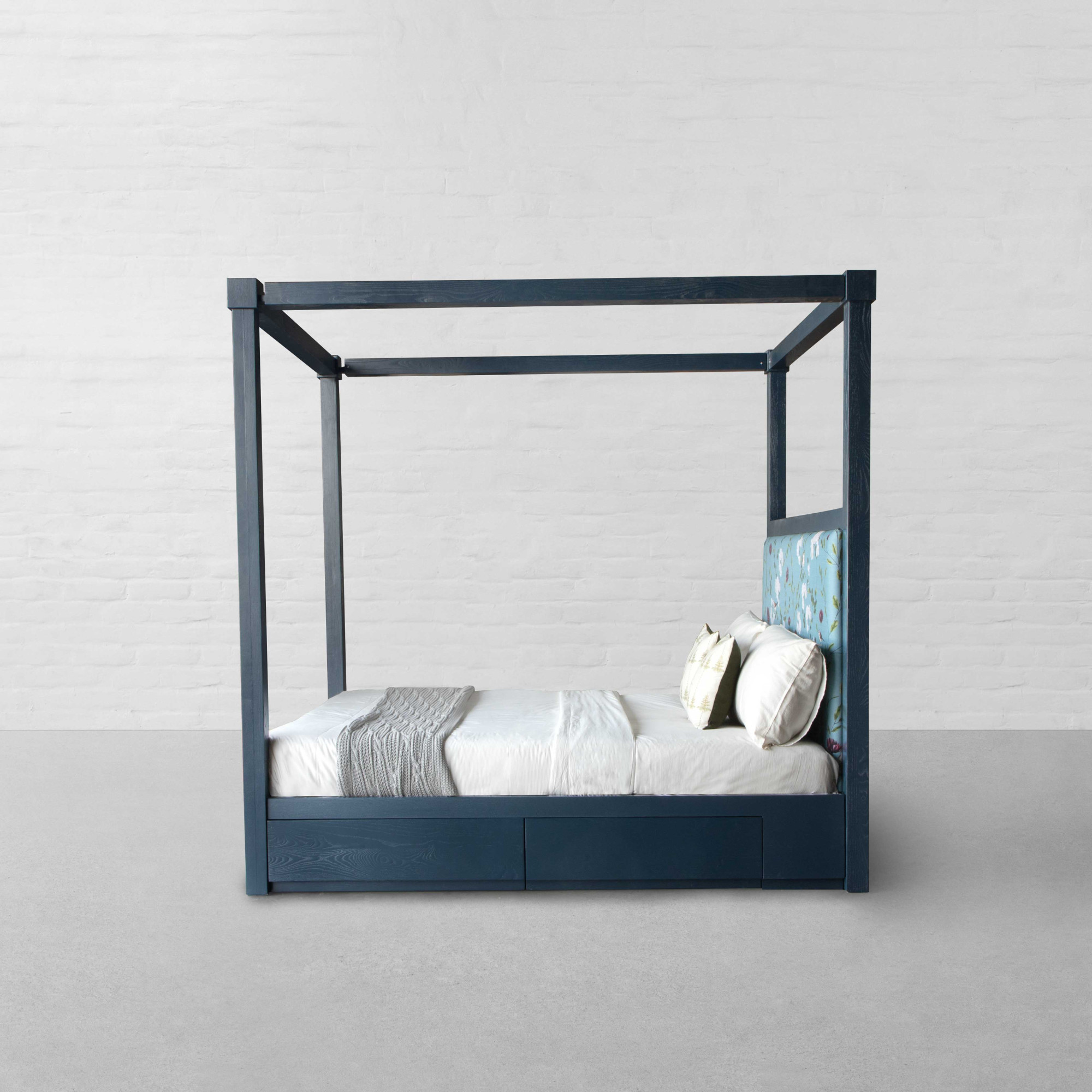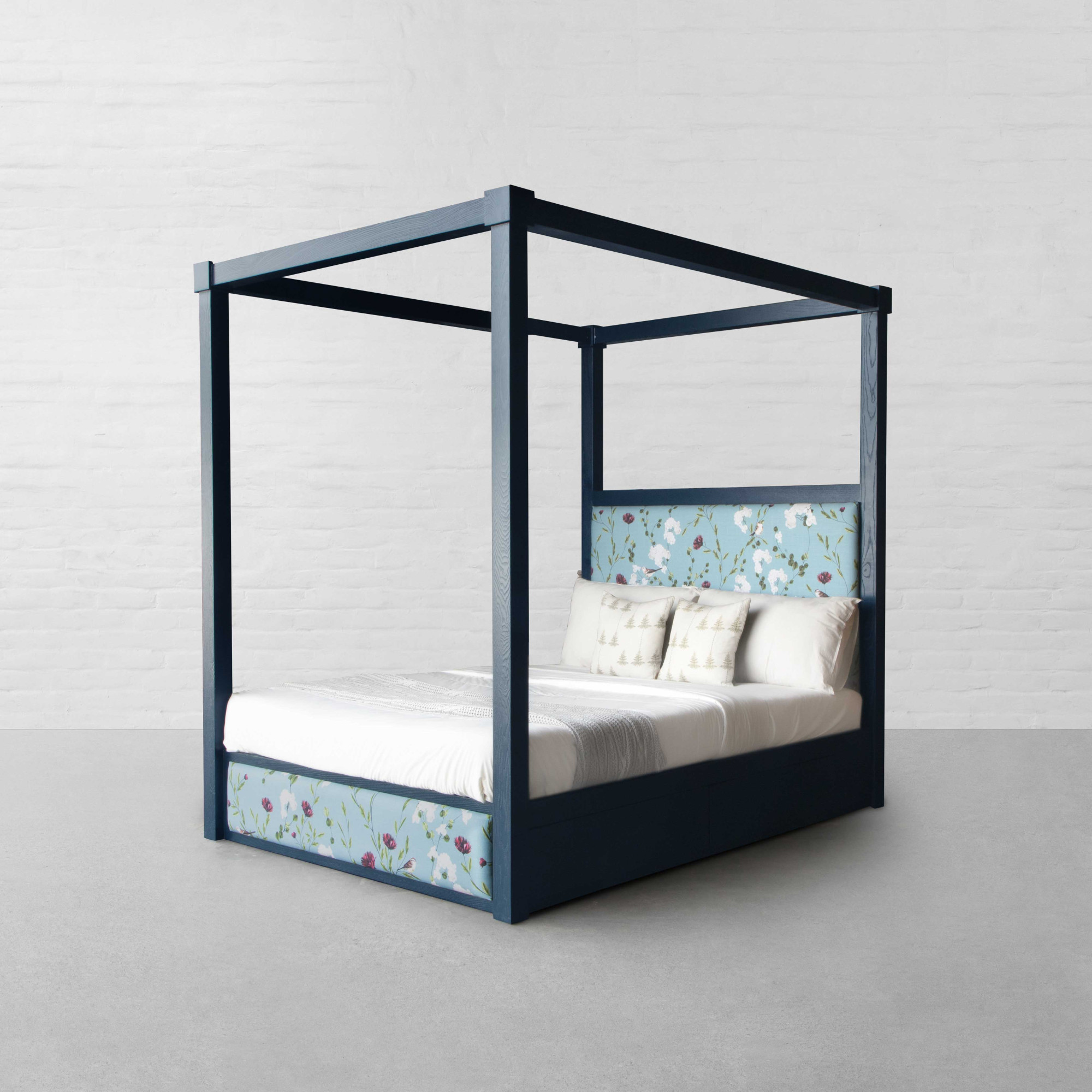 Mixing bold proportions with a clean, straight silhouette, the Kingston Four Poster Bed brings together a look that feels both timeless and modern. The halved upholstered headboard adds a contemporary edge, lending a balanced, well-defined presence to the bedroom. Rooted in a 1970s postmodern influence, the design features a hand-tufted headboard paired with a solid imported hardwood frame that highlights the warmth and natural grain of the wood. The structure feels substantial yet refined, offering a composed foundation for the space. Thoughtfully integrated storage at the base adds to its functionality, with discreet compartments that provide ample room for bedding, linens, or everyday essentials, keeping the room organised without disrupting the design. Complete the setting with light, airy curtains draped around the frame to create a soft, enclosed atmosphere that feels calm, layered, and inviting.