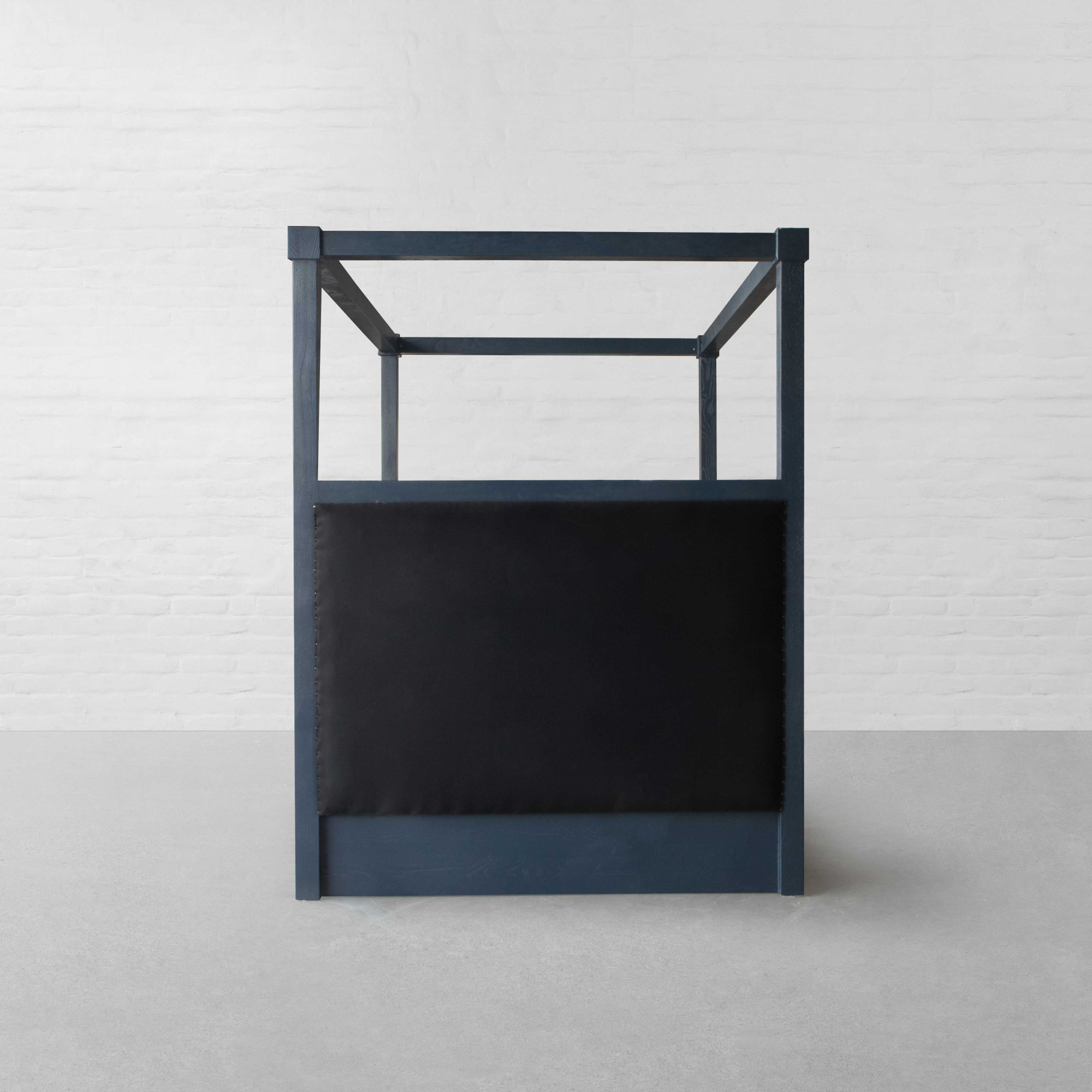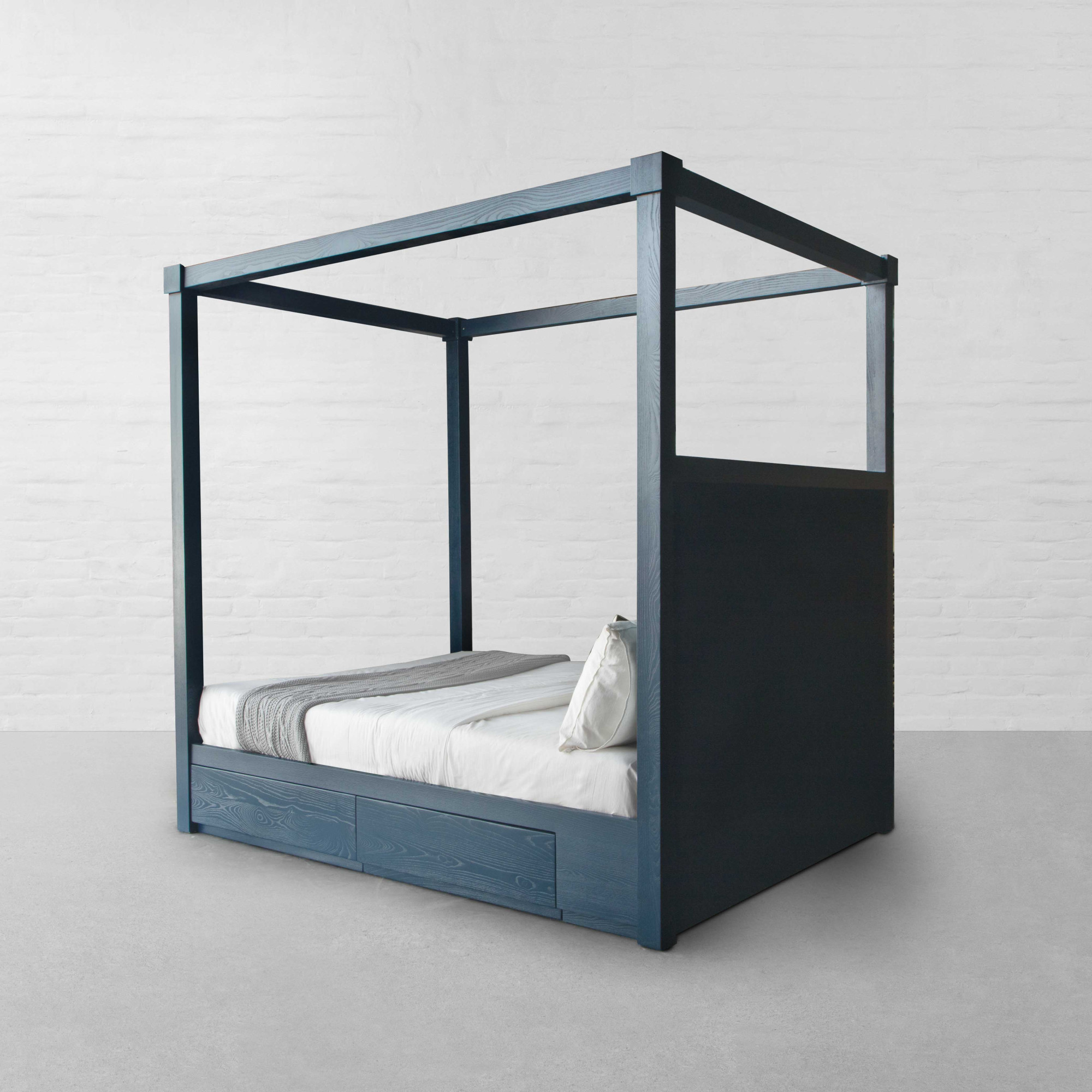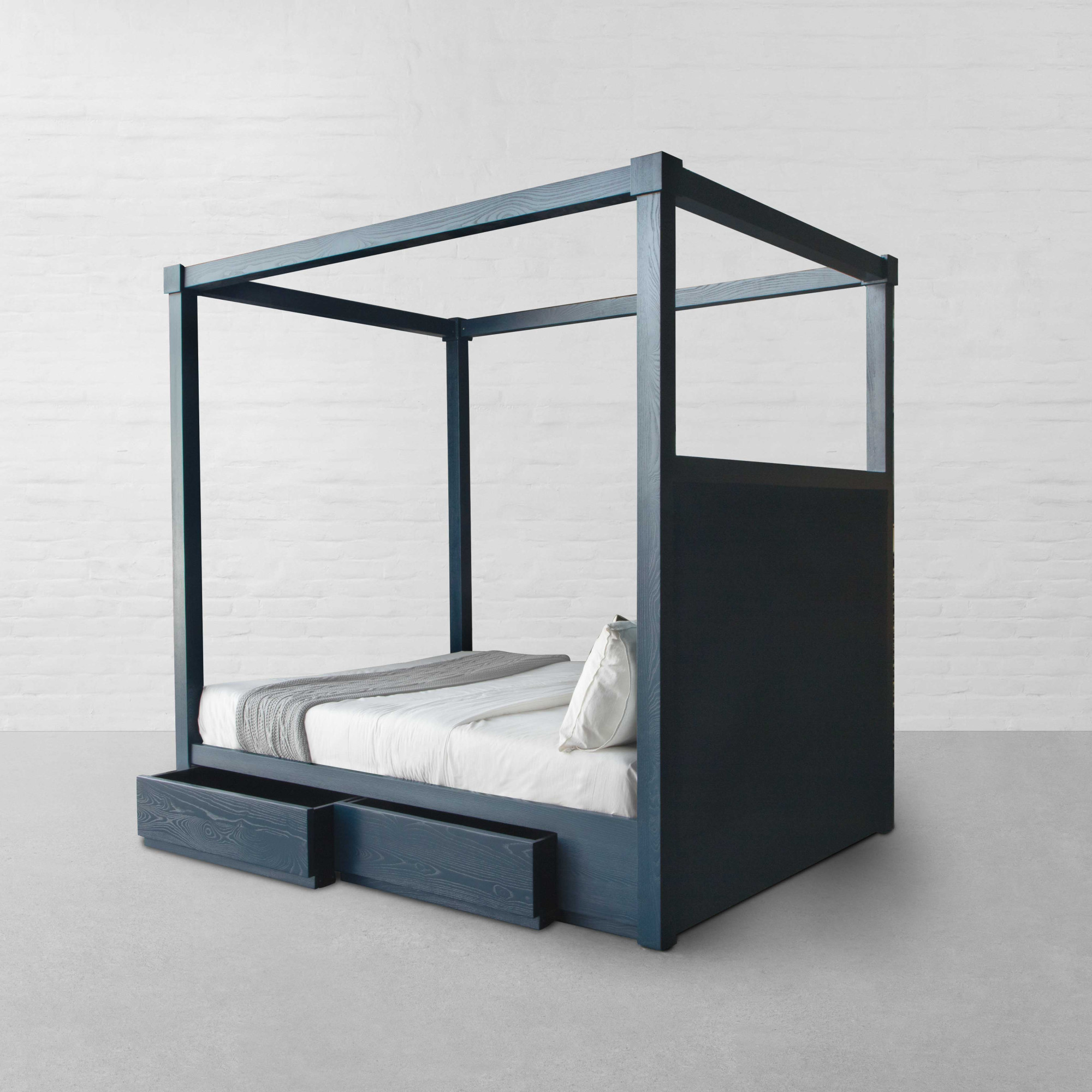 Mixing bold proportions with a clean, straight silhouette, the Kingston Four Poster Bed brings together a look that feels both timeless and modern. The halved upholstered headboard adds a contemporary edge, lending a balanced, well-defined presence to the bedroom. Rooted in a 1970s postmodern influence, the design features a hand-tufted headboard paired with a solid imported hardwood frame that highlights the warmth and natural grain of the wood. The structure feels substantial yet refined, offering a composed foundation for the space. Thoughtfully integrated storage at the base adds to its functionality, with discreet compartments that provide ample room for bedding, linens, or everyday essentials, keeping the room organised without disrupting the design. Complete the setting with light, airy curtains draped around the frame to create a soft, enclosed atmosphere that feels calm, layered, and inviting.