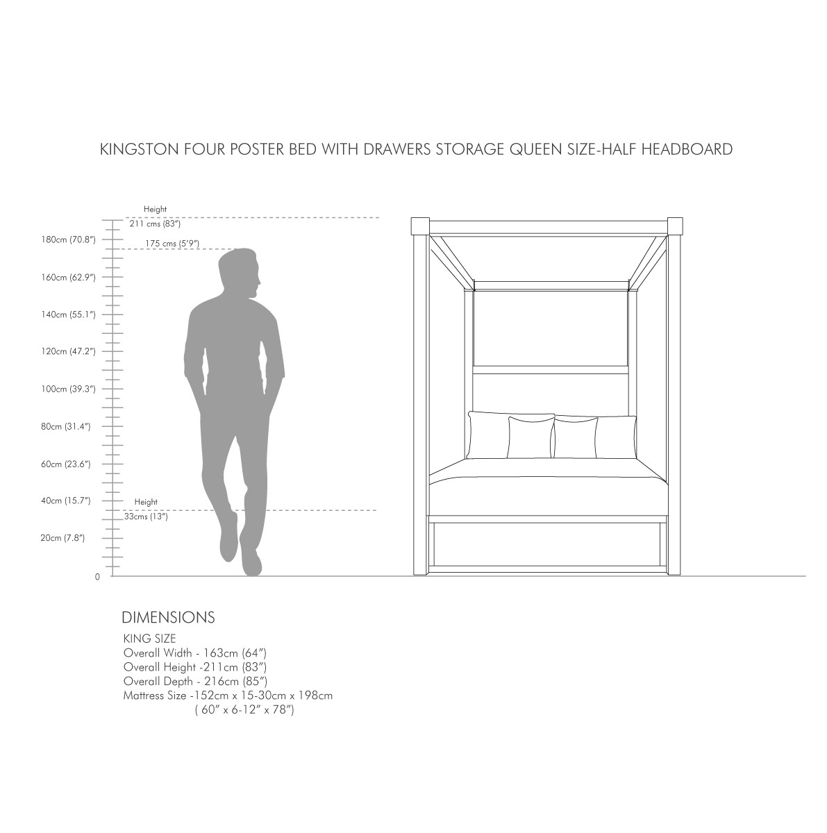 Overall Queen: 163cm W x 216cm D x 211cm H (64" W x 85" D x 83" H)