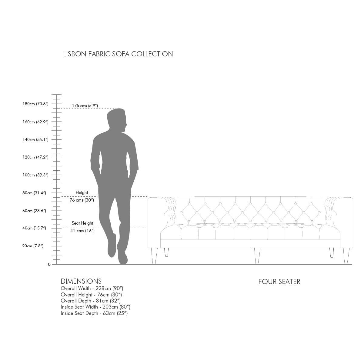 4 Seater: 228cm W x 81cm D x 76cm H (89.7" Width x 31.8" Depth x 29.9" Height)
