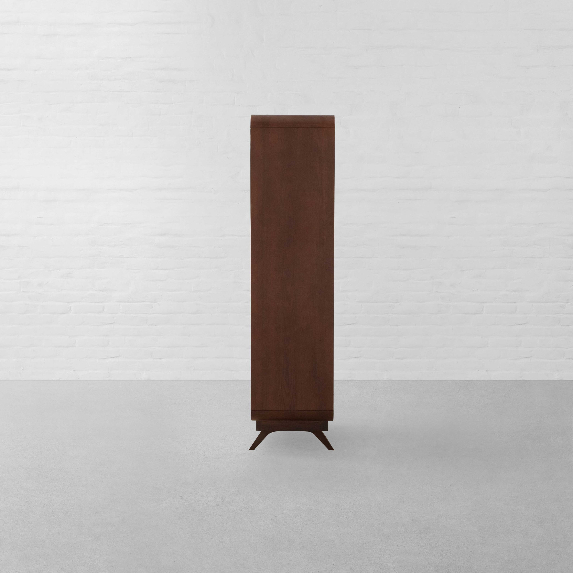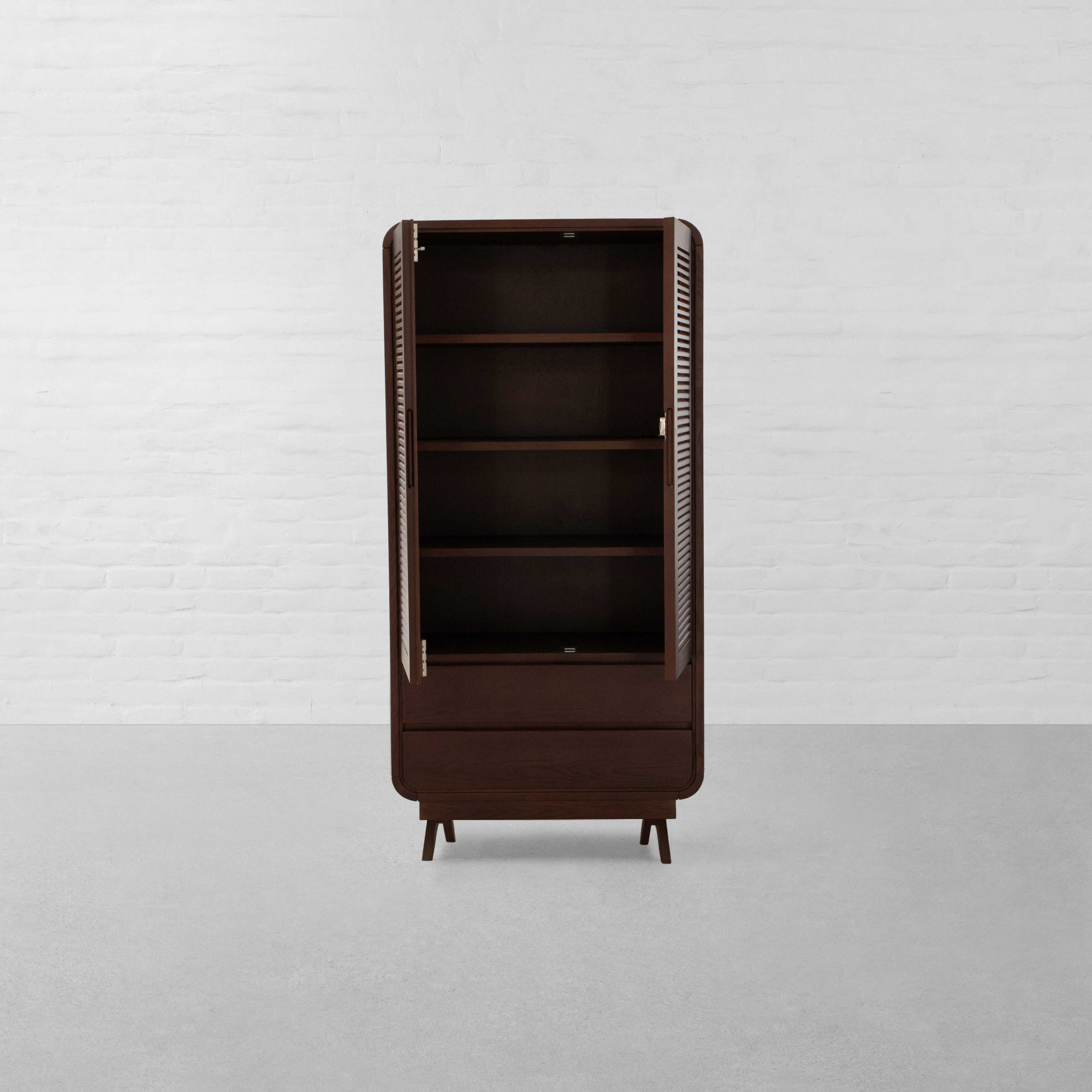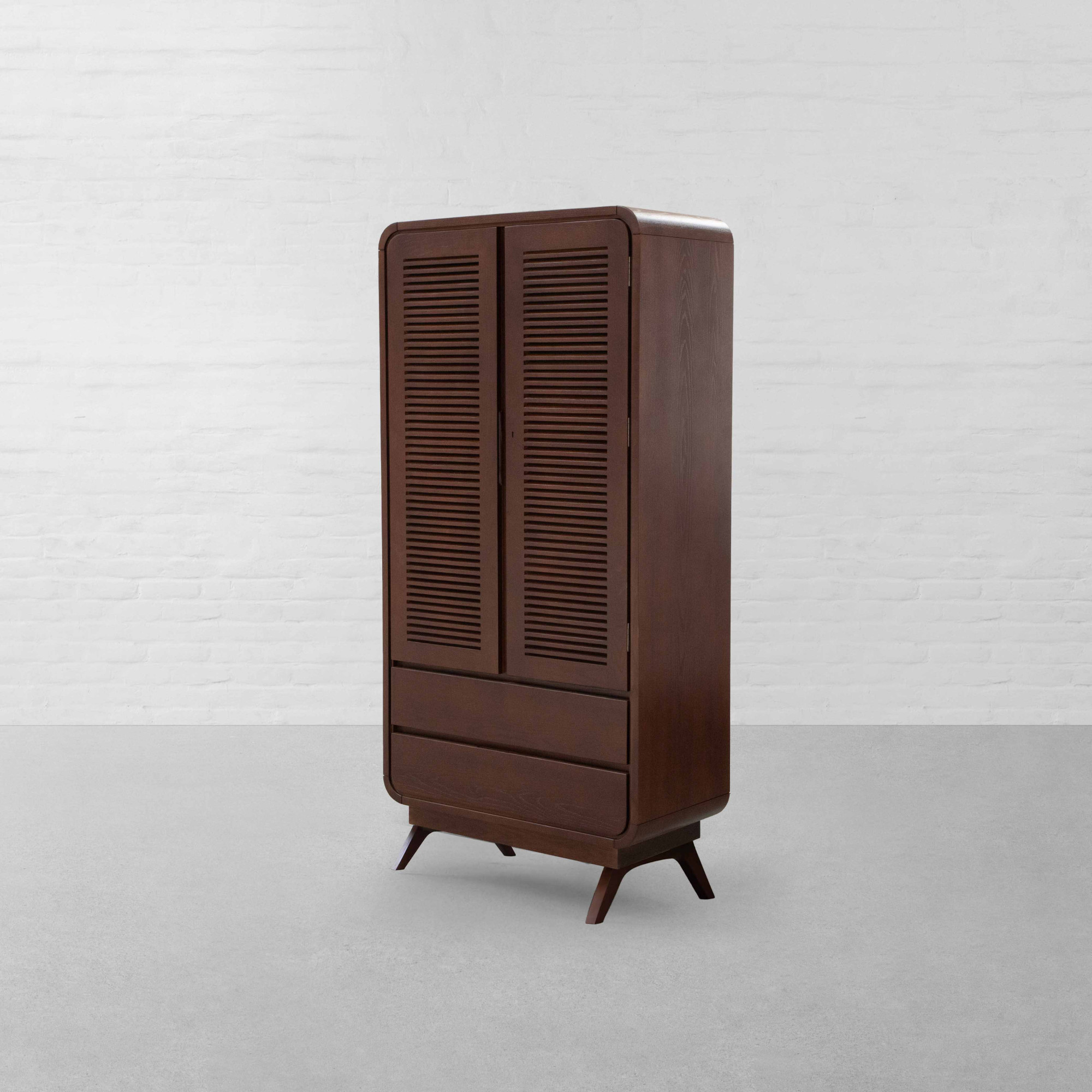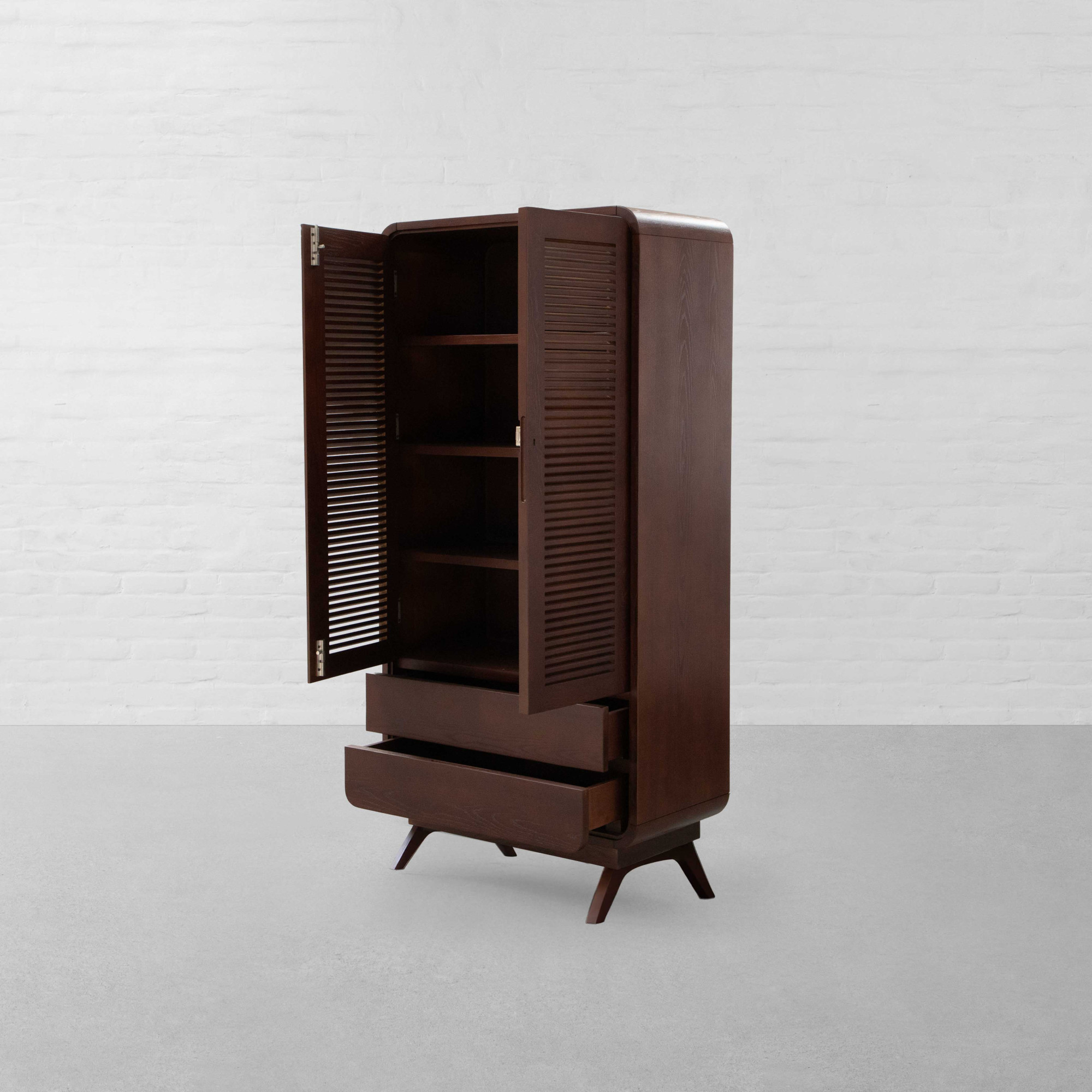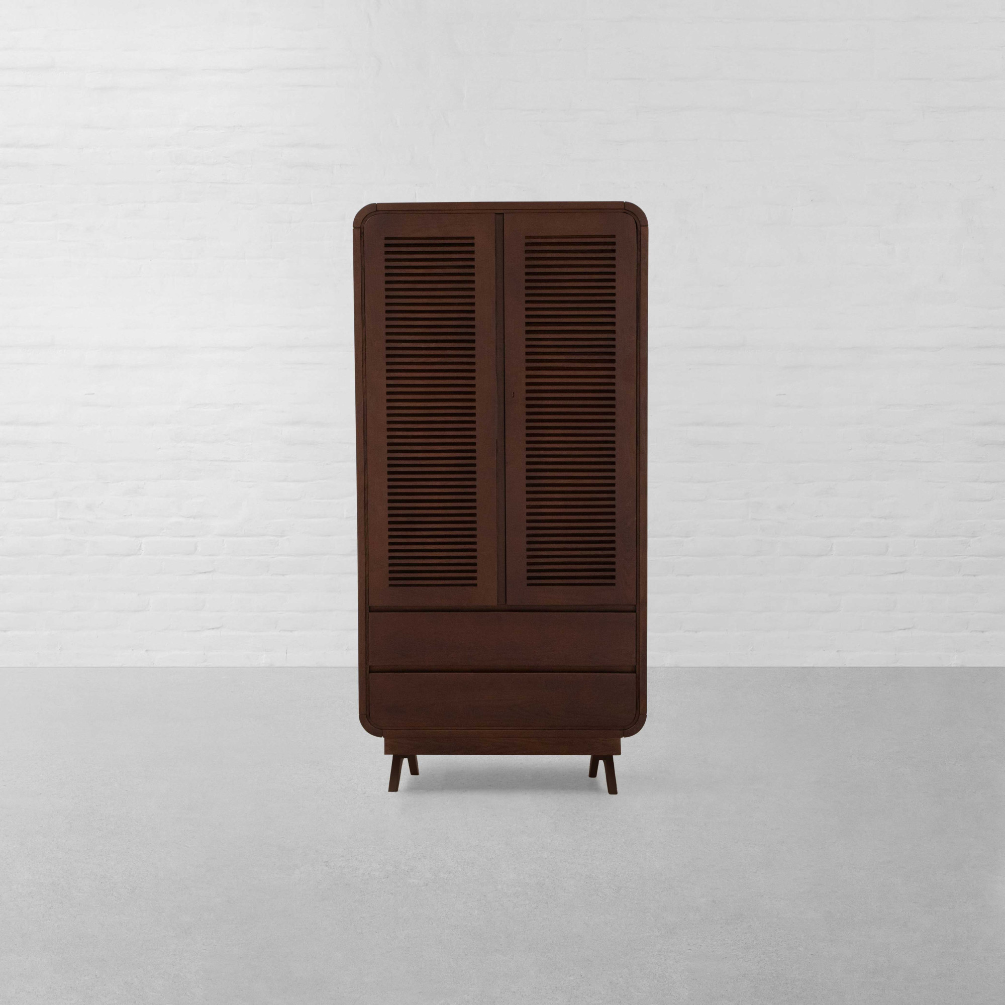 With the timeless appeal of colonial style, the striking lines and shapes of Art Deco, and the chic elegance of the French style, our Malabar Hill Cupboard adorns a Minimal-Deco look. Steeped in South Bombay style décor, two tall doors adorned with French wooden louvers open to reveal four wooden shelves - perfect for storing everything from bath towels and bed linens to chunky sweaters and folded garments. This ensemble also features two easy-access drawers at the bottom to manage clutter efficiently. Smooth, rounded corners with solid wooden legs complete the look of this multi-utilitarian design.