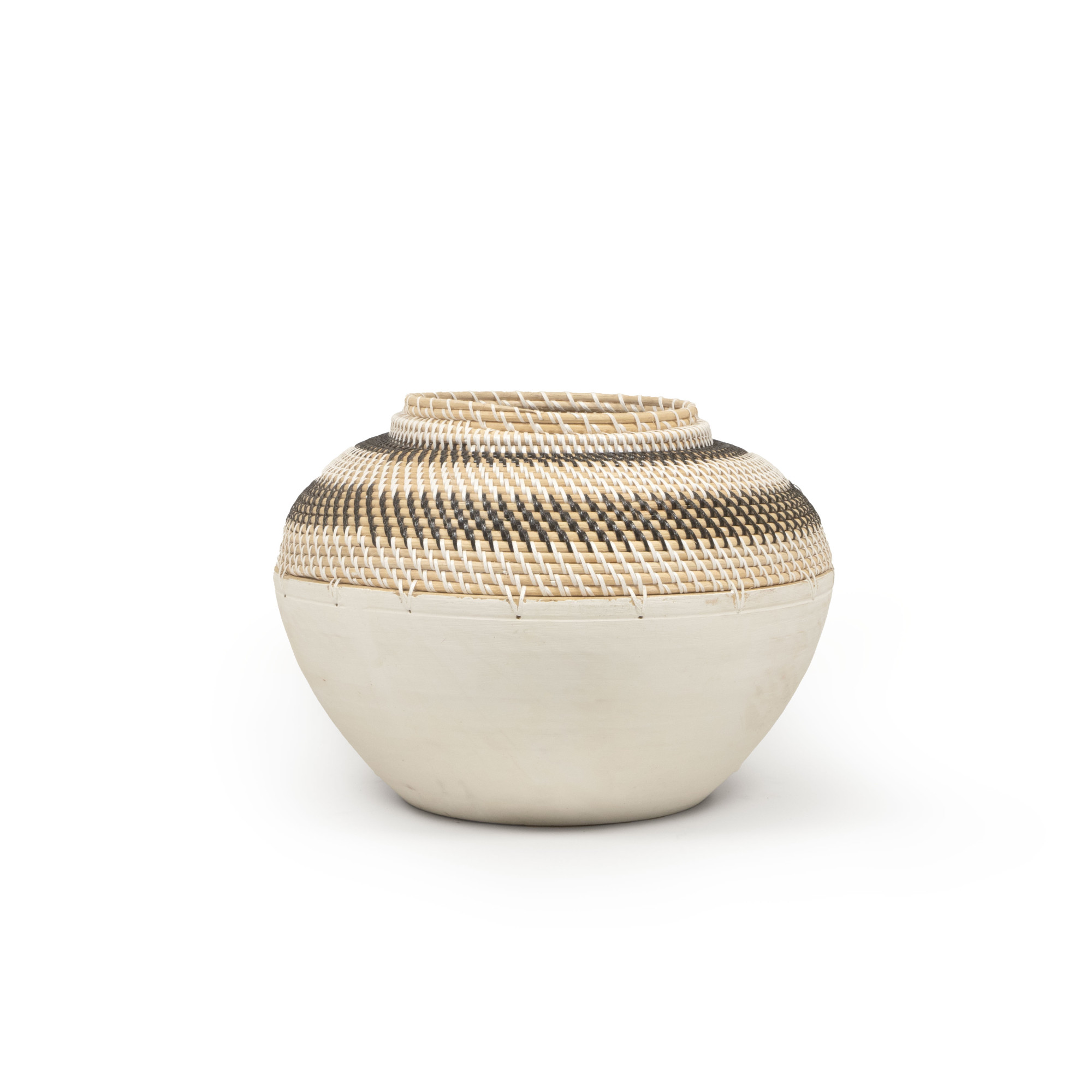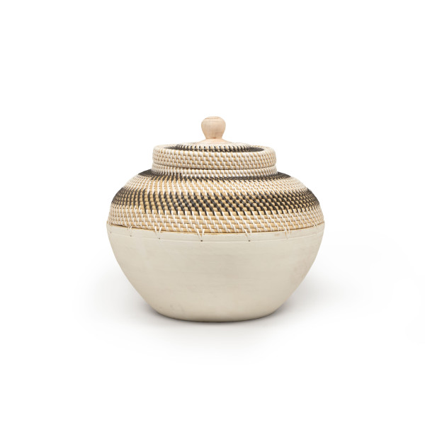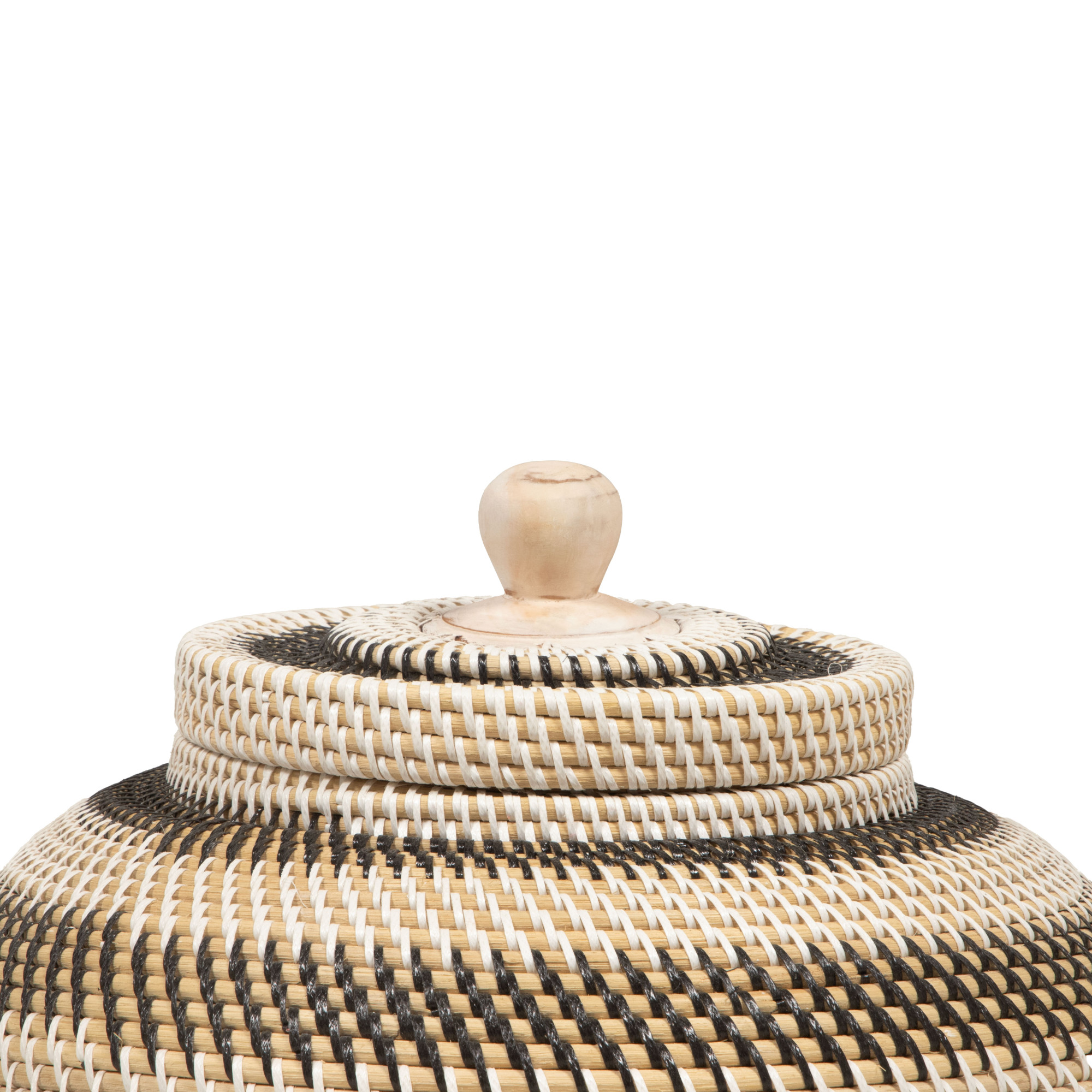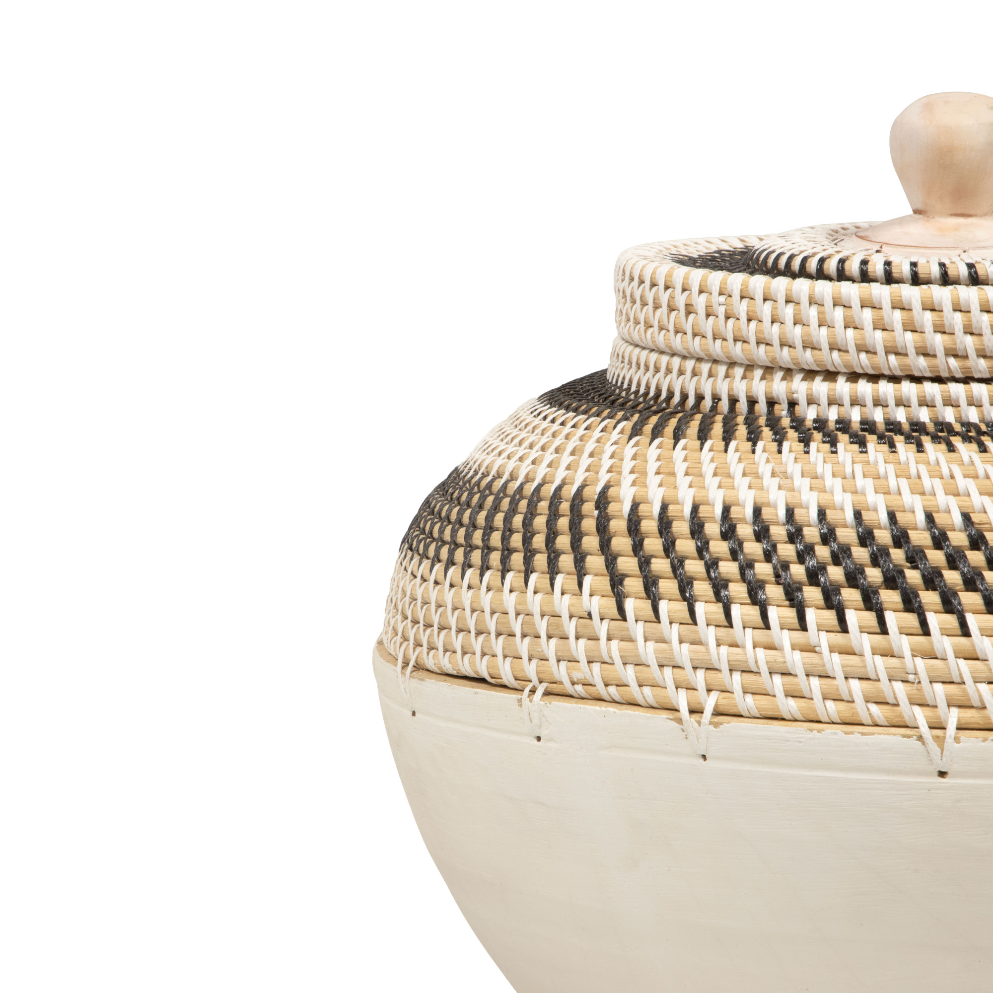 A piece where artistry meets nature's rhythm, our Malay Decorative Pot with Lid captures the essence of rustic refinement, offering beauty and discreet storage. The dome base, carved from solid wood, is graced with a soft white-washed finish, providing a durable, grounding contrast beneath the lid. Above, handwoven rattan and dual-toned cane form an intricate tapestry of stripes, where the interplay of light and shadow achieves a perfect, quiet harmony. Every curve and contour of this vessel whispers the story of skilled craftsmanship, a lineage where each weave, knot, and grain has been patiently shaped by the human hand. The contrasting tactile feel of smooth polished wood and the natural coarseness of cane brings a quiet depth to any setting. Whether styled solo upon a console, shelf, or center table, it stands as a singular décor accent, or it may be beautifully paired with dried botanicals to achieve a grounded, organically inspired tableau.