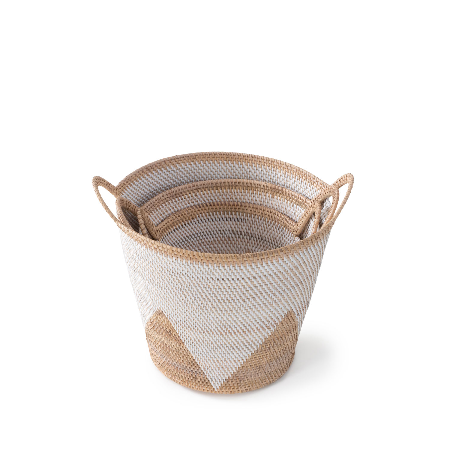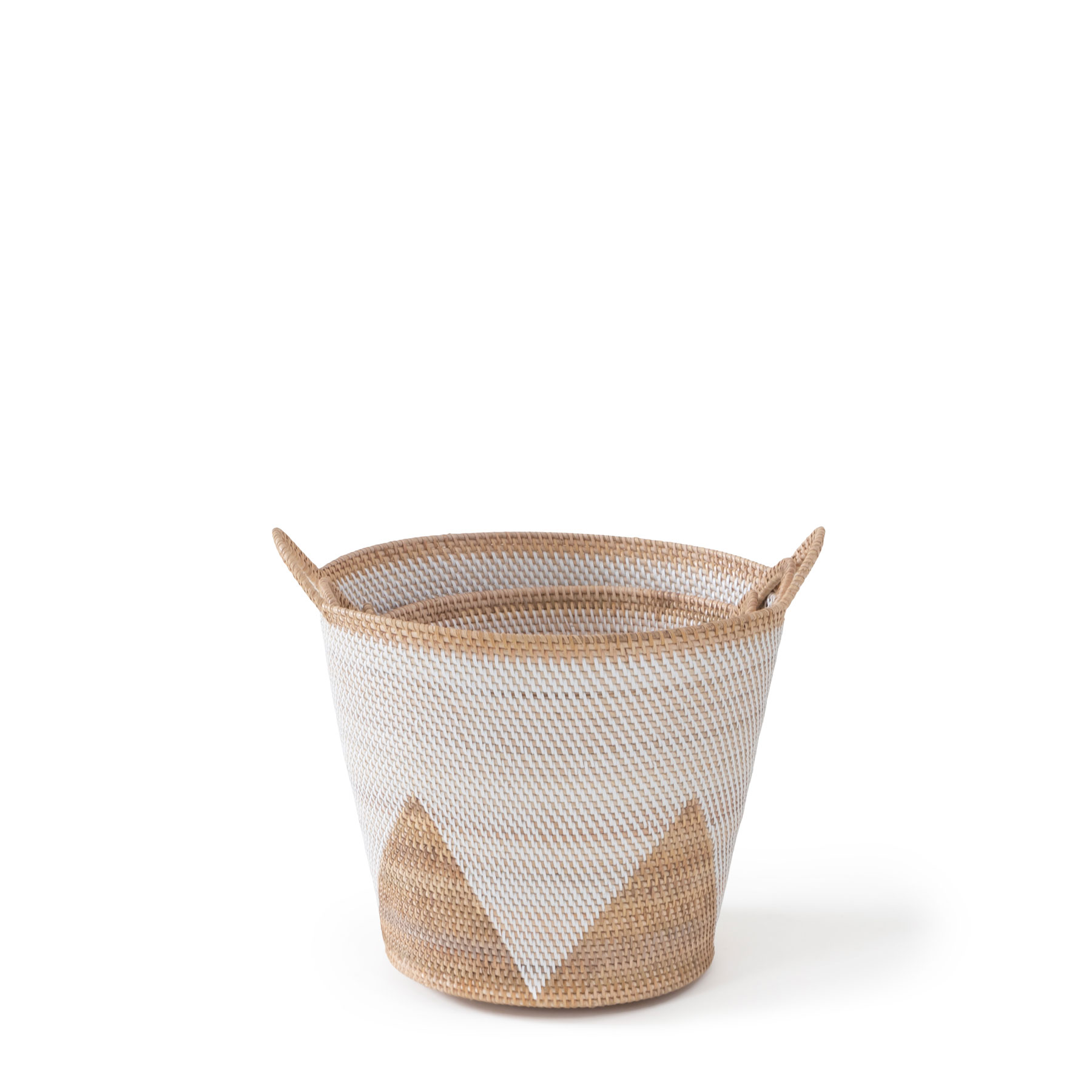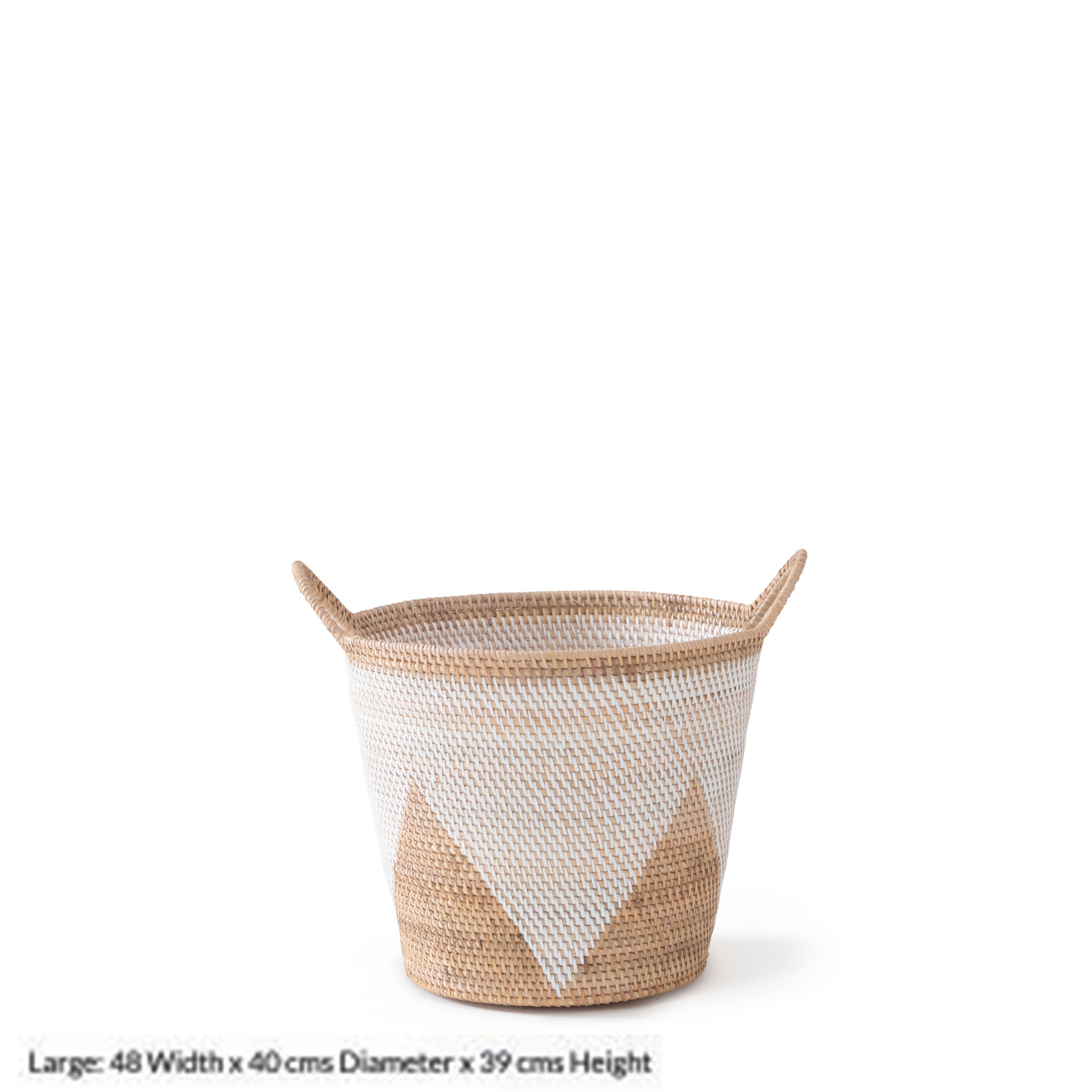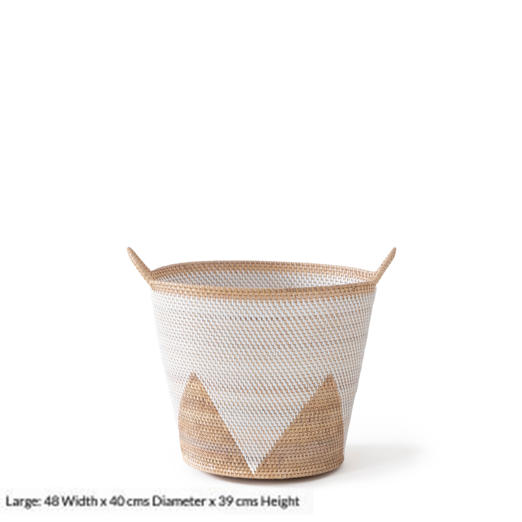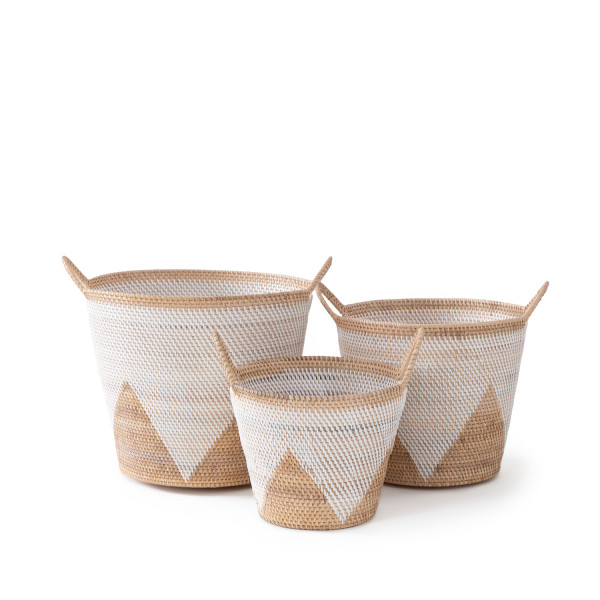 The nuance of natural rattan and the timelessness of hand weaving is celebrated in every thread of this ensemble. Add a coastal flair to your interior setting with our Malay hand-woven basket in Natural & White Finish. Adorning a structured triangular pattern with calming movement, this design masters and adapts the age-old technique of basket weaving in a modern way. A subtle yet eye-catchy statement featuring intriguing patterns and a classic texture, you'll be proud to show it off while you store away your essentials in there!