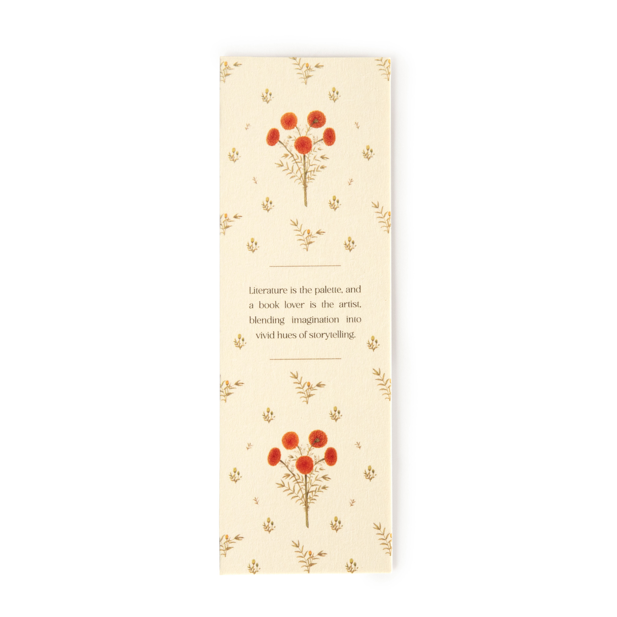 Inspired by the quote “Literature is the palette, and a book lover is the artist, blending imagination into vivid hues of storytelling,” the Marigold Bouquet Bookmark brings a quiet sense of beauty to every page you pause upon. Delicately illustrated marigolds bloom against a soft, neutral ground, echoing the charm of hand-drawn florals and timeless print traditions. Tucked between chapters, it feels thoughtful and personal—an elegant companion for slow reading and treasured books. A lovely addition when gifting a book, adding a layer of care that lingers long after the last page is turned.