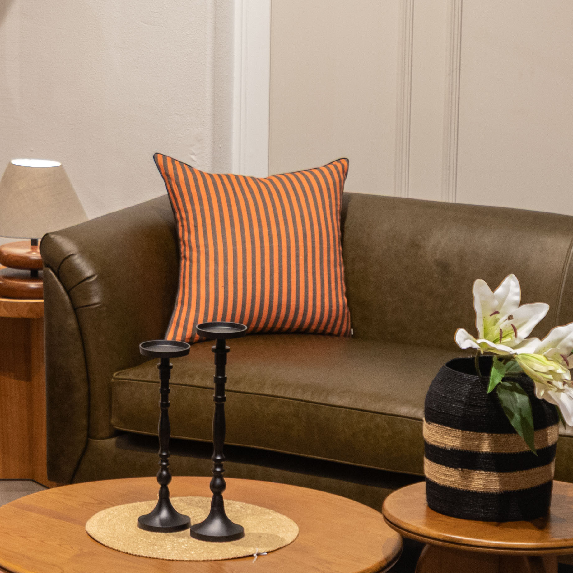 Bold yet rooted in tradition, the Marigold Stripe Cushion Cover reimagines the vibrancy of wedding marigolds into a graphic play of lines. Alternating stripes in festive orange and grounding charcoal evoke the garlands and drapes that bring rhythm and structure to celebrations. The linear design lends a contemporary edge while carrying the essence of festivity, making it perfect for layering with florals or solids. Style it on sofas, accent chairs, or beds to create a look that feels both striking and celebratory, with a timeless Indian artistry woven through every detail.