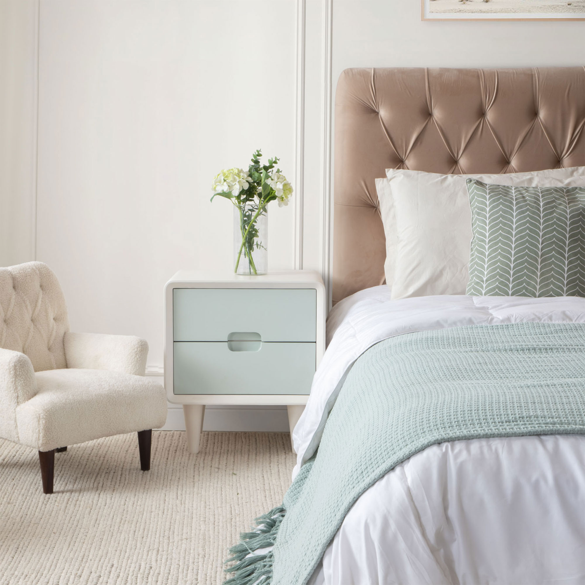 Inspired by the Edwardian and Victorian era beds, Gulmohar Lane’s Montage bed’s elegant silhouette is wrapped in sumptuous natural fabrics with deep tufts and linear shape.. The exquisitely hand-tufted headboard is a work of art, adding textural and dimensional interest to your bedroom decor.