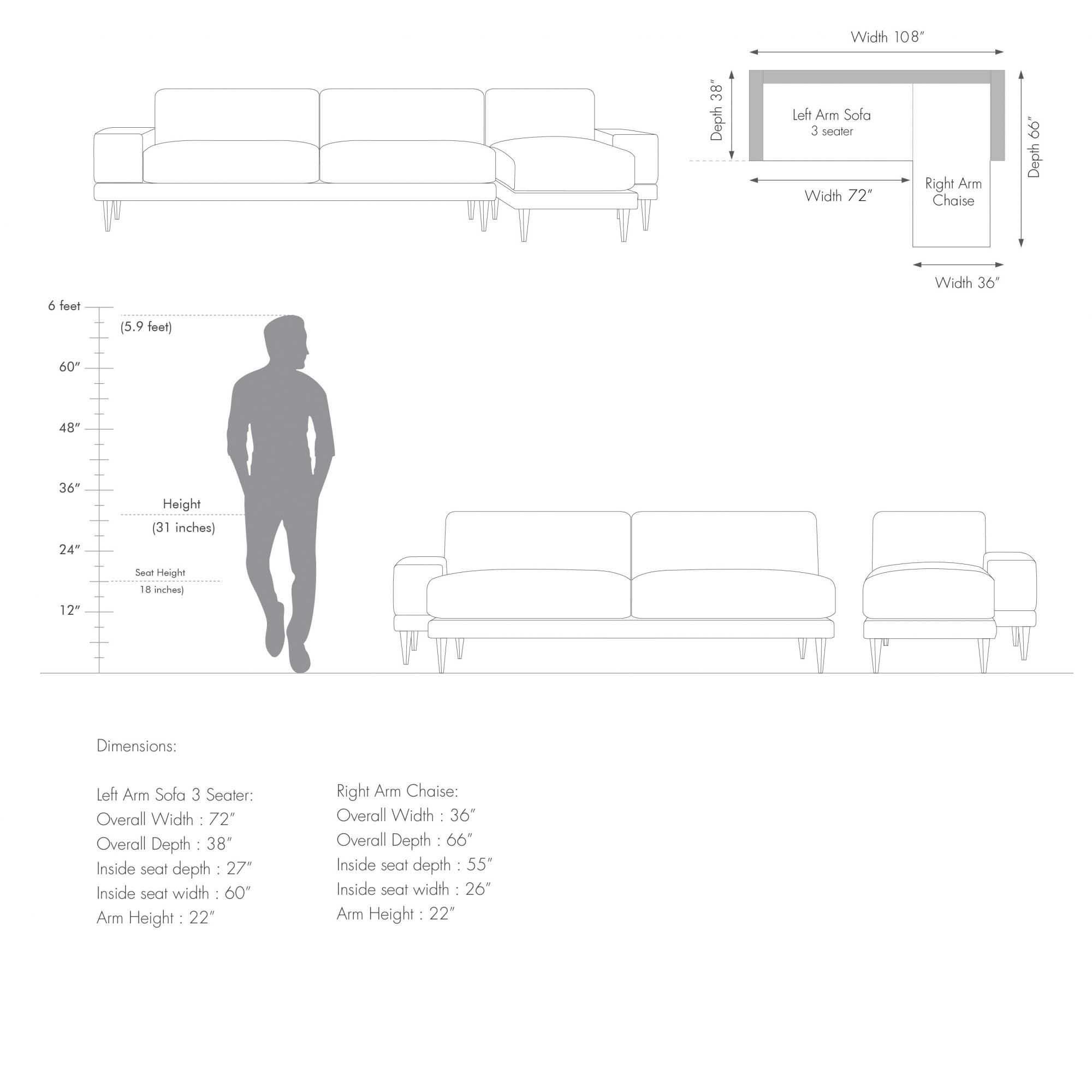 Left/Right Arm 3 Seater Sofa: 183cm W x 96cm D x 79cm H (72" Width x 38" Depth x 31" Height)