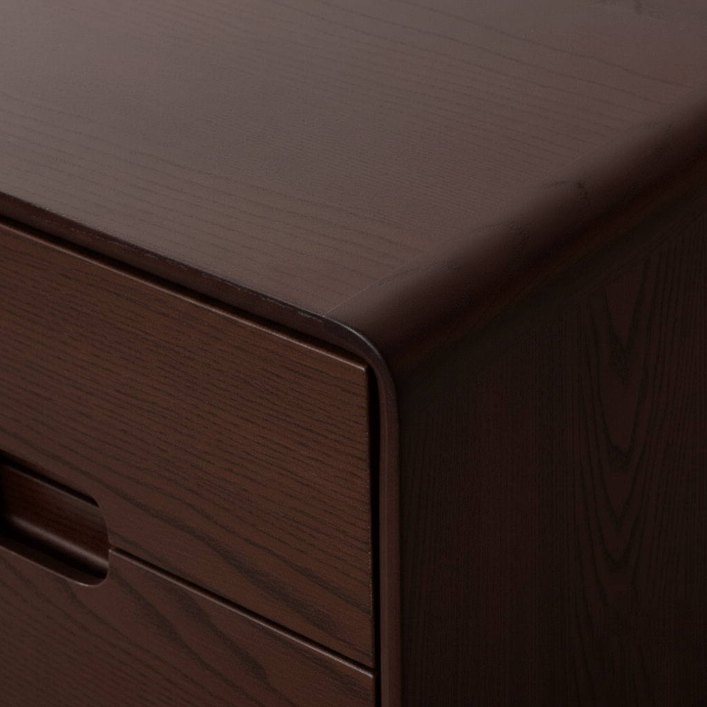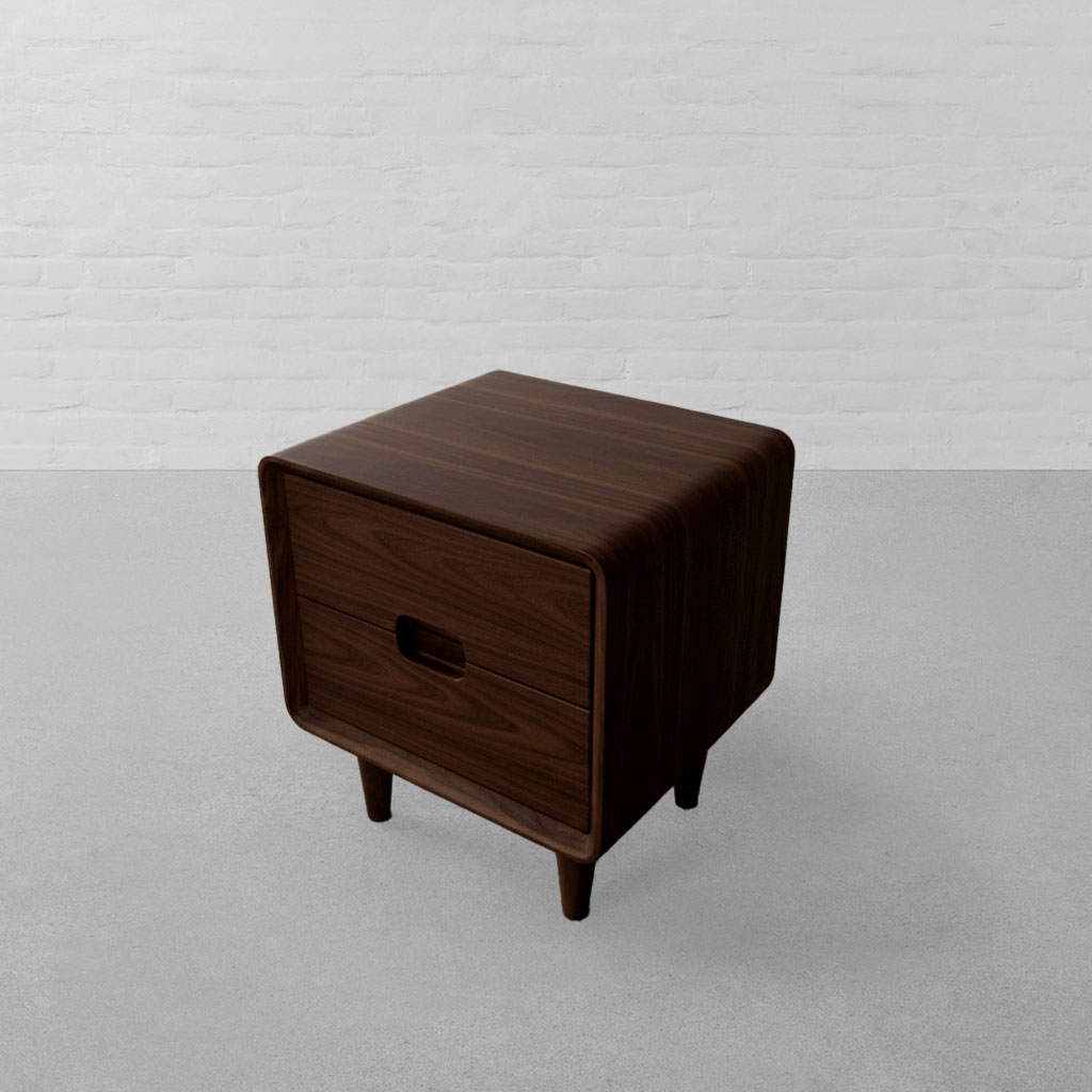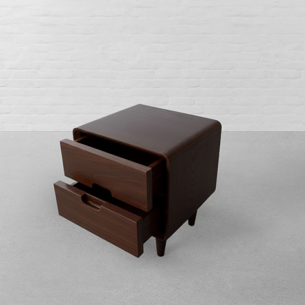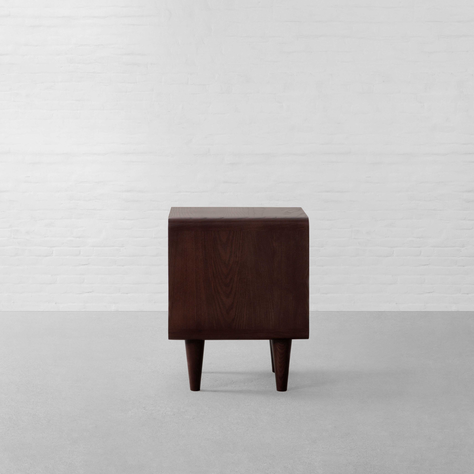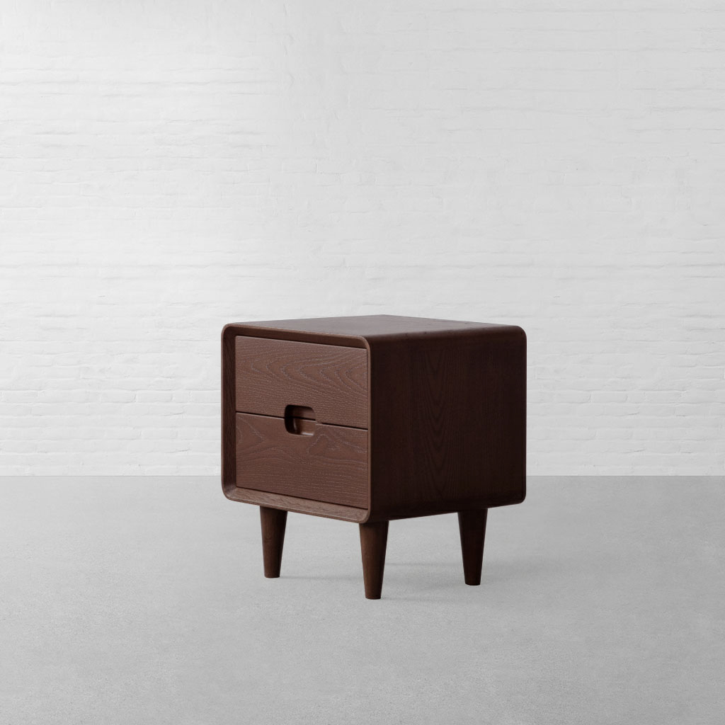 With its refined geometry and understated detailing, our Nottingham Side Table draws from classic European cabinetry while settling comfortably into a contemporary, minimal setting. Clean lines and a compact, structured silhouette give the piece a composed presence, while the richness of solid wood brings warmth and quiet depth to its form. The design features a smoothly integrated drawer with a subtle carved pull, allowing the surface to remain uninterrupted and visually clean. Softly rounded edges frame the body, easing the geometry and giving the table a balanced, thoughtful finish. The natural wood grain remains visible throughout, adding character and texture without excess ornamentation. Raised on gently tapered legs, the Nottingham Side Table feels light yet grounded. It offers practical bedside storage for books, small essentials, and everyday objects, keeping the space organised without visual clutter. Suitable for bedrooms or living spaces, it pairs effortlessly with upholstered beds, linen textiles, and warm lighting bringing together solid craftsmanship, restrained detailing, and everyday functionality in a compact form.