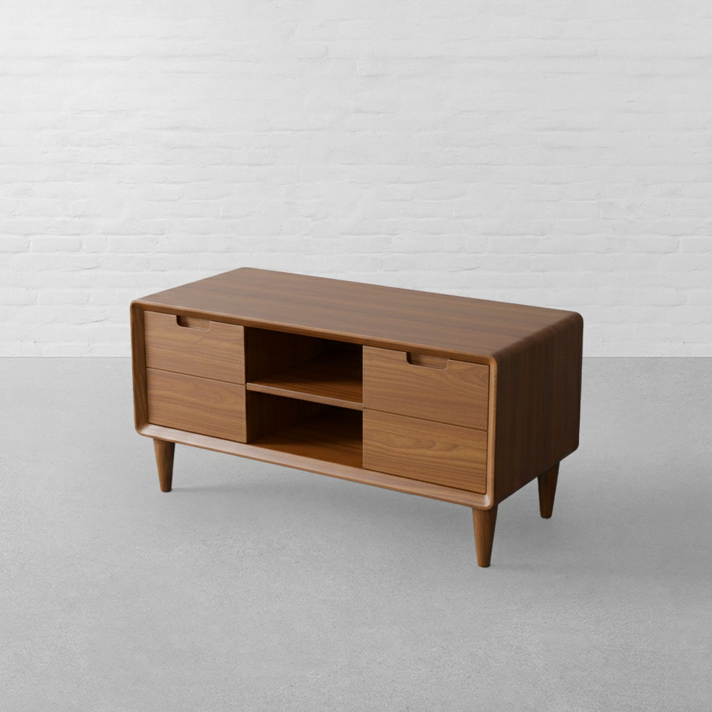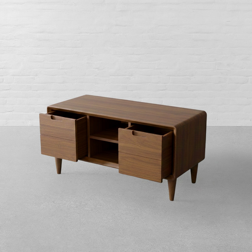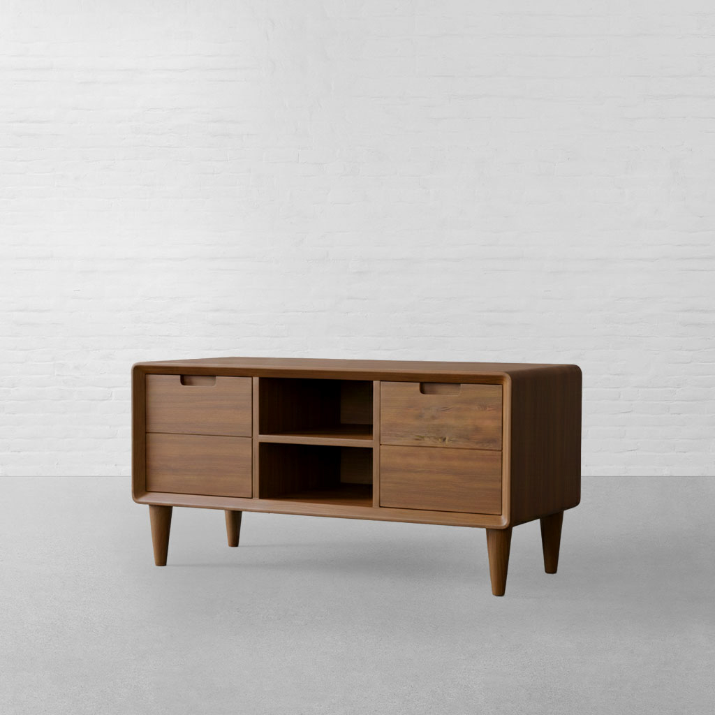 With its structured silhouette and softened edges, the Nottingham TV Unit carries forward the quiet geometry that defines the collection. Inspired by classic European cabinetry, the piece balances clean lines with the warmth and depth of solid wood, allowing it to sit comfortably within contemporary living spaces. The unit features a thoughtfully arranged layout two enclosed cabinets flank open central shelving, offering a practical mix of concealed and accessible storage. Subtle carved pulls are integrated into the wooden doors, maintaining a seamless surface and uninterrupted visual flow. The open shelves are proportioned to house media units, books, and decorative objects with ease. Gently rounded edges frame the body, softening the rectangular form and giving the unit a composed, balanced presence. Raised on tapered legs, it feels light yet grounded, preventing the piece from appearing bulky within the room. Suitable for living rooms and media spaces, the Nottingham TV Unit pairs effortlessly with neutral upholstery, textured rugs, and warm ambient lighting, offering practical storage shaped by solid materials and restrained detailing.
