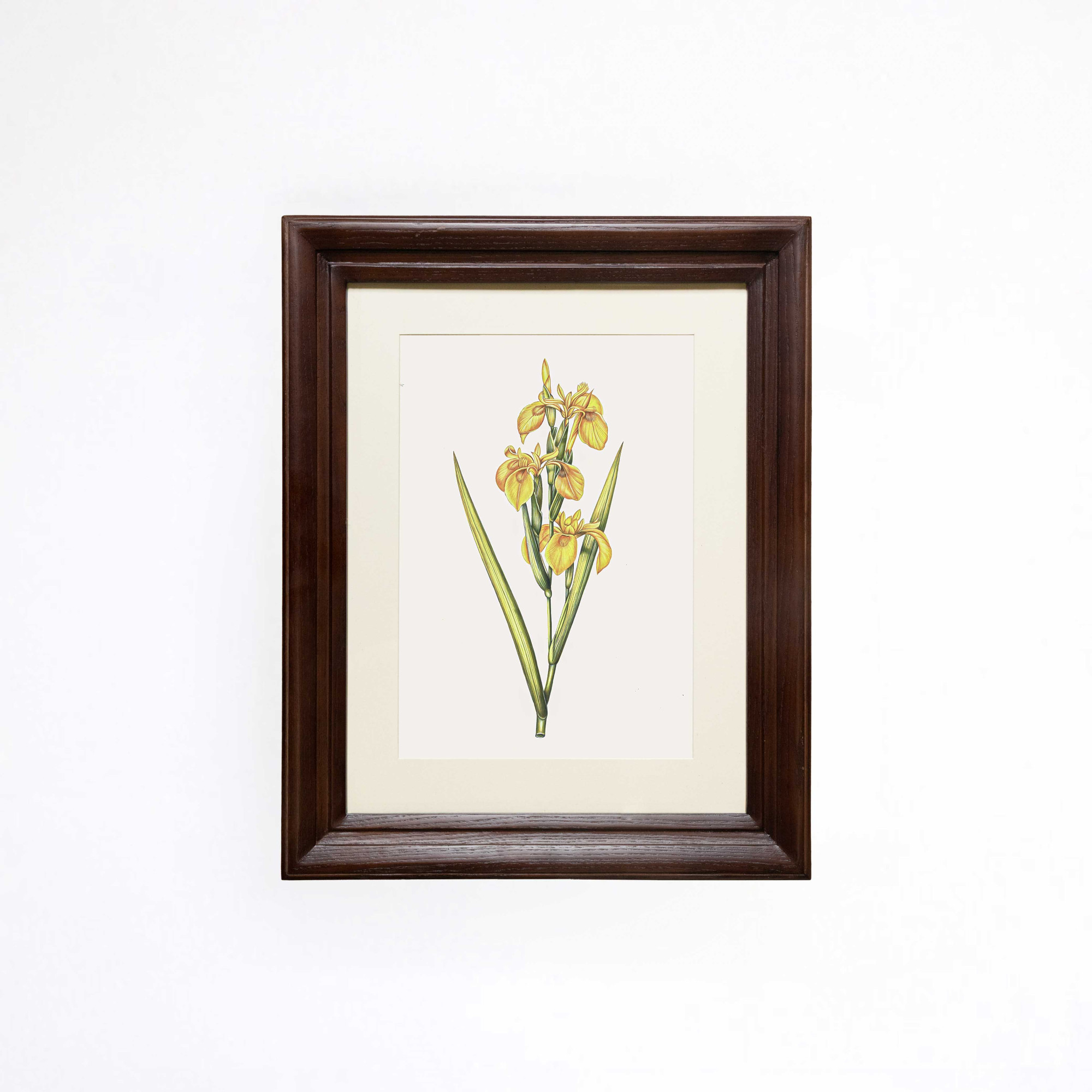 A luminous golden piece, our Ochre Iris Bouquet Printed Artwork captures the radiant, sun-drenched beauty of a wild iris cluster. Originally hand-painted, the artwork features three main blossoms in a striking shade of ochre-yellow, their broad, ruffled petals displaying soft amber gradients toward the edges. The composition is grounded by slender, spear-shaped leaves in a different shade of olive green, which fan out to provide a sharp, structural contrast to the delicate blooms. This artwork is printed on a thick, antique-style sheet, meticulously preserving the rich textures and earthy character of the original painting. You can observe the exceptional level of detail in the fine-lined veining of the foliage and the delicate, translucent quality of the opening buds at the crown of the stalk. Finished in a classic wooden frame, the piece carries the storied charm of a vintage botanical discovery. It brings a sophisticated verticality and a warm, organic glow to a well-lit library, a colonial-style veranda, or a refined dining space.