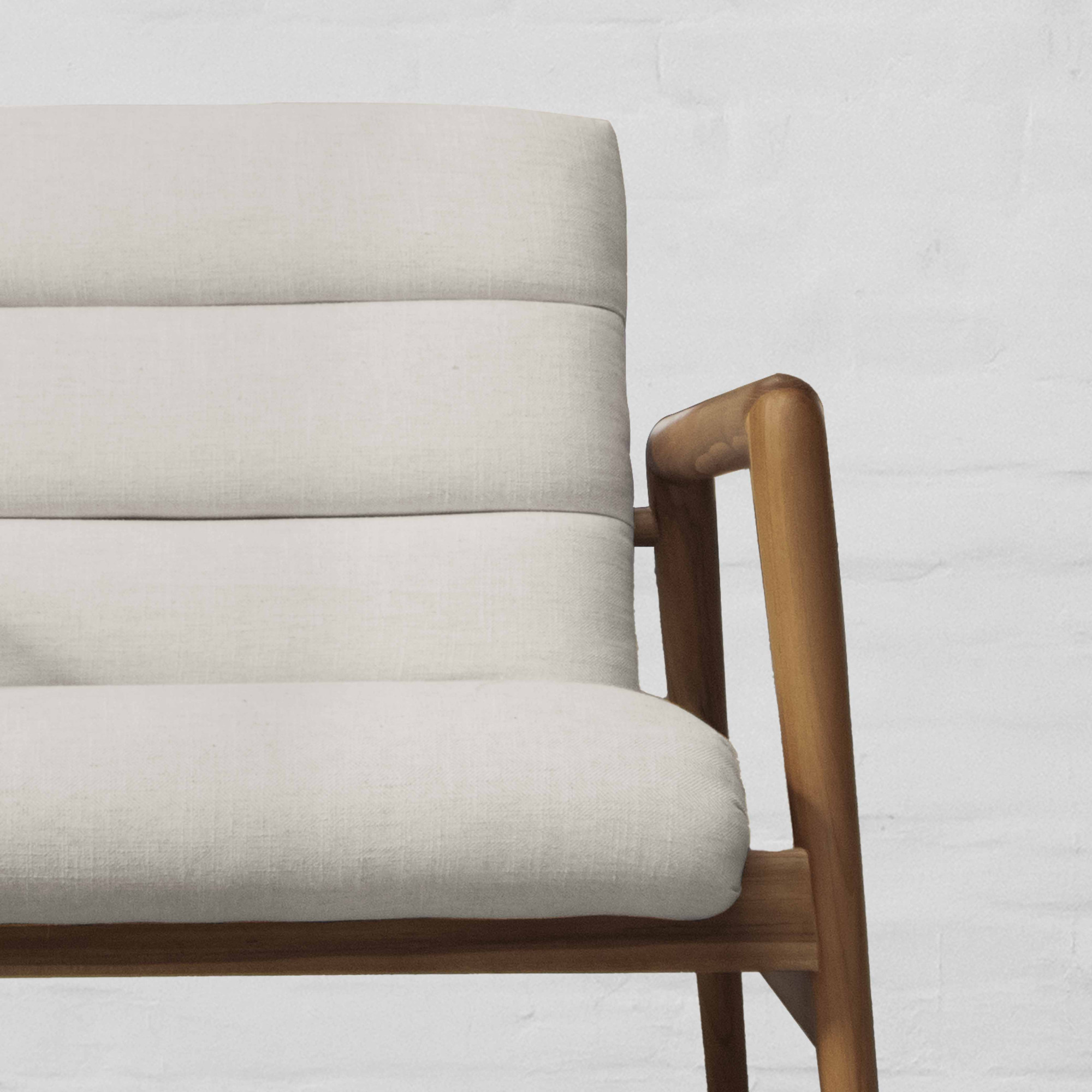 Inspired by the clean lines and functional beauty of Scandinavian design, our Odense Armchair embodies simplicity and comfort. Crafted from premium teak wood, its sleek frame is both sturdy and elegant, making it an ideal choice for modern and minimalistic interiors. Its upholstered seat features subtle horizontal tufting that enhances both comfort and visual appeal, while maintaining a minimalist aesthetic. With its understated yet refined profile, this armchair embraces the beauty of minimalist design while maintaining a lightweight appearance, perfect for creating an airy, serene space.