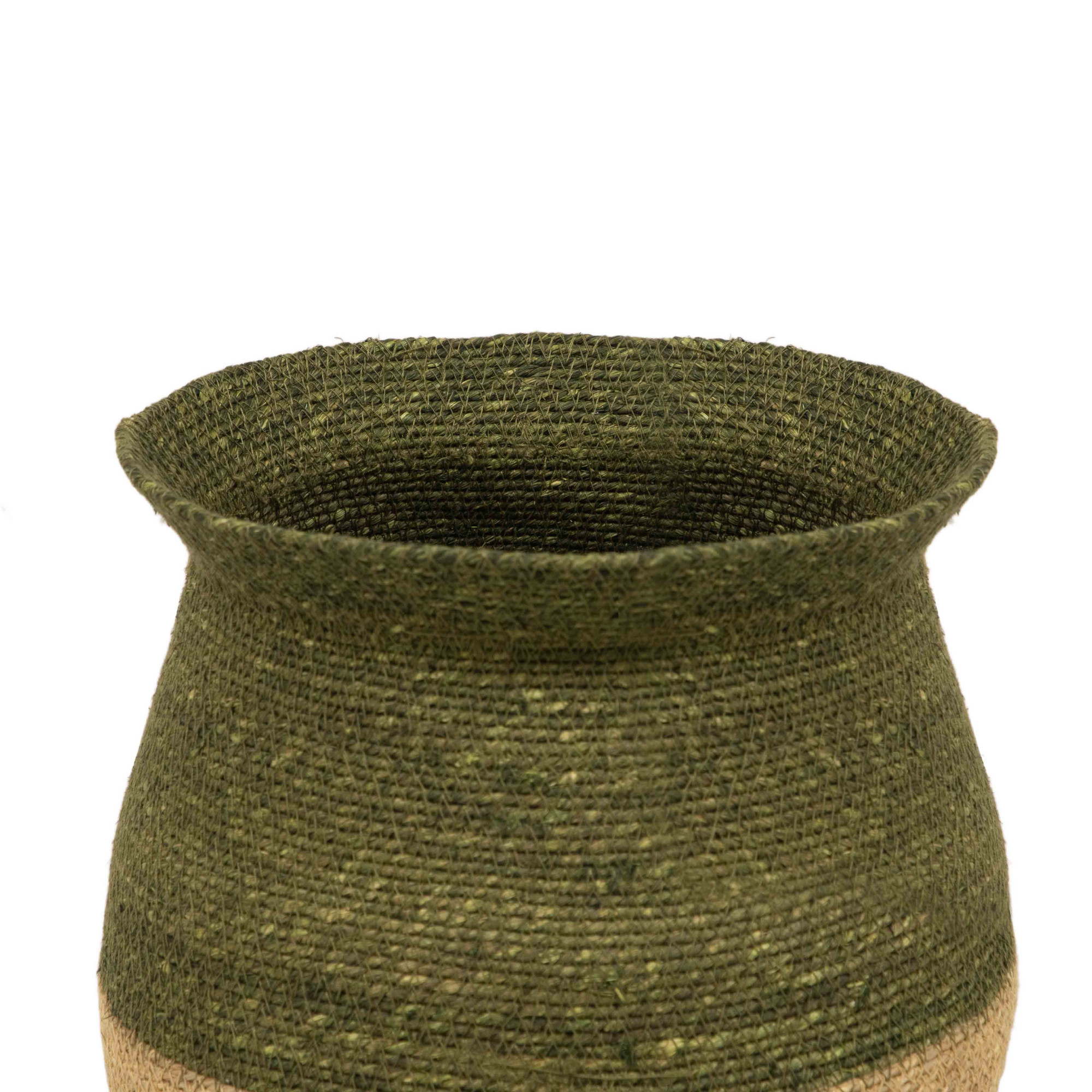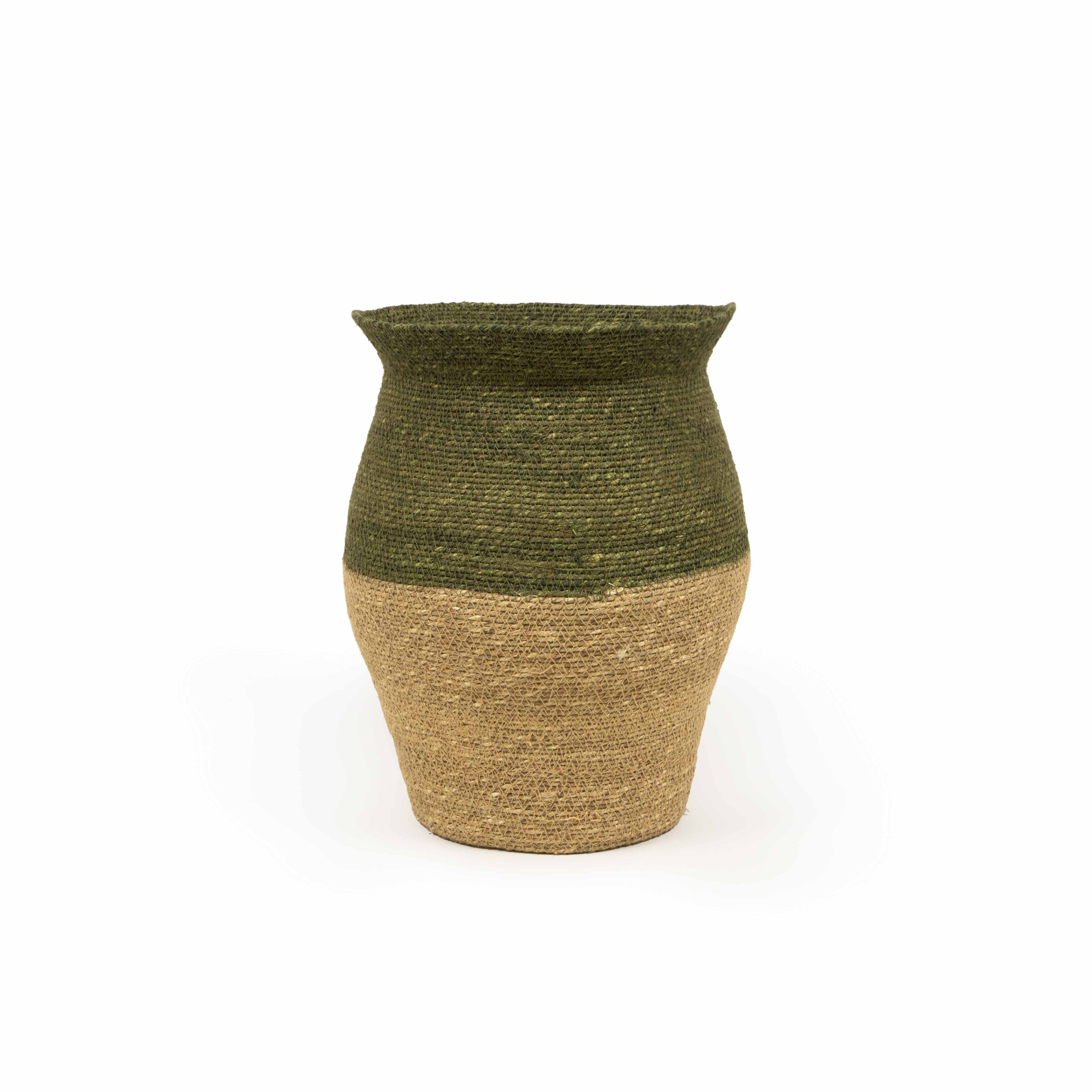Our Olive Block Vase is a striking fusion of natural texture and modern color. Expertly hand-woven from durable Seagrass, the vase features a tactile, hourglass curving silhouette that is both organic and highly distinct. The design is defined by a bold, horizontal color division, creating a refined block effect. The bottom half showcases the warm, neutral beige of the natural seagrass, grounding the piece with earthy texture. The top half is fully enveloped in a deep, rich Olive green, woven directly into the fiber to create a sophisticated, jewel-toned band that draws the eye upward. Use this vase as a statement cachepot to stylishly conceal potted plants, or let it stand alone as a purely decorative object on a console or shelving unit. The Olive Block Vase is an artisanal accent that introduces saturated color and luxurious texture to any contemporary setting.