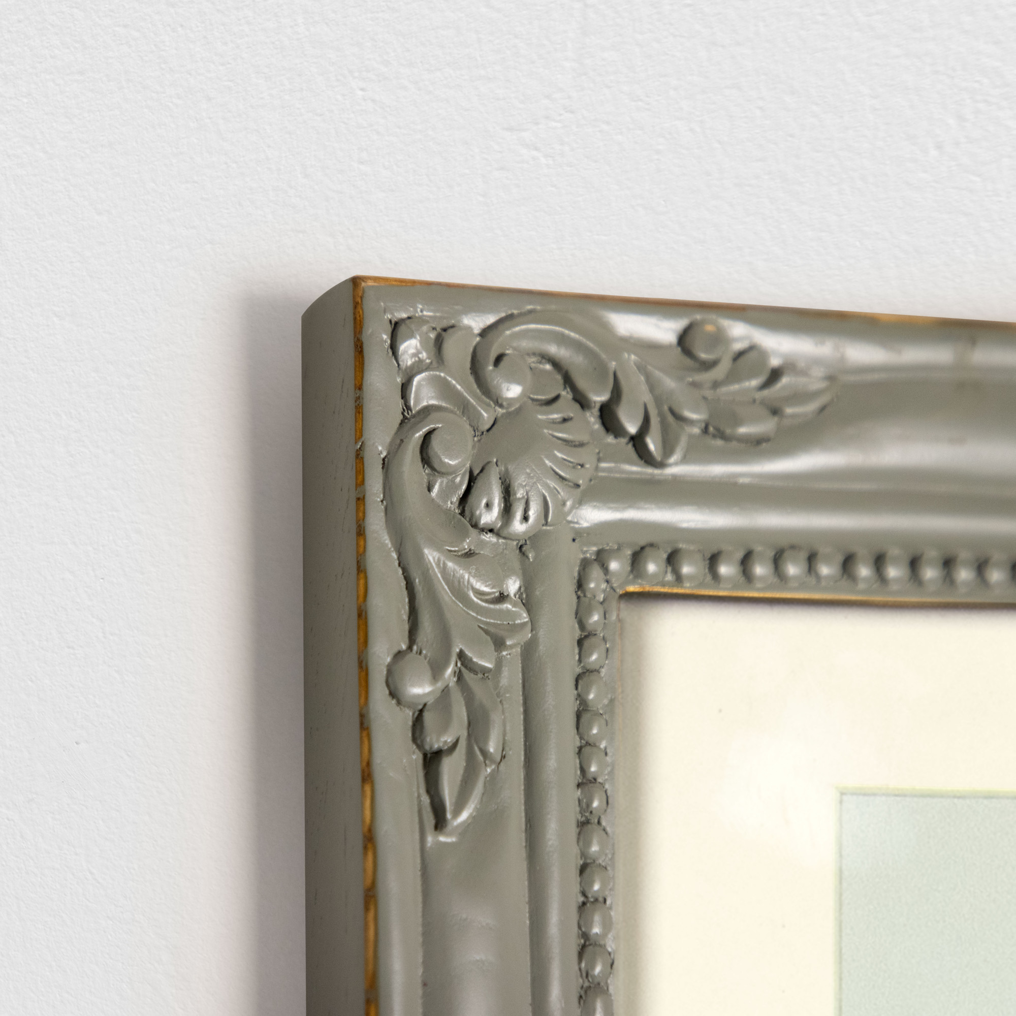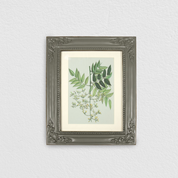 This botanical artwork captures the Persian Lilac in fine detail airy clusters of tiny blossoms with yellow-tipped petals, balanced by slender green leaves. The composition feels light and rhythmic, celebrating the plant’s natural grace.The piece sits within a hand-carved wooden frame, painted in a soft grey tone. The carved floral corners and beaded edging give it character, adding depth and quiet ornamentation without overpowering the artwork. The muted olive works beautifully with the greens and yellows of the neem, creating a piece that feels both grounded and decorative.