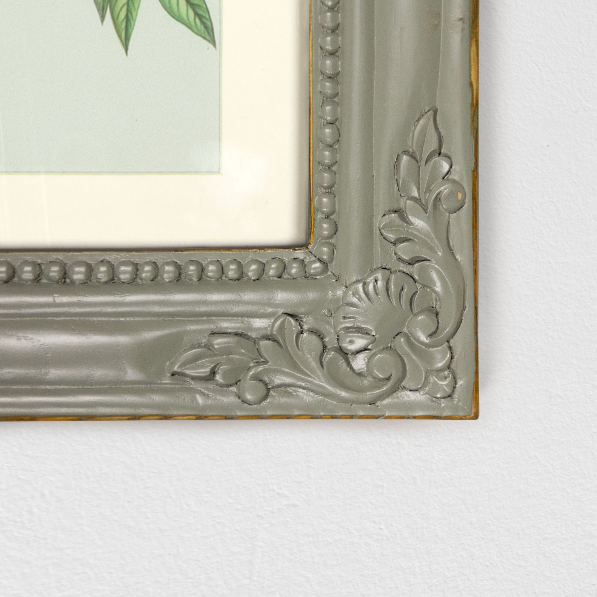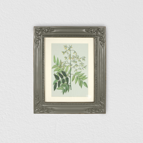 This botanical artwork captures the Persian Lilac in fine detail airy clusters of tiny blossoms with yellow-tipped petals, balanced by slender green leaves. The composition feels light and rhythmic, celebrating the plant’s natural grace.The piece sits within a hand-carved wooden frame, painted in a soft grey tone. The carved floral corners and beaded edging give it character, adding depth and quiet ornamentation without overpowering the artwork. The muted olive works beautifully with the greens and yellows of the neem, creating a piece that feels both grounded and decorative.