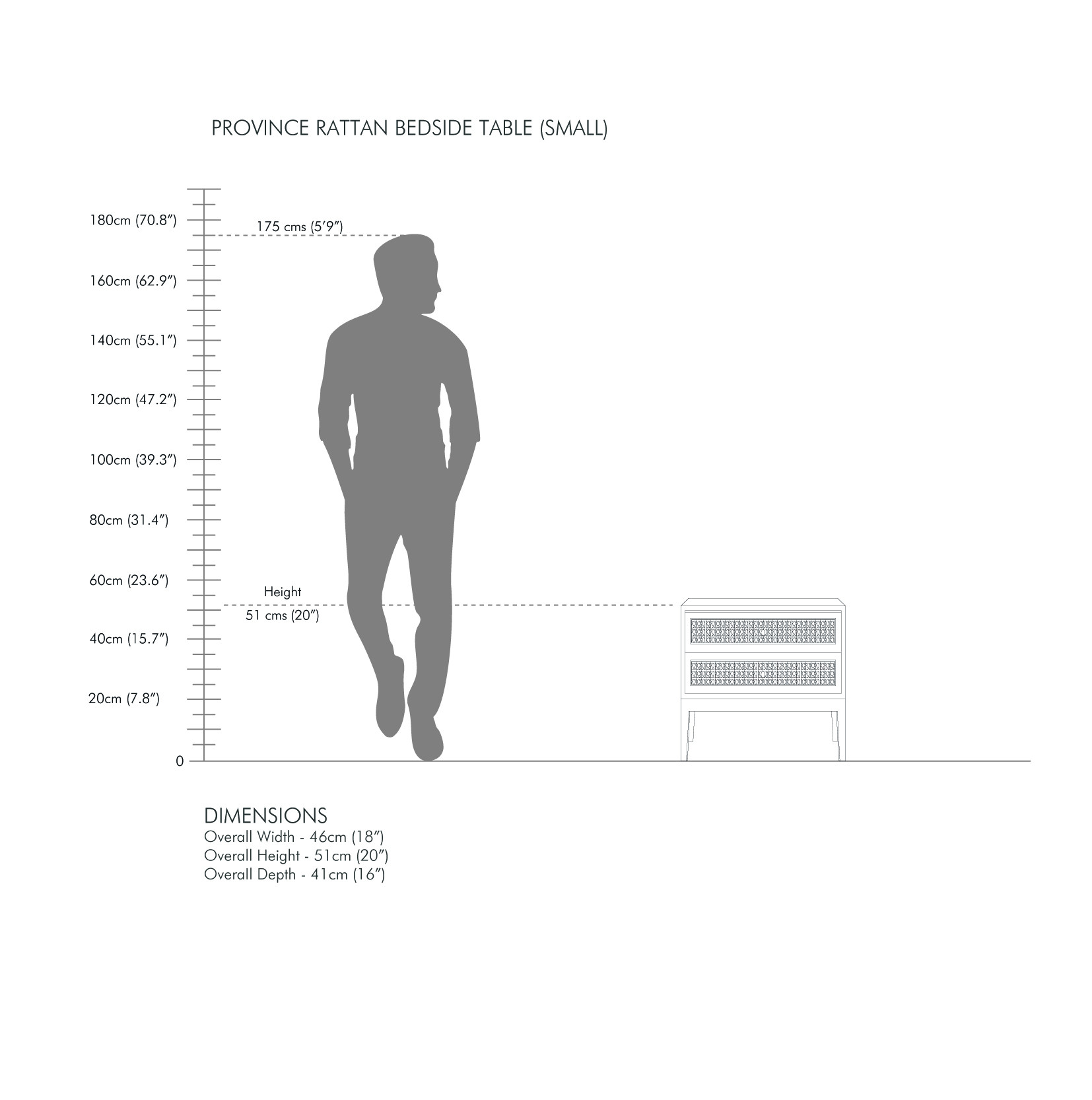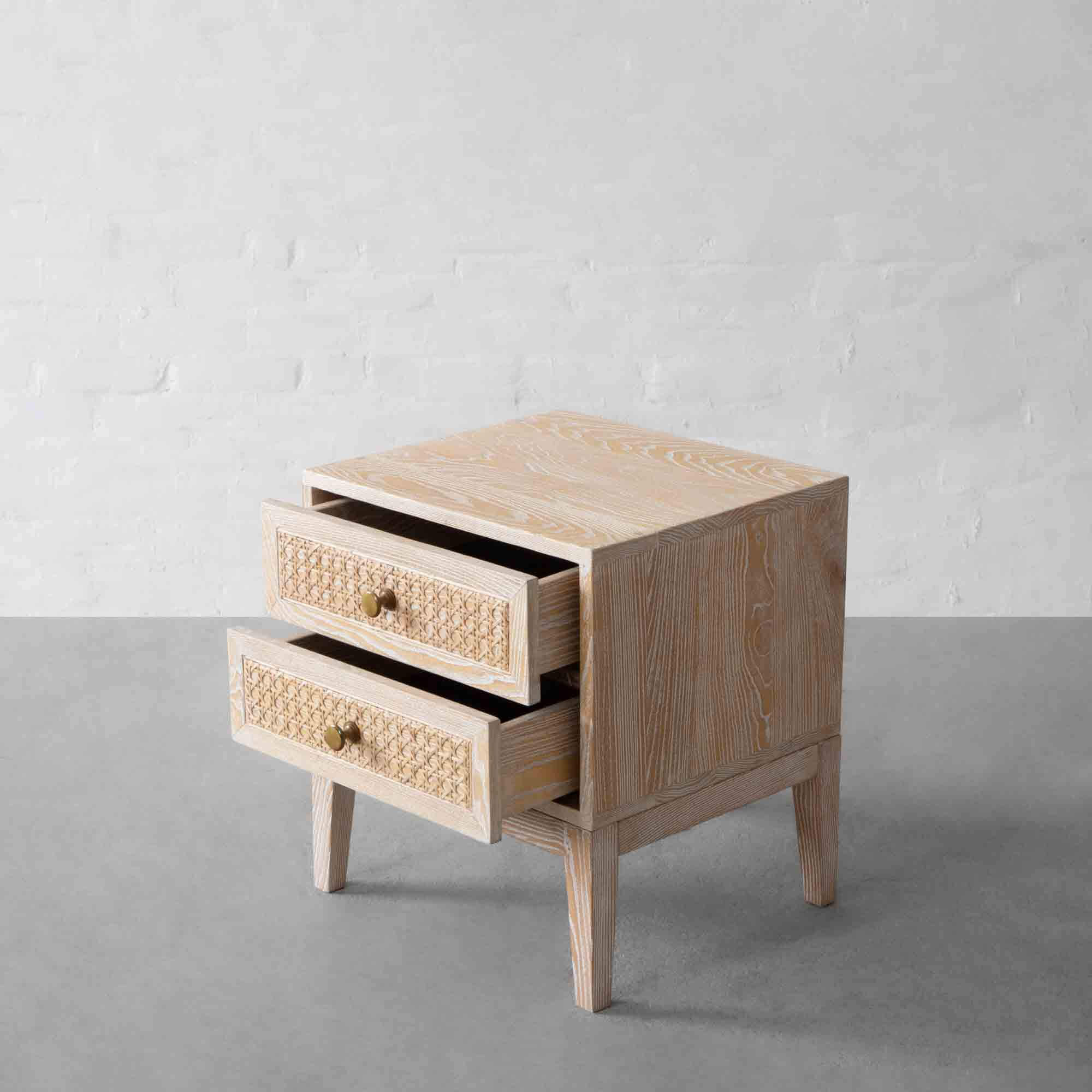 Add an element that defines French cottage styling & carries the refinement of intricate detailing. Our Province Rattan Bedside Table is handmade of hard wood with two drawer spaces uplifted with handwoven natural rattan. It carries a warm and inspirational look that blends well with most bedroom and lounge themes. With an open and spacious top paired two drawers that have gorgeous natural rattan element offer plenty of space to store books and other essentials. The province collection is a series of furniture pieces with subtly angled legs and a distinctive cottage style nostalgia. It is constructed entirely by hand to grace your home with elegant vibes.