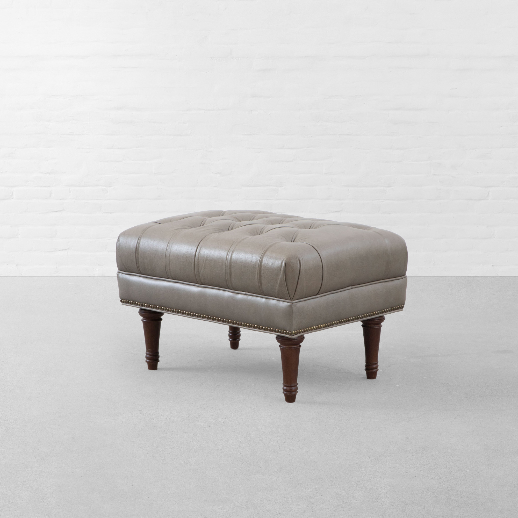 Ryan hand-tufted leather ottoman features an elegant silhouette and richly finished hand turned wooden legs. Ideal for extra seating or simply kicking up your feet in front of a cozy armchair.