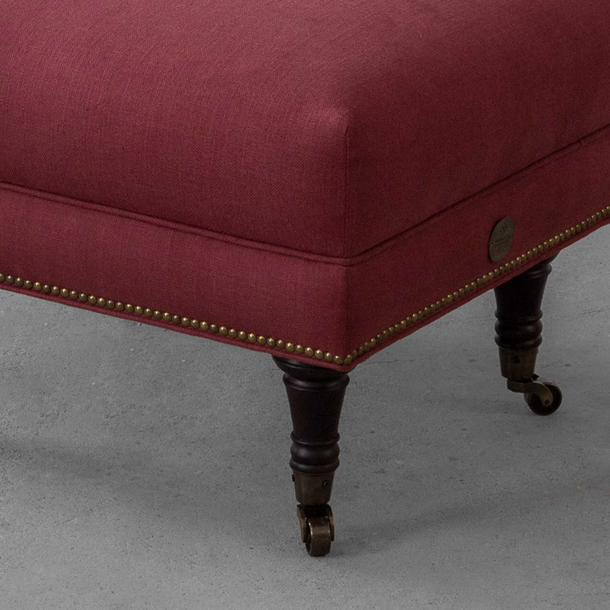 Ryan fabric ottoman features an elegant silhouette and richly finished hand turned wooden legs. Ideal for extra seating or simply kicking up your feet in front of a cozy armchair.