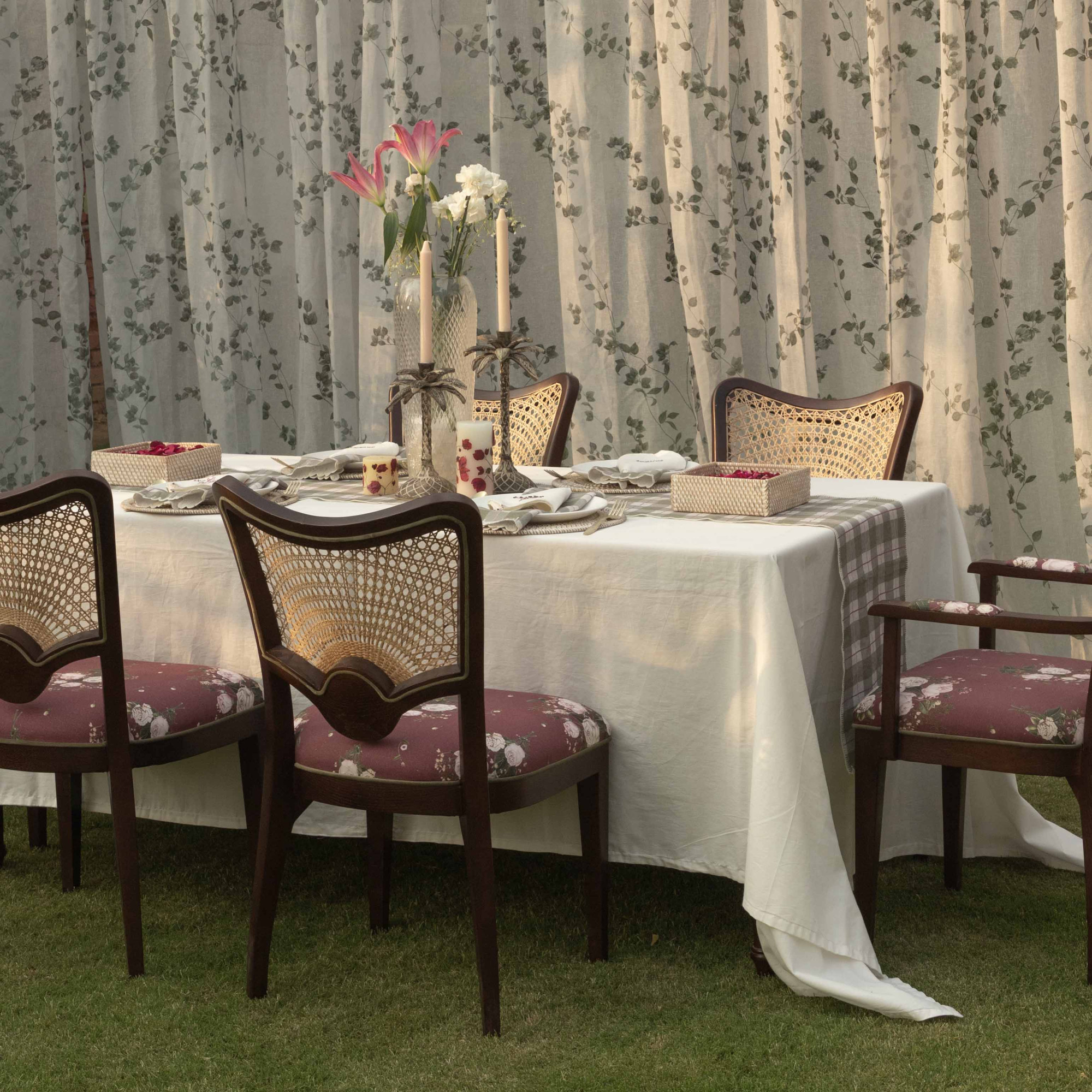 Bathed in brilliant moonlight, colorful blooms spread like an open umbrella, tall grass in the meadows, swaying leaves, chirping flocks of birds flying in a-symmetric patterns of their own. On the other side we see dancing butterflies, playing hide and seek, landing on flowers and wild cherries, wooing and flirting. Sounds of distant picnics by the stream, under the filtering rays of the sweltering sun, a perfect escape from the daily chores, laze and haze on a Summer Garden, enjoy the cooling effects of stretching on natural fabrics.