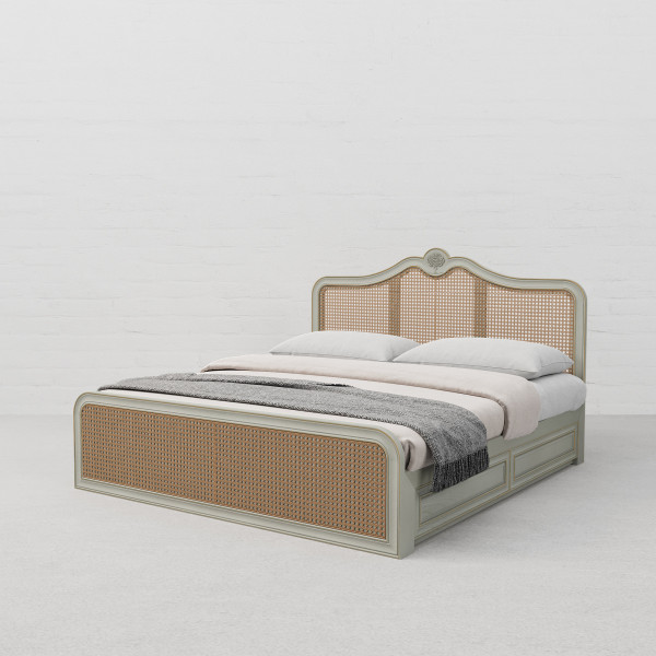 Our Summer Garden Bed Collection will chime nostalgic aromas of freshly baked cake drifting up a French Country manor, to the sun speckled rattan bed. Rustic in nature, with a hand carved summer garden tree motif on the headboard, this gorgeous bed is handmade from wood, and intricately but generously woven rattan exemplifying the pure combination of authentic charm and elegance. The pared back design simplicity brings warm tones to any colour scheme and decor theme. Combined with the (softly curved legs) and the purposeful pastoral finish, adds to the verismo of the most beautiful natural textures and materials. Create a whimsical chamber full of wistful stories.