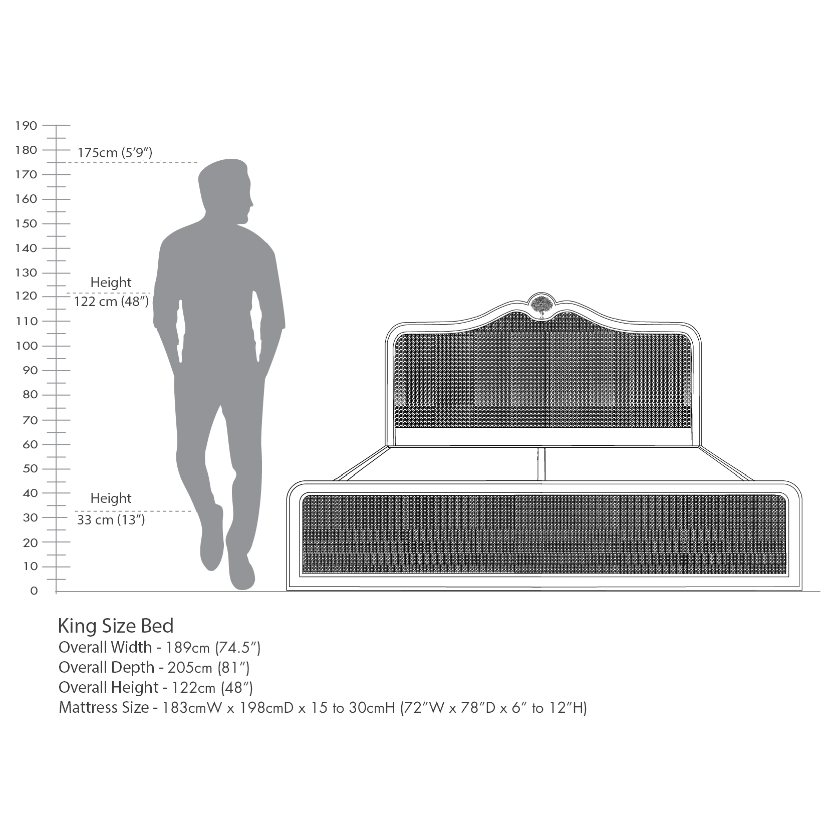 King Size Bed: 189cm W x 205cm D x 122cm H (74.5" W x 81" D x 48" H) Mattress Size: 183cm W x 198cm D (72" W x 78" D)