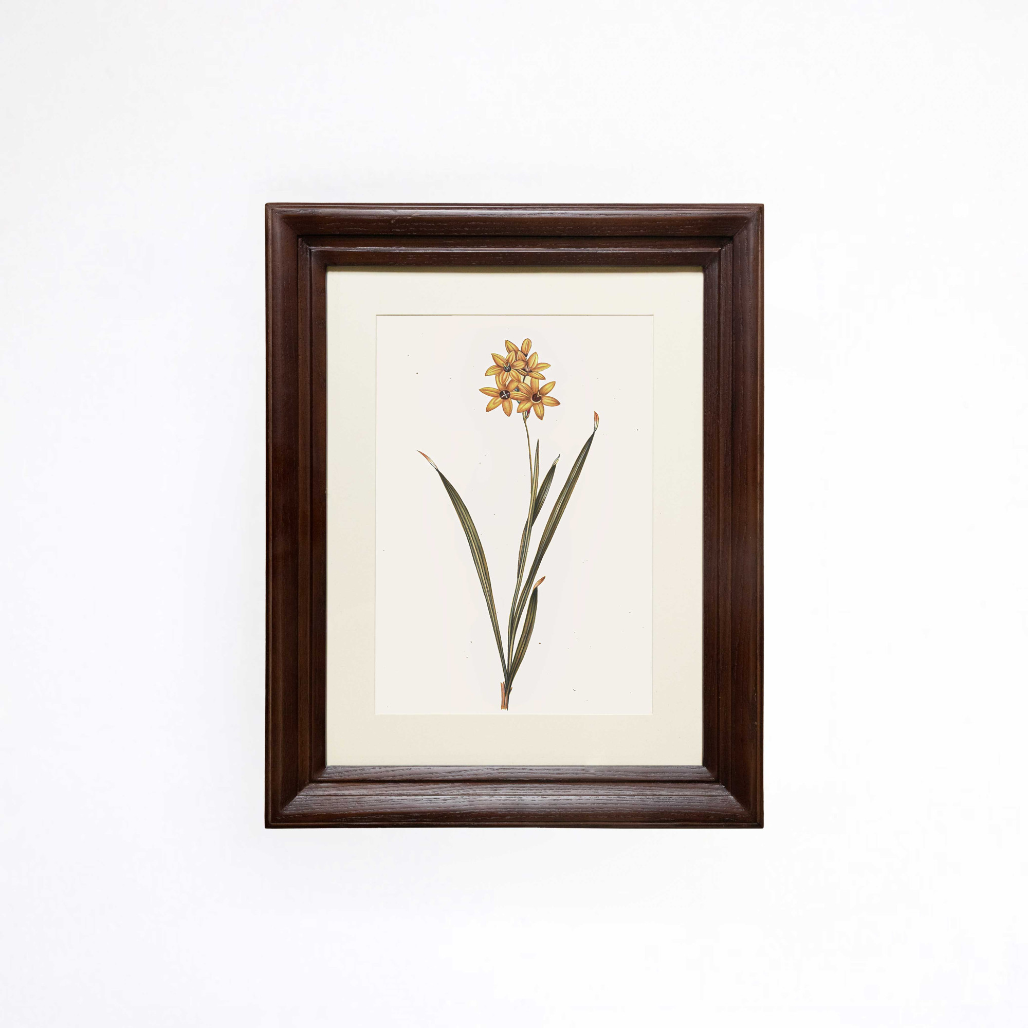 A warm-toned botanical portrait, The Ochre Corn Lily Spire Printed Artwork captures the wiry, reaching beauty of the Spotted Corn Lily. Originally hand-painted, the artwork features a slender, singular stem topped with a cluster of star-like blossoms that unfurl in a vibrant shade of golden-ochre. The composition is detailed with small, dark markings at the center of each flower and is balanced by a few narrow, blade-like leaves that rise from the base with a soft, olive-green texture. This artwork is printed on a thick, antique-style sheet, meticulously preserving the delicate linework and organic feel of the original painting. You can observe the exceptional level of detail in the fine, dark stamens at the heart of each flower and the subtle, rhythmic way the leaves curve outward from the central stalk. Finished in a classic wooden frame, the piece carries the storied charm of a vintage discovery. It brings a sophisticated verticality and a bright, sun-drenched energy to a narrow hallway, a serene reading corner, or a curated gallery wall.