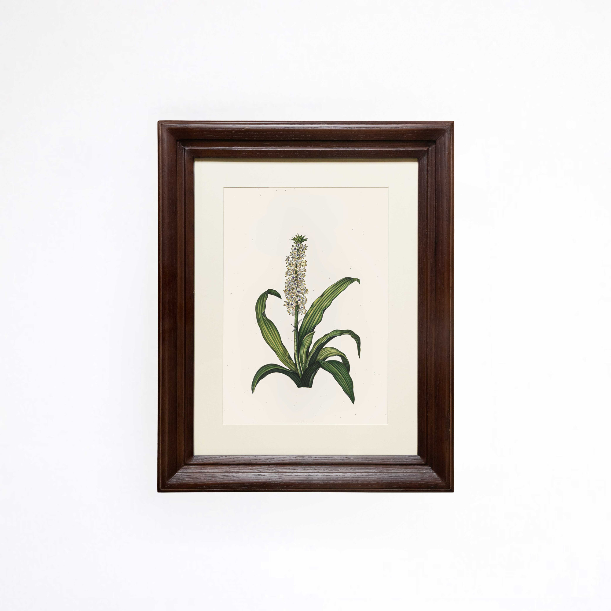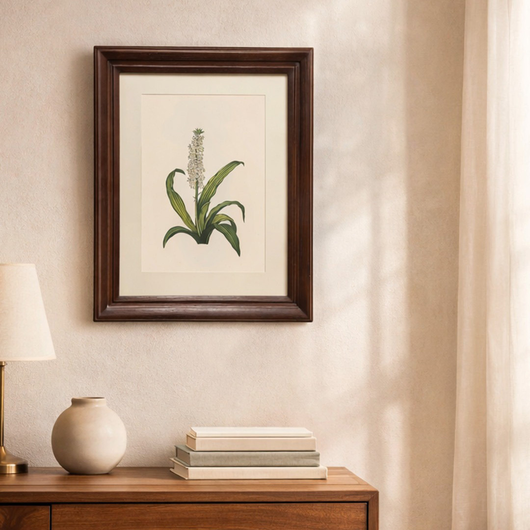 A regal botanical study, The Royal Pineapple Lily Printed Artwork captures the singular beauty of a blossoming Pineapple Lily in full, architectural glory. Originally hand-painted, this botanical piece centers on a towering raceme of star-shaped, creamy white blossoms, each detailed with delicate purple centers and golden-yellow anthers. The composition is anchored by lush, broad green leaves featuring distinctive undulated edges and subtle speckling along the base of the sturdy central stem. Printed in high quality on a sturdy, antique-style sheet, the artwork preserves the texture and character of the original painting. Every intricate petal and fine vein is rendered with remarkable precision, honoring the traditional naturalist style. Enclosed in a classic wooden frame, the piece carries the timeless charm of a vintage botanical illustration. It serves as a sophisticated addition to nature-inspired interiors, serene reading corners, or curated gallery walls.