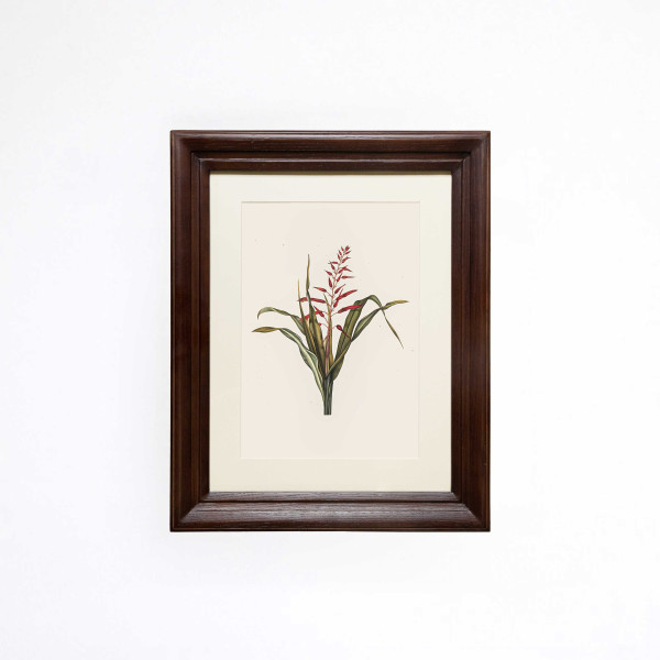 A vibrant floral portrait, The Scarlet Spire Printed Artwork captures the slender, upward grace of a flowering bromeliad in warm, earthy tones. Originally hand-painted, the artwork features a central, towering raceme of tubular scarlet buds that taper toward a fine point at the crown. The composition is grounded by long, blade-like leaves in a mix of olive and sage green, each showing a natural, weathered texture and elegant outward curves. This artwork is printed on a sturdy, antique-style sheet, keeping the natural texture and feel of the original painting. Every fine detail, from the delicate branching of the central stem to the subtle yellow highlights on the opening petals, is captured with clean precision. Finished in a classic wooden frame, the piece has the look and feel of a vintage discovery. It brings a grounded, tropical warmth and a sense of vertical height to a sunlit entryway, a cozy breakfast nook, or a refined living space.