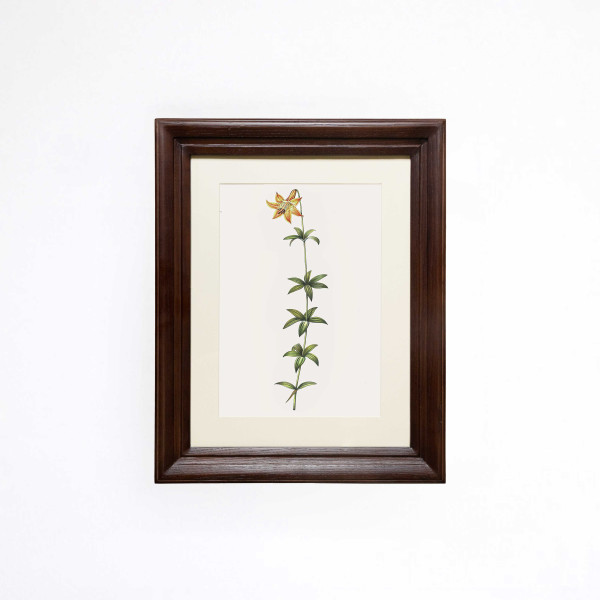 An elegant floral portrait, The Spotted Meadow Bell Printed Artwork captures the slender, reaching beauty of a wild meadow lily in warm amber tones. Originally hand-painted, the artwork features a solitary, star-shaped bloom at the crown of a tall, thin stem, its petals showing a beautiful gradient from golden-yellow to a rich, sun-kissed orange. The composition is detailed with intricate dark speckles across the inner petals and is balanced by whorls of pointed green leaves that grow in rhythmic tiers along the length of the stalk. This artwork is printed on a thick, antique-style sheet, meticulously preserving the natural texture and quiet character of the original painting. You can see the exceptional level of detail in the fine, hairlike filaments of the central anthers and the delicate, translucent quality of the petals as they curve outward. Enclosed in a classic wooden frame, the piece carries the storied charm of a vintage naturalist discovery. It brings a sophisticated verticality and a bright, meadow-inspired energy to a narrow hallway, a serene reading corner, or a curated gallery wall.