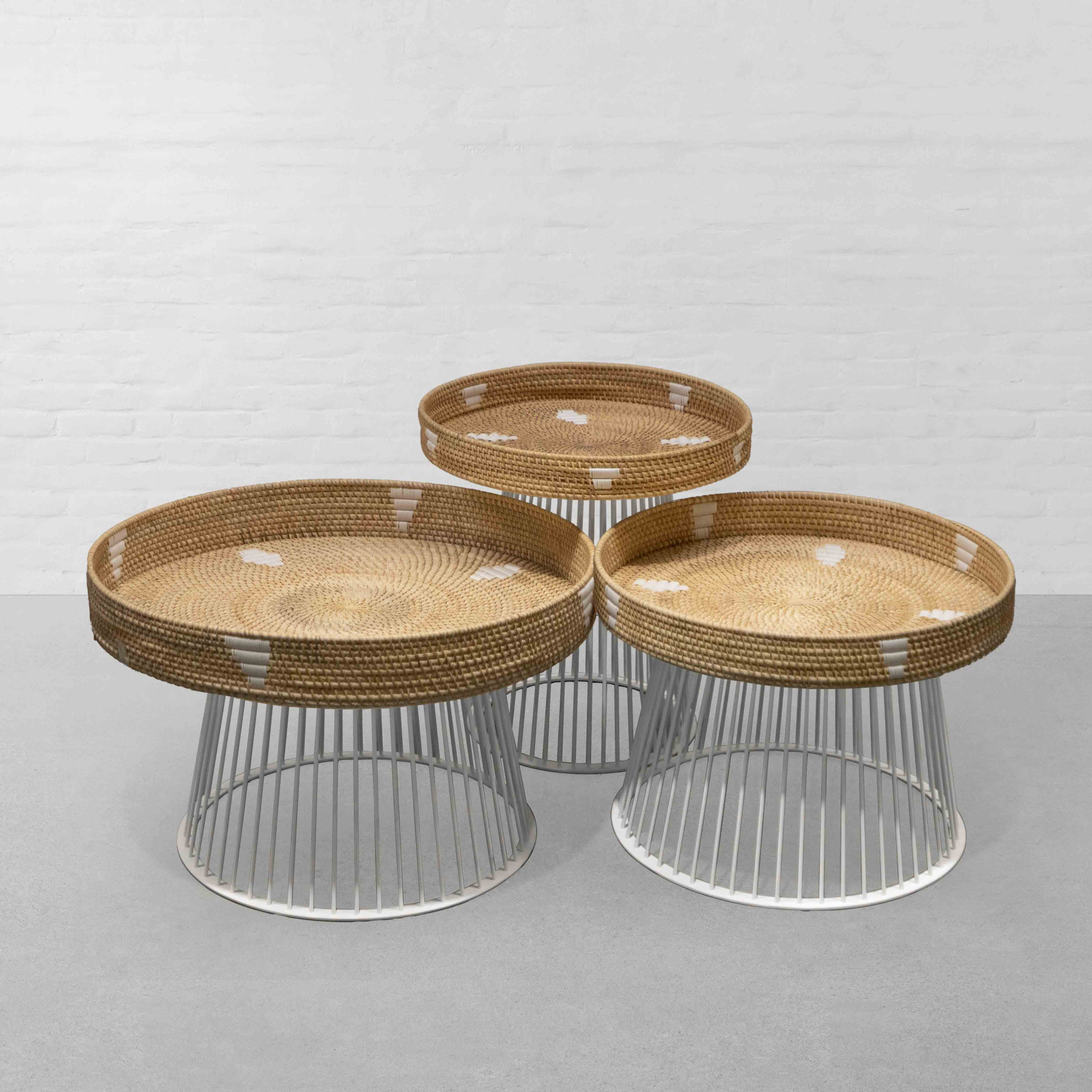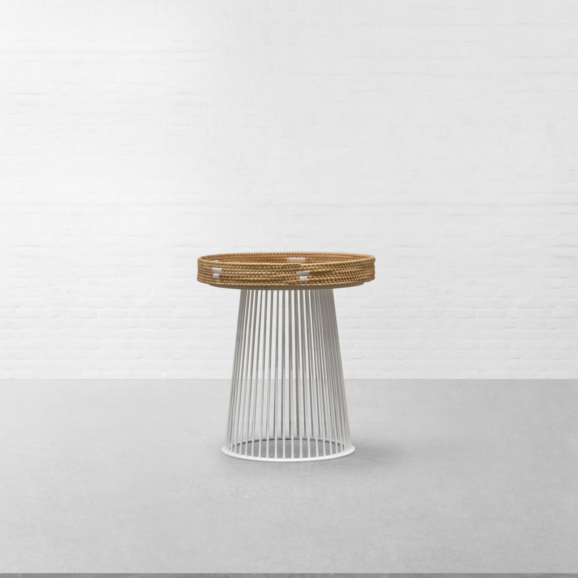 Handwoven with care using natural rattan and cane, our Toba Handwoven Coffee Table - Natural & White (White Base) piece brings the ease of Indonesian craftsmanship into everyday living. The weave is tight and detailed, highlighted with subtle white diamond motifs in synthetic rattan that add a clean, contemporary character. Its lightweight metal base keeps the form open and versatile, making it effortless to place anywhere, whether used as coffee tables, side tables, or decorative display stands, this set adds a warm, organic element to contemporary interiors. The blend of handwoven craftsmanship and clean metal lines allows it to transition effortlessly between modern, coastal, and earthy home styles.