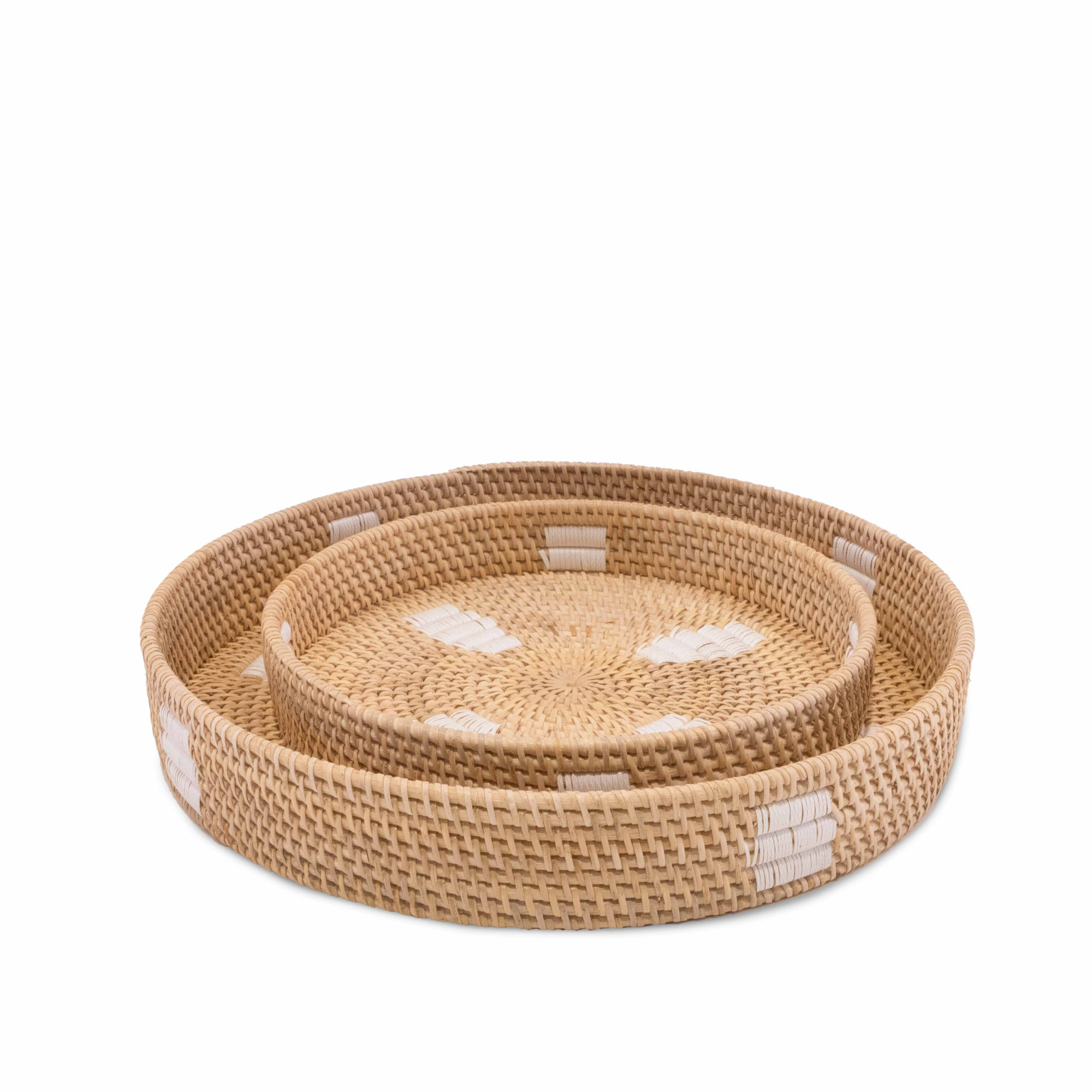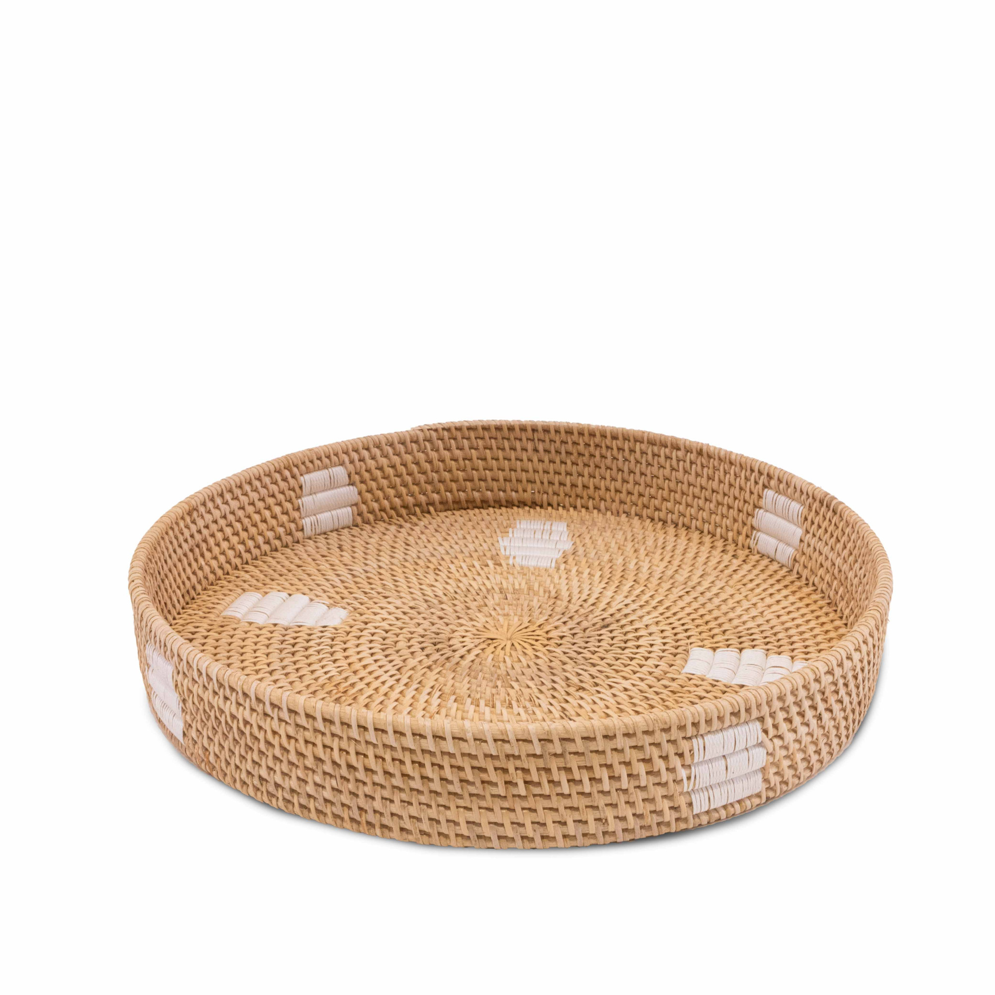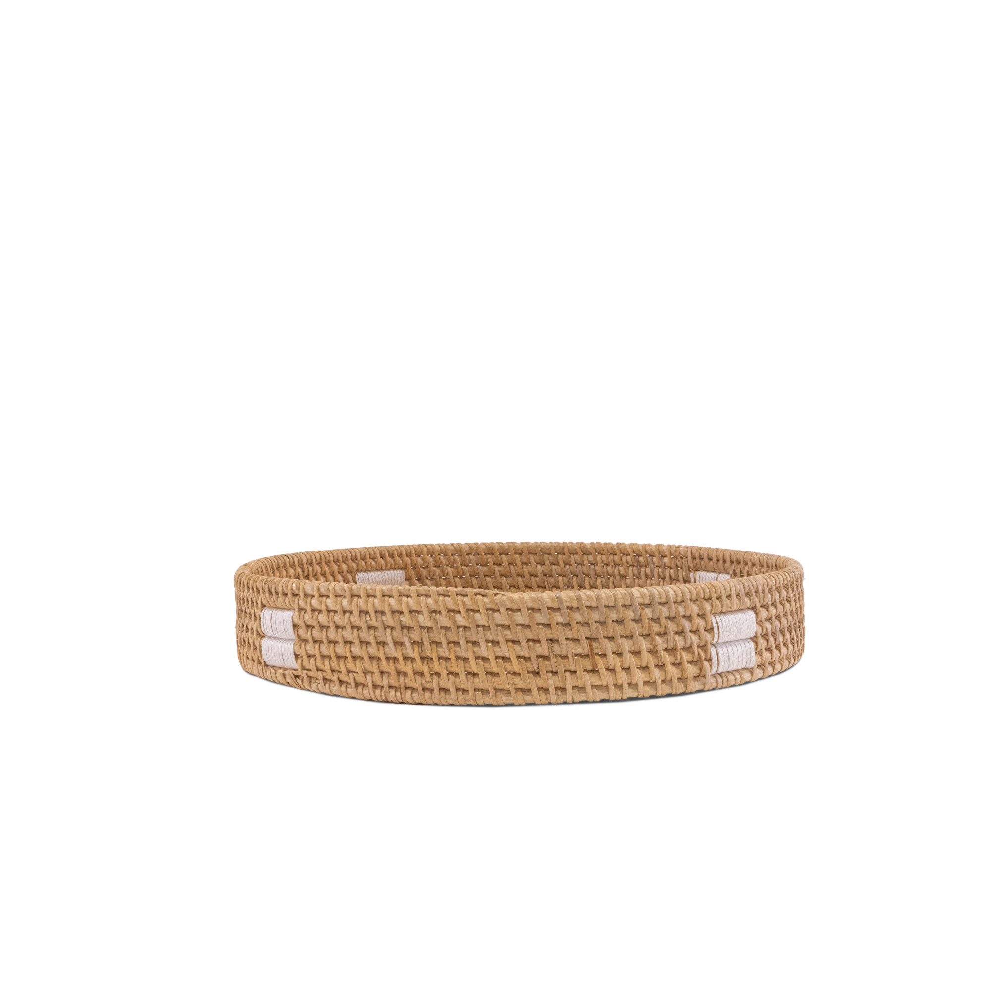 Handwoven with care using natural rattan and cane, our Toba Handwoven Tray brings the ease of Indonesian craftsmanship into everyday living. The weave is tight and detailed, accented with subtle white diamond motifs in synthetic rattan that lend a fresh, contemporary touch. Designed with a shallow, open form and raised edges, the tray is easy to carry and beautifully functional, perfect for serving, curating a coffee-table vignette, organising consoles, or styling bedside essentials. Its natural texture instantly softens modern spaces, while the clean patterning keeps the look refined and versatile.