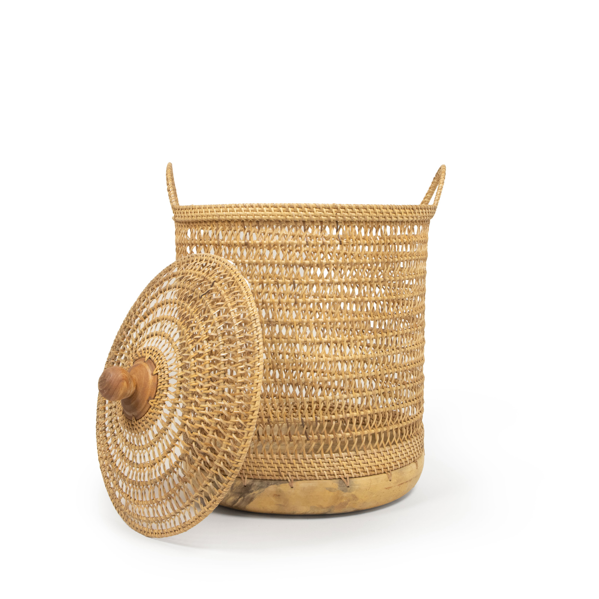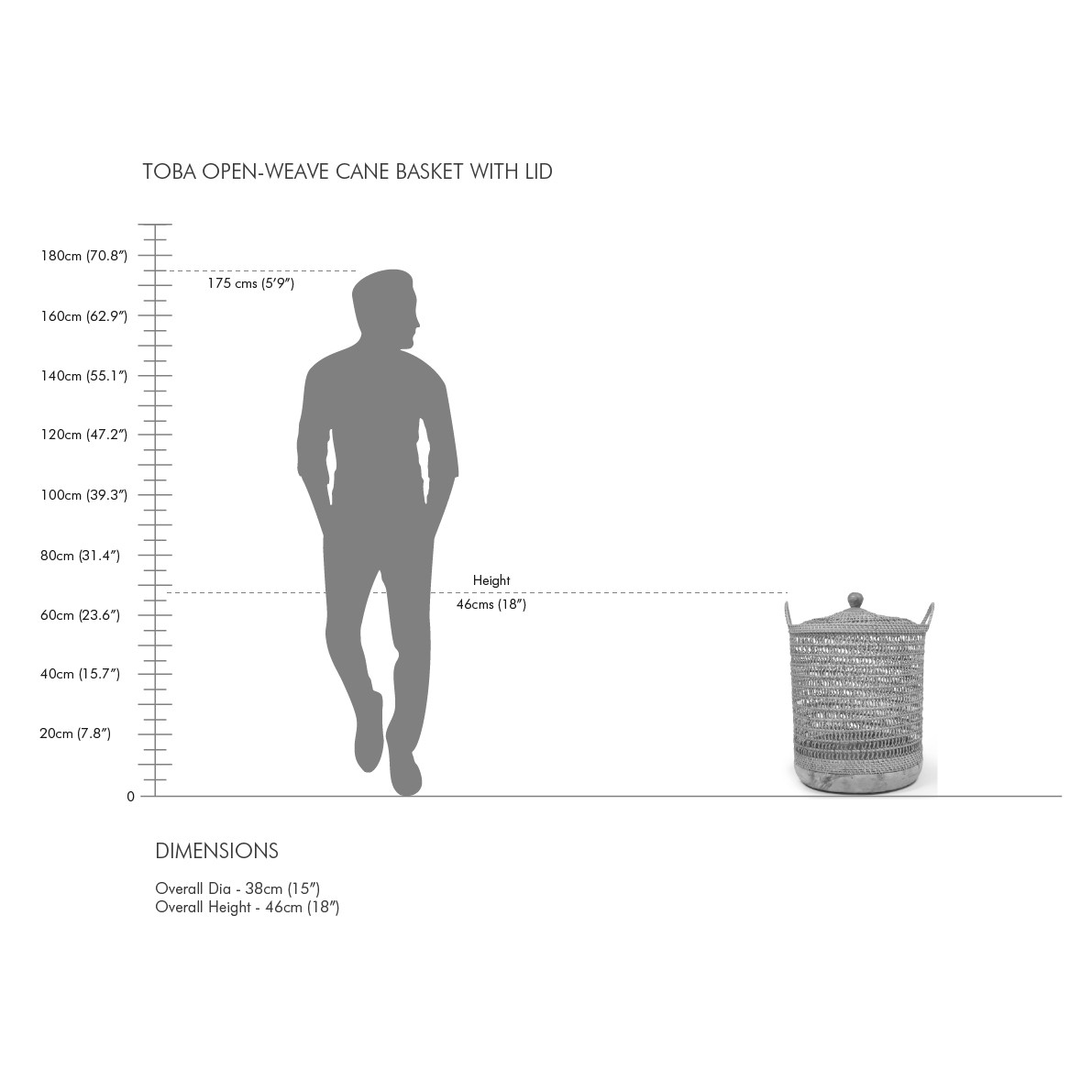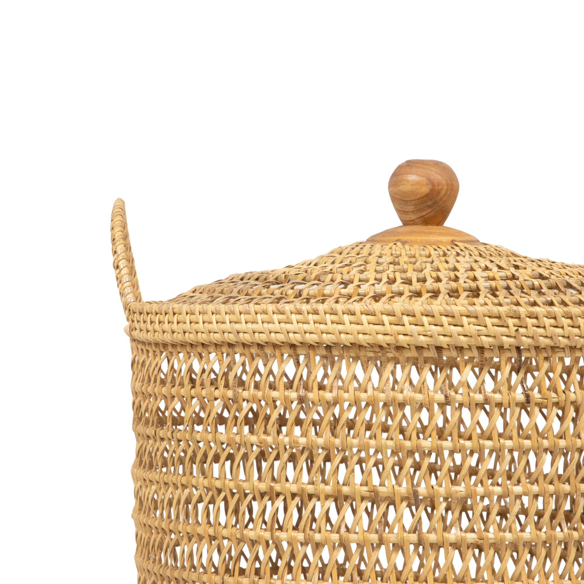 Airy, natural, and beautifully tactile, our Toba Open-Weave Cane Basket with Lid captures the effortless elegance of handwoven design. Crafted from durable rattan and cane, this basket features an intricate open-weave pattern that adds visual texture while keeping it lightweight and breathable. The smooth wooden base provides sturdy support, and the matching lid with a rounded knob completes the design with a refined touch. With its sculptural silhouette and subtle sheen of natural cane, this piece blends traditional weaving artistry with contemporary form. The integrated handles make it easy to move around, perfect for storing throws, toys, laundry, or even as a decorative accent in living spaces. Rooted in craftsmanship and nature, this basket brings a sense of grounded warmth and artisanal charm to any interior.