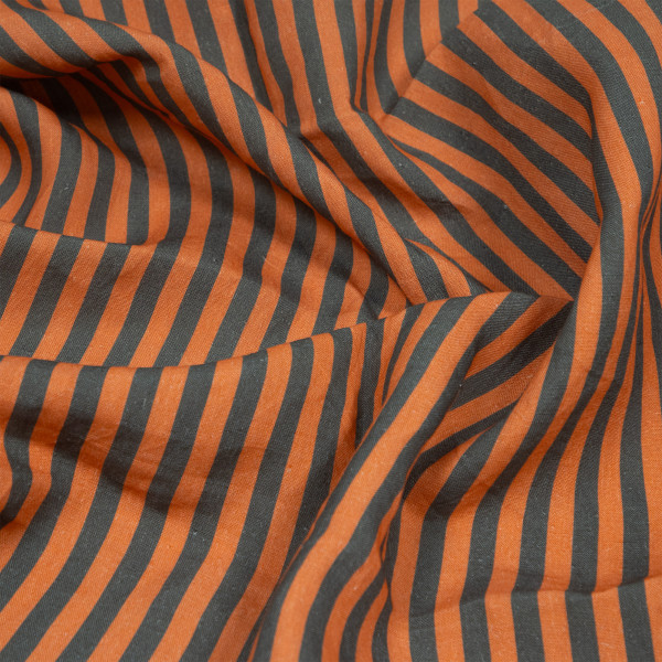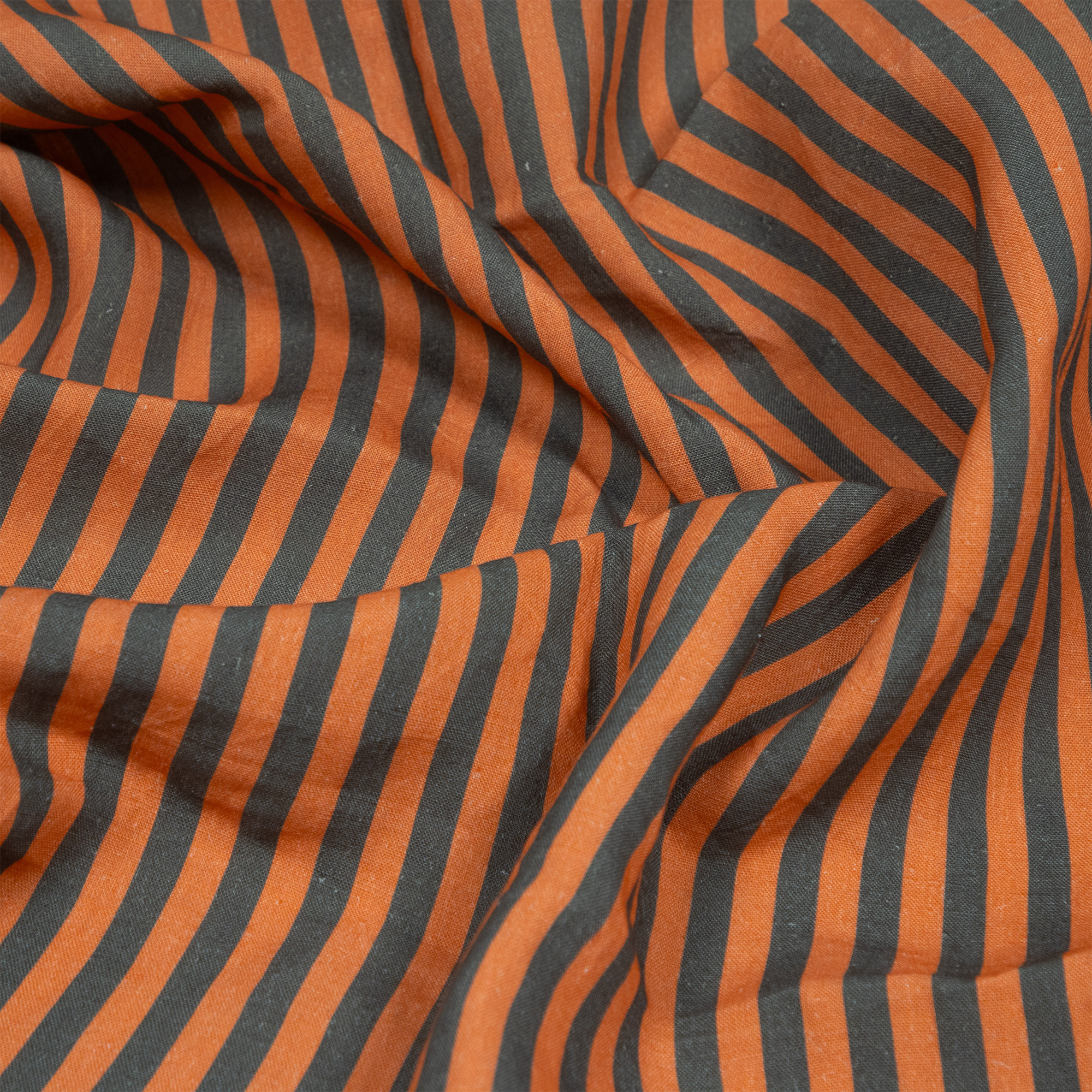 Introducing the Marigold Stripe, a timeless fabric that brings the warmth of the season into your home. This elegant design features a bold contrast of rich orange, reminiscent of a blooming marigold, and a sophisticated charcoal gray. The vertical stripes add a sense of height and rhythm, making it an ideal choice for upholstered products like accent chairs, ottomans, or even a statement headboard where the pattern can truly shine. Its versatile color palette allows for seamless pairing and styling with a variety of decor. Complement it with natural wood tones for a rustic look, or contrast it with sleek metals for a modern feel.