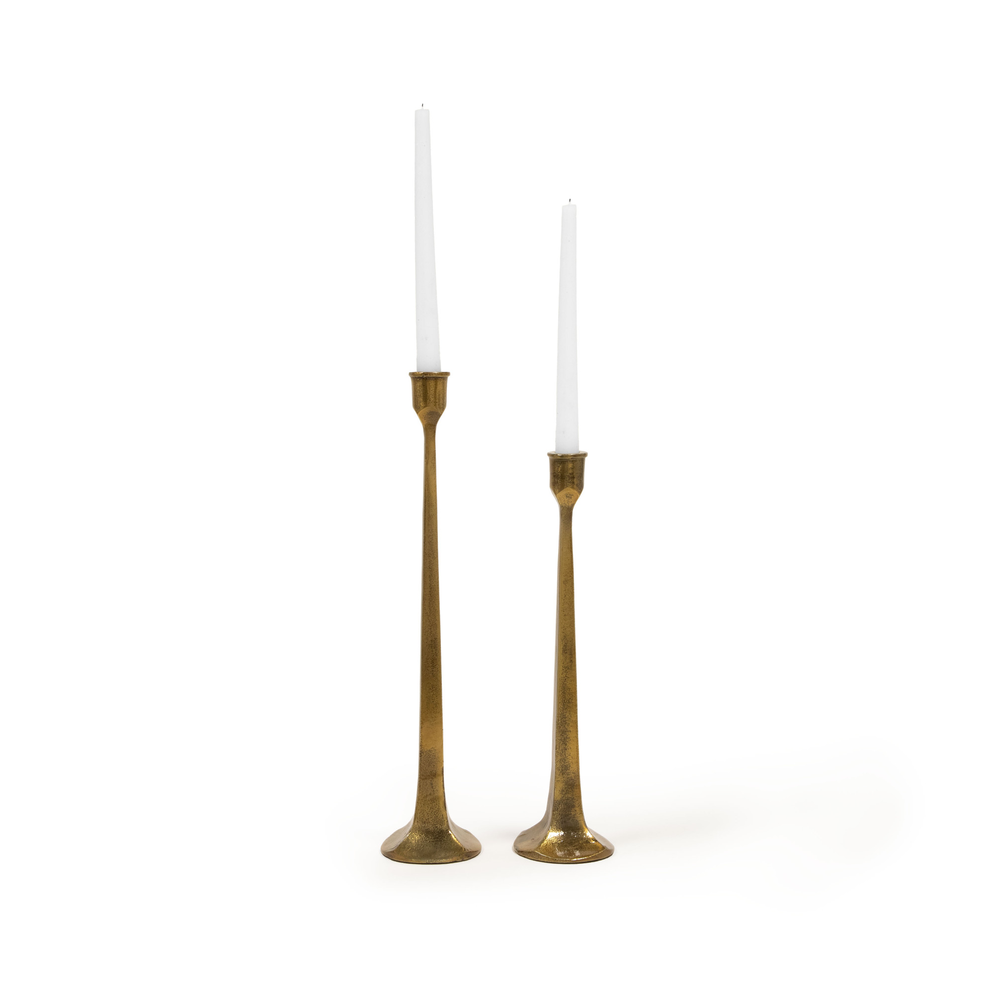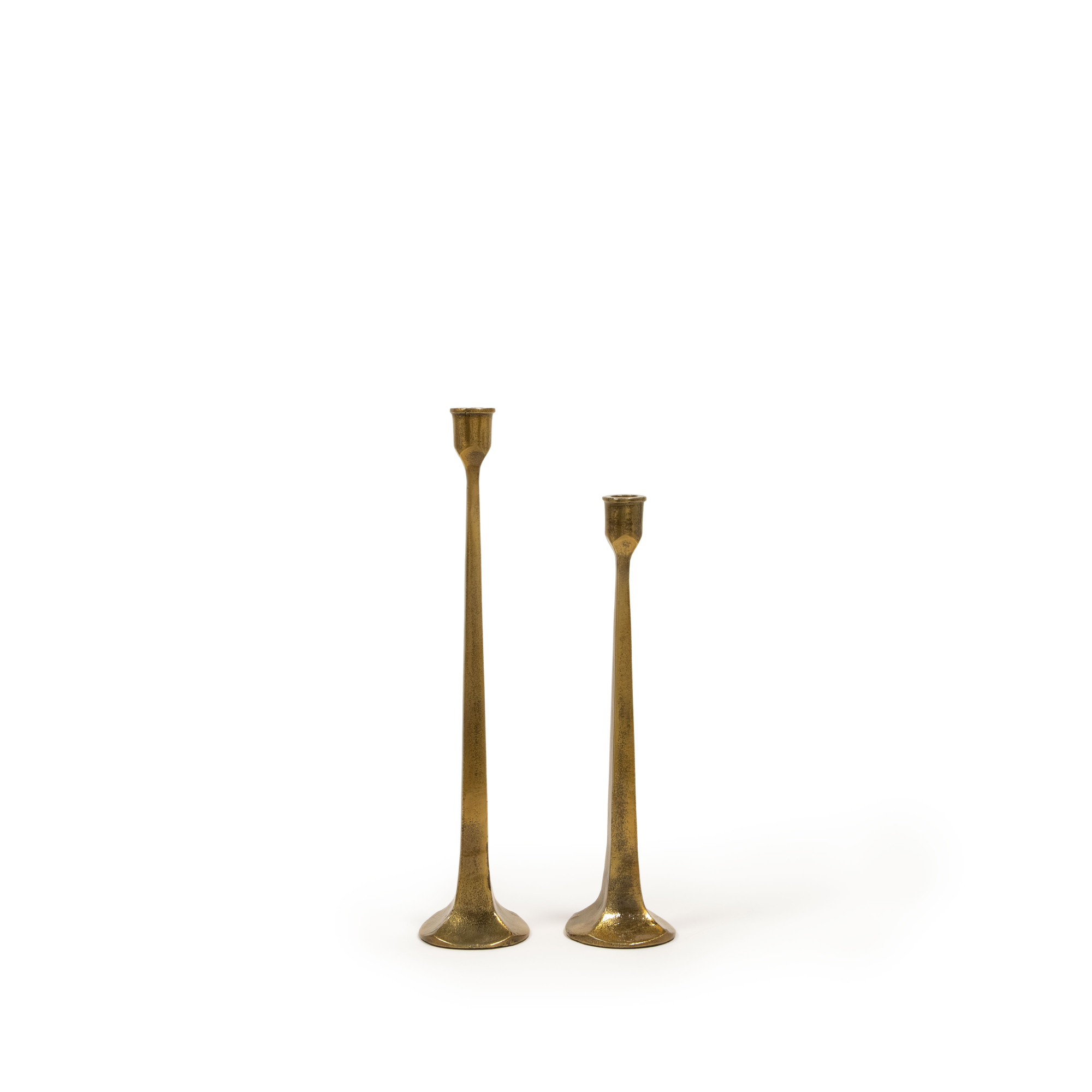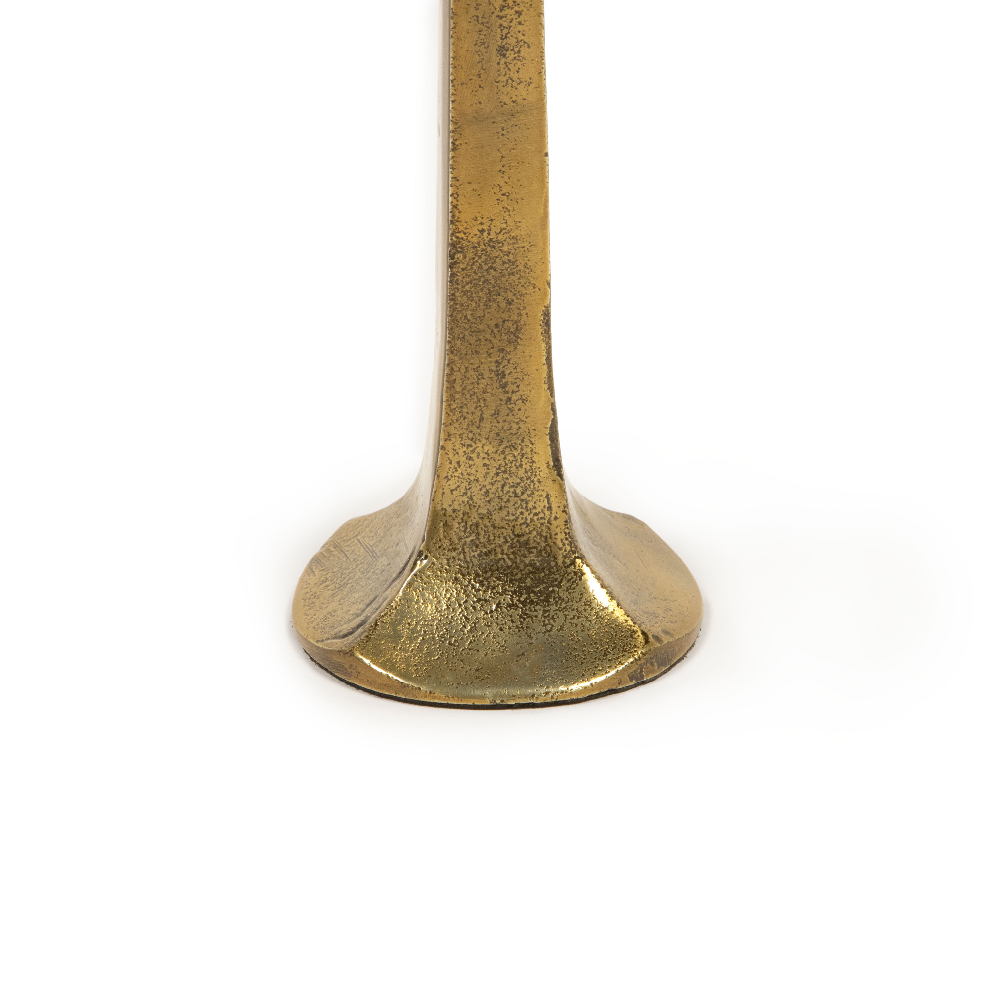 Cast in aluminium with a rich brass finish, our Venetia Brass Candlestand exudes understated vintage charm. Its tall, slender silhouette and gently aged surface evoke the quiet allure of antique finds, pieces that feel storied yet effortless. There’s a sense of timeworn beauty in its uneven patina and artisanal texture, giving each piece its own distinct character. The design embraces simplicity, allowing the warm gleam of brass to take centre stage, making it a timeless accent for both modern and traditional settings. Style it in pairs for a dramatic tablescape, or let it stand alone on a console or mantel for a hint of sculptural grace. Whether placed beside a vase of fresh blooms, layered with books, or used as part of an intimate dining setup, this candle stick adds a sense of calm sophistication.