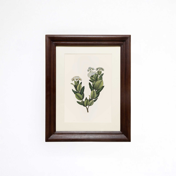 A graceful floral piece, our White Ixora Study Printed Artwork captures the dense, pillowy beauty of small star-like blooms in crisp ivory tones. Originally hand-painted, the artwork features two curved woody stems topped with tight clusters of small four-petaled flowers and delicate green buds. The composition is anchored by thick, oval-shaped leaves in varying shades of forest and lime green, each rendered with clear, natural veining. This artwork is printed on a thick, antique-style sheet, keeping the natural texture and feel of the original painting. Every fine detail, from the slender yellowish stamens to the smooth, waxy surface of the foliage, is captured with clean precision. Finished in a classic wooden frame, the piece has the look and feel of a vintage find. It brings a clean, organic element and a sense of quiet sophistication to a sunlit home office or a cozy reading nook.